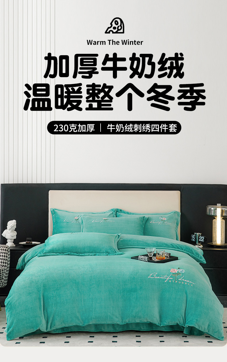 当前位置: 91家纺网 > 商品网购 > 床品套件 > 四件套 > 牛奶绒四件套 > 新款230克肌理纹绣花牛奶绒四件套可定做 肌理纹绣花-绿色