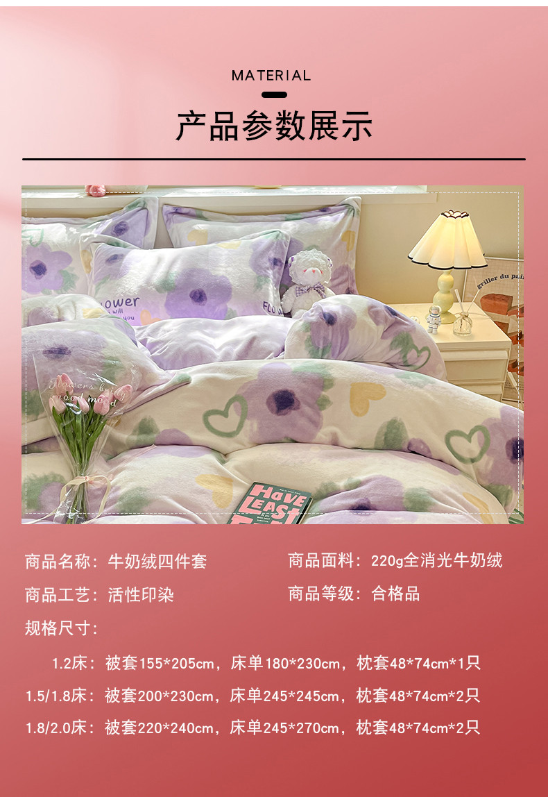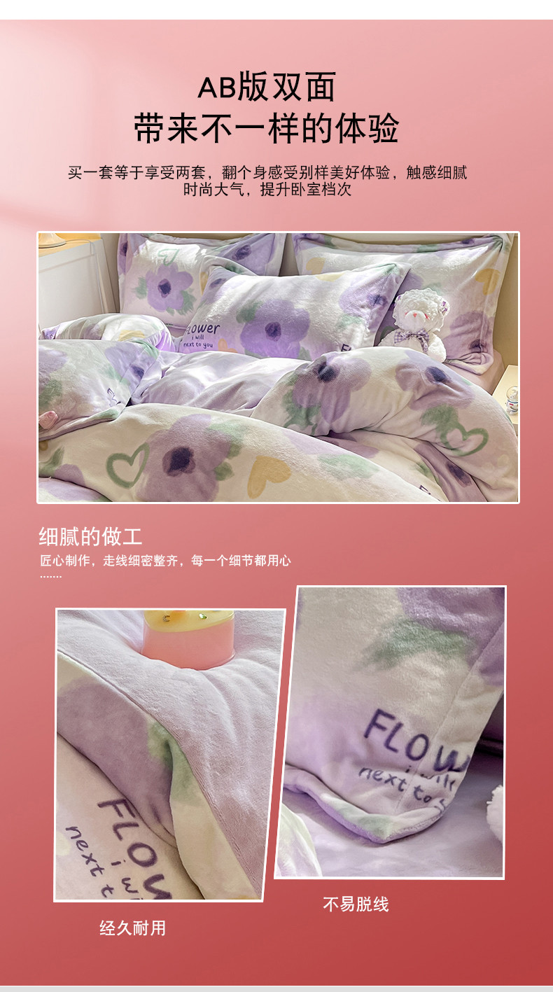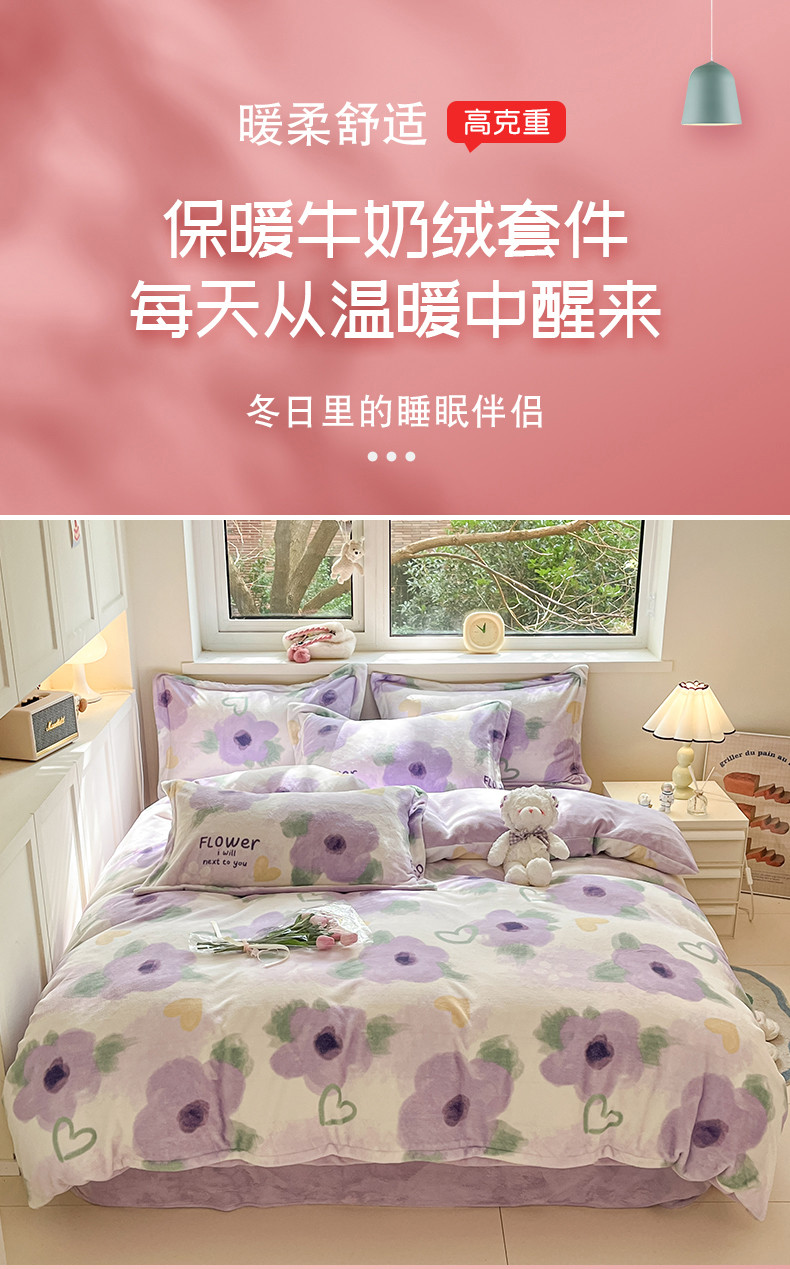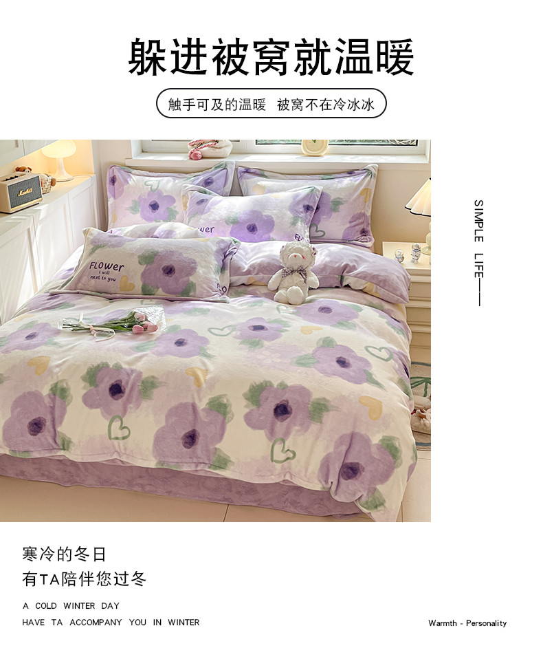 商品名称:金丝鸟家纺 2023新款220g全消光印花款牛奶绒四件套 知音 紫
