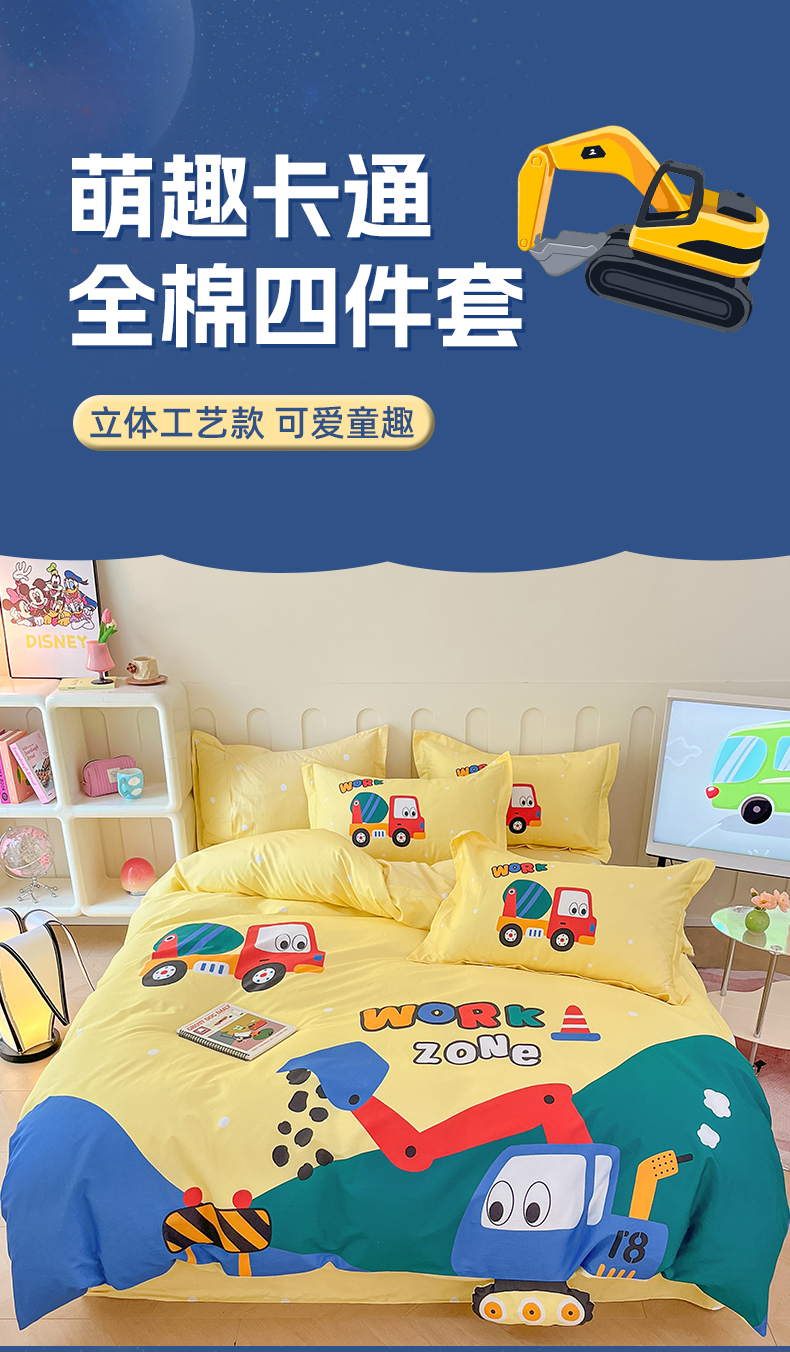 孩子王家纺 2023新款全棉卡通学生活性印花大版工艺款四件套 挖掘机