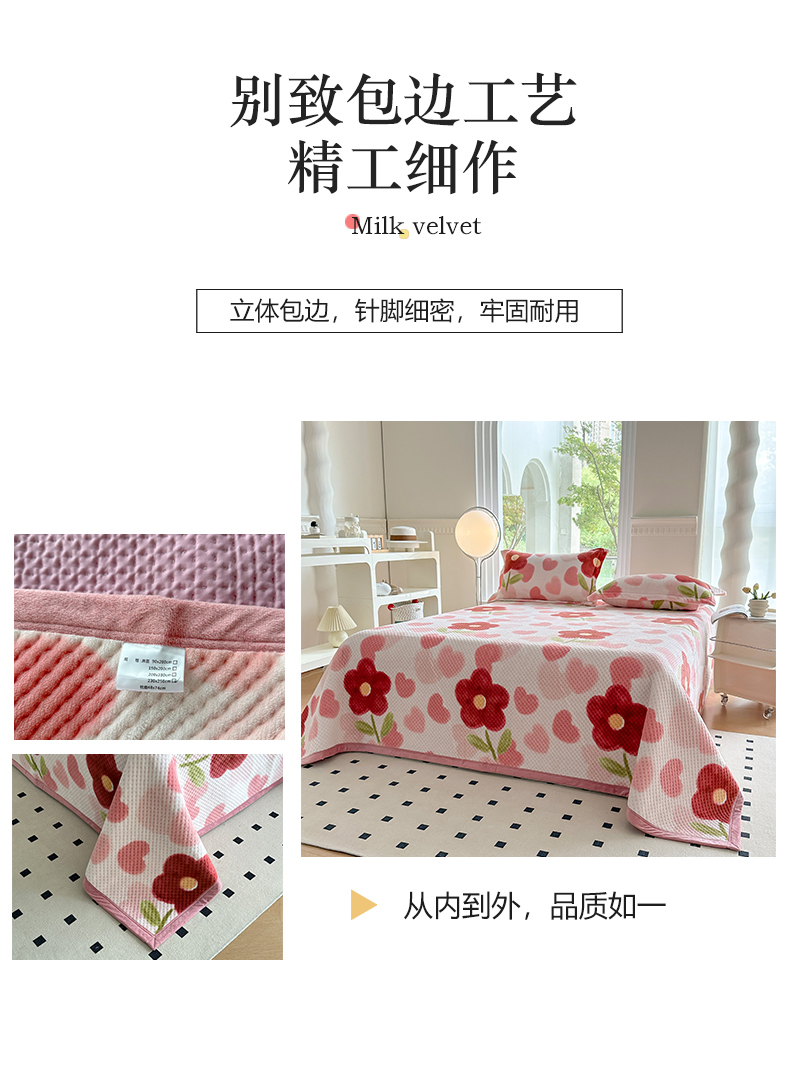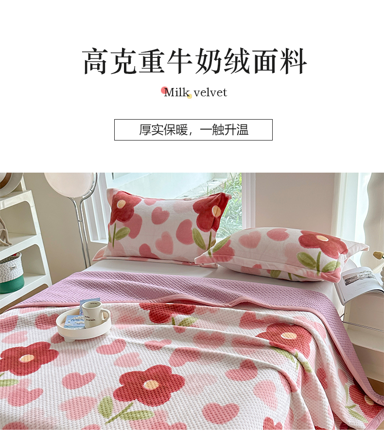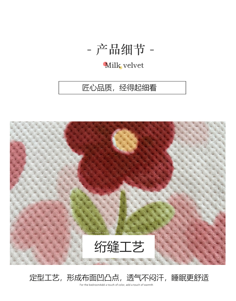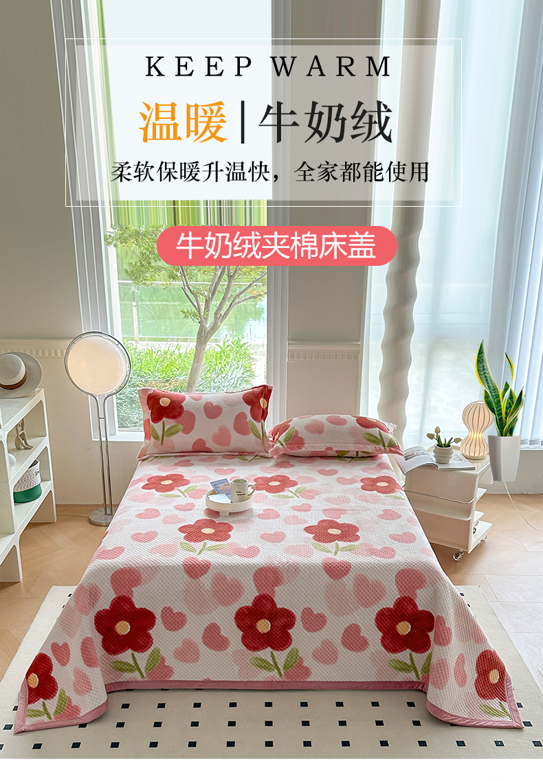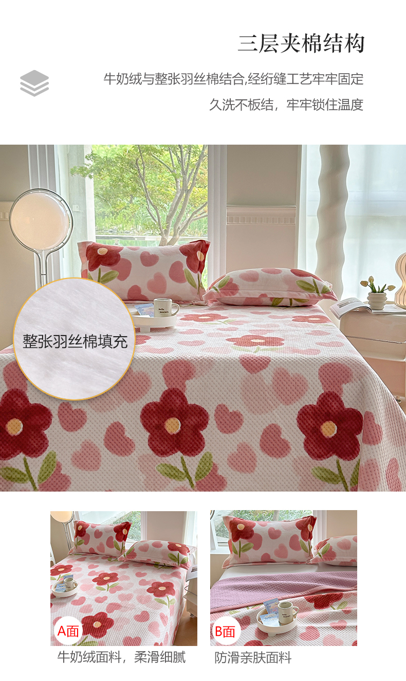 • 91家纺网 家纺一手货源 找家纺 胜权 2024款高克重牛奶绒夹棉单床盖单件保暖床盖三件套 浅浅花香