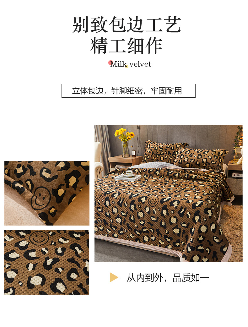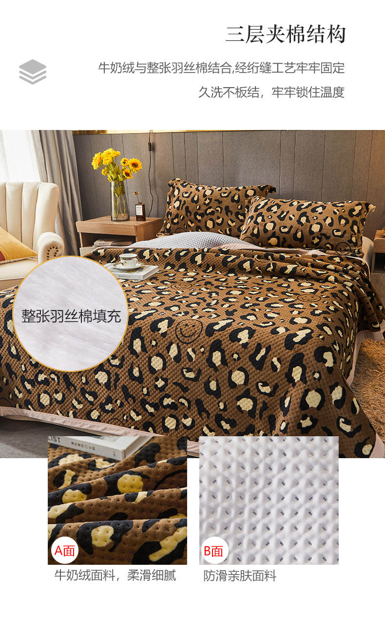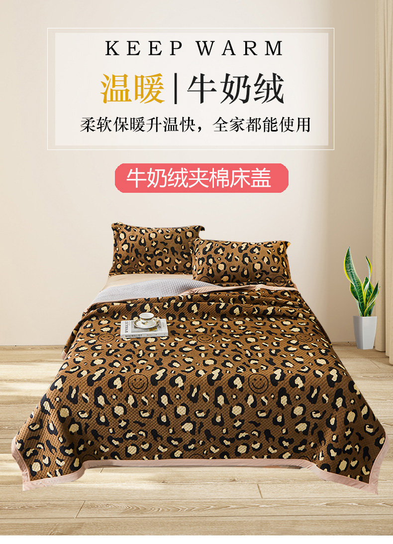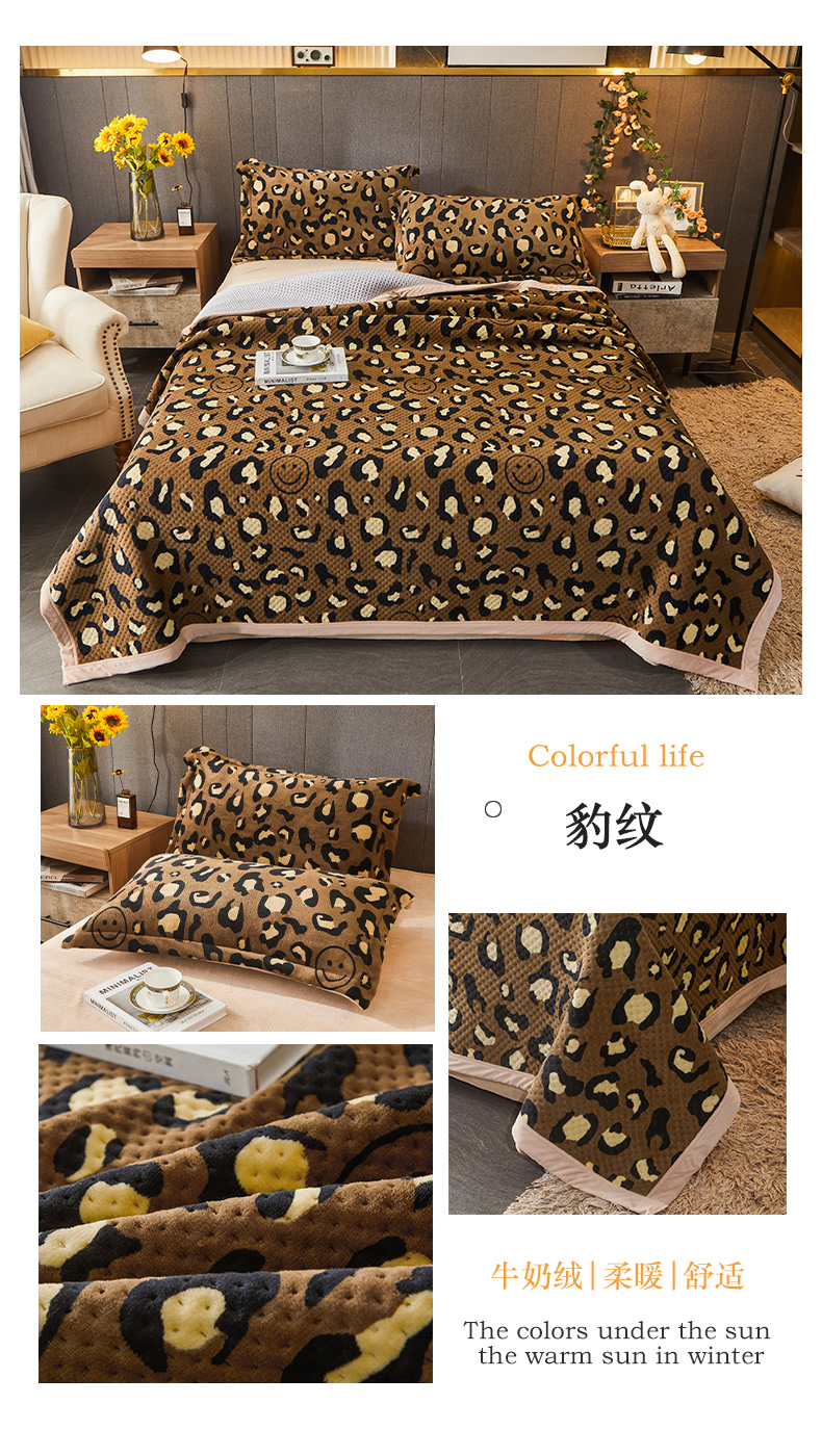 • 91家纺网 家纺一手货源 找家纺 胜权 2024款高克重牛奶绒夹棉单床盖单件保暖床盖三件套 豹纹