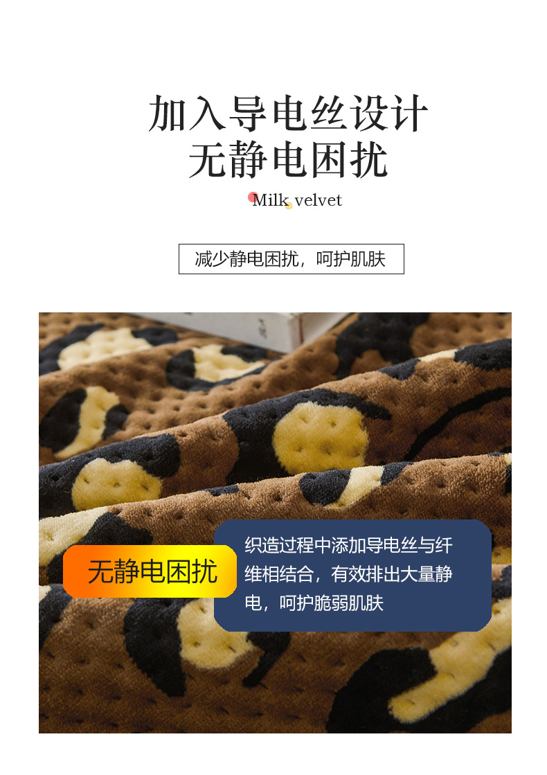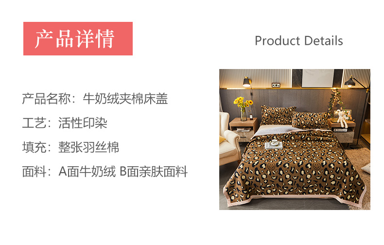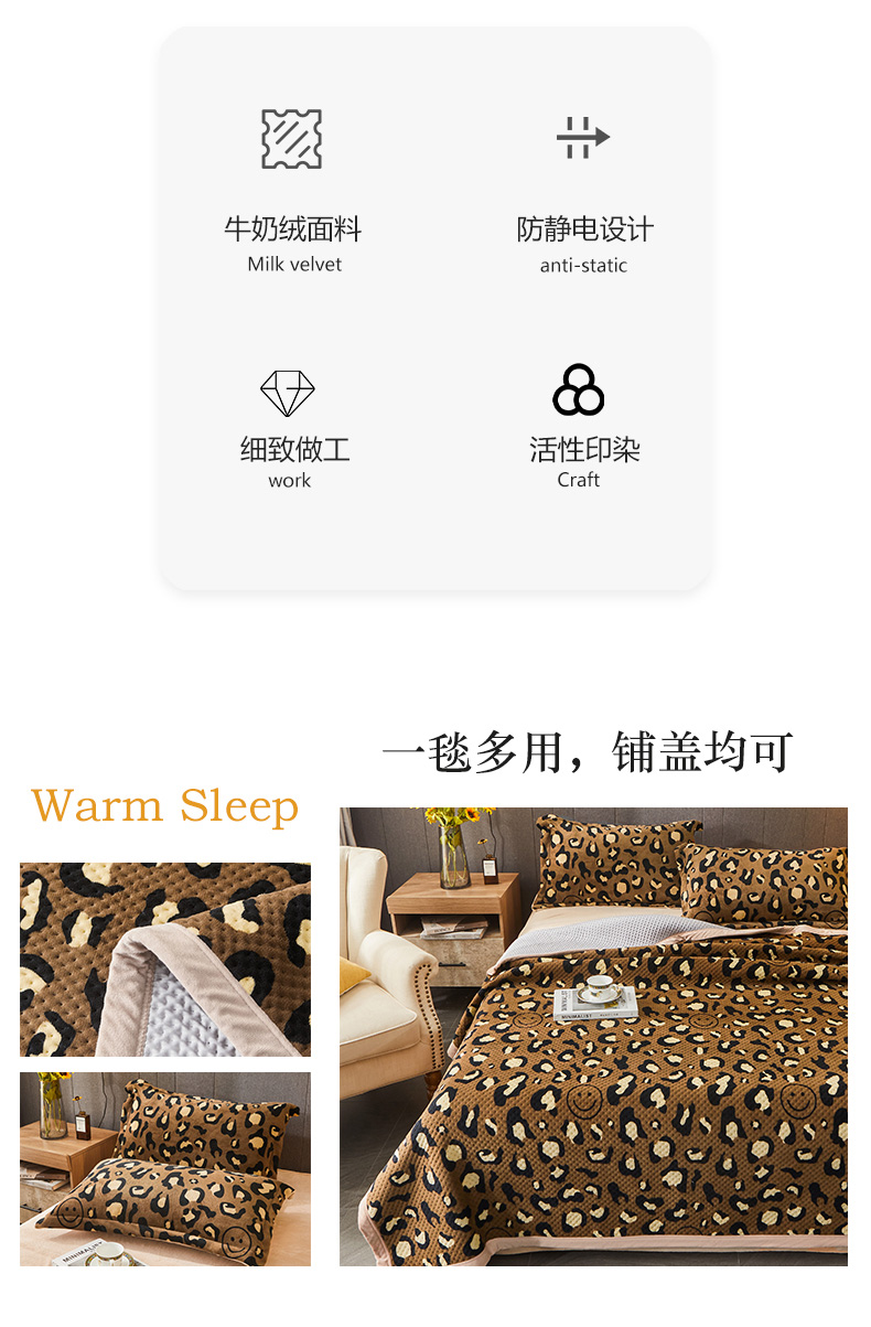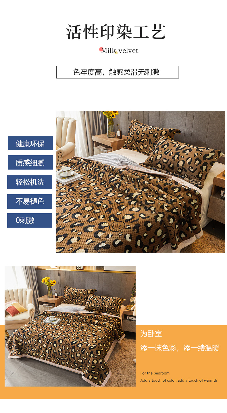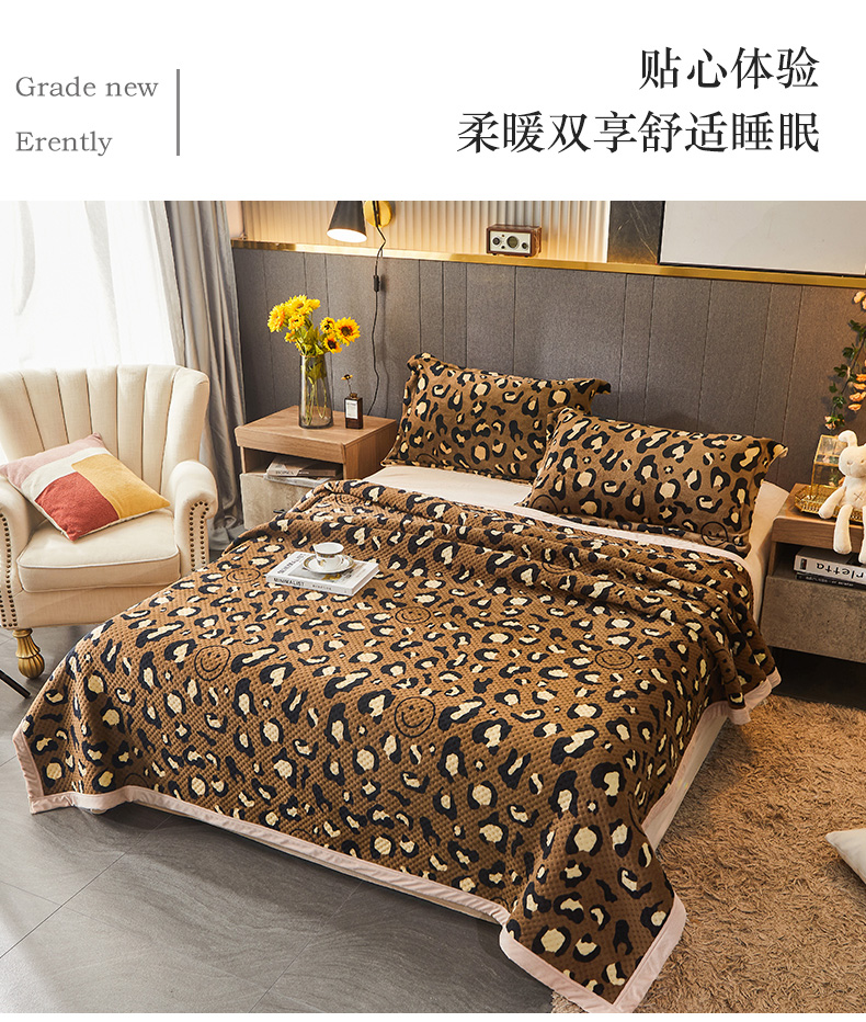 • 91家纺网 家纺一手货源 找家纺 胜权 2024款高克重牛奶绒夹棉单床盖单件保暖床盖三件套 豹纹