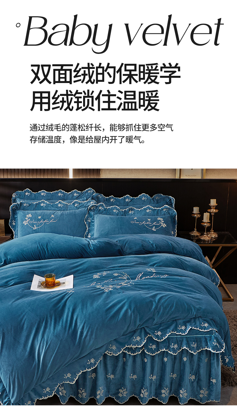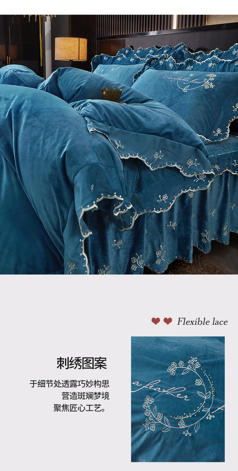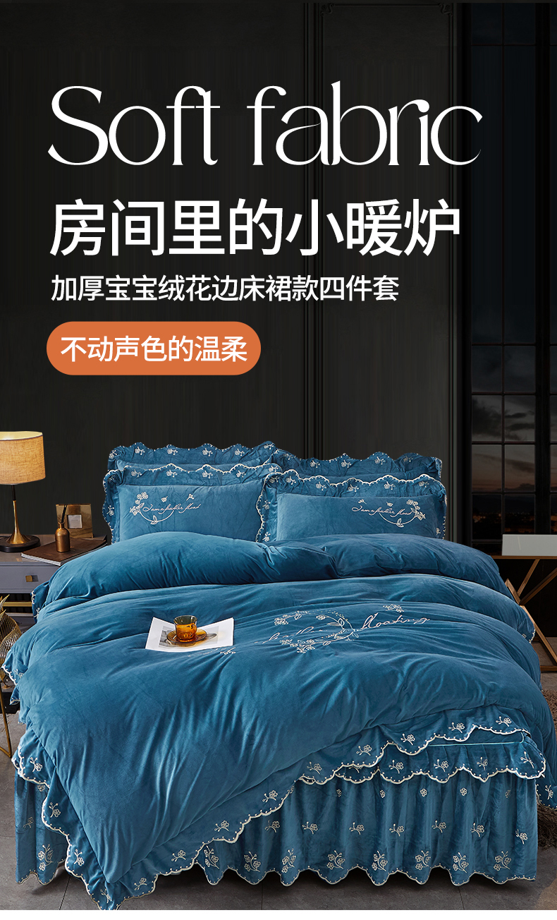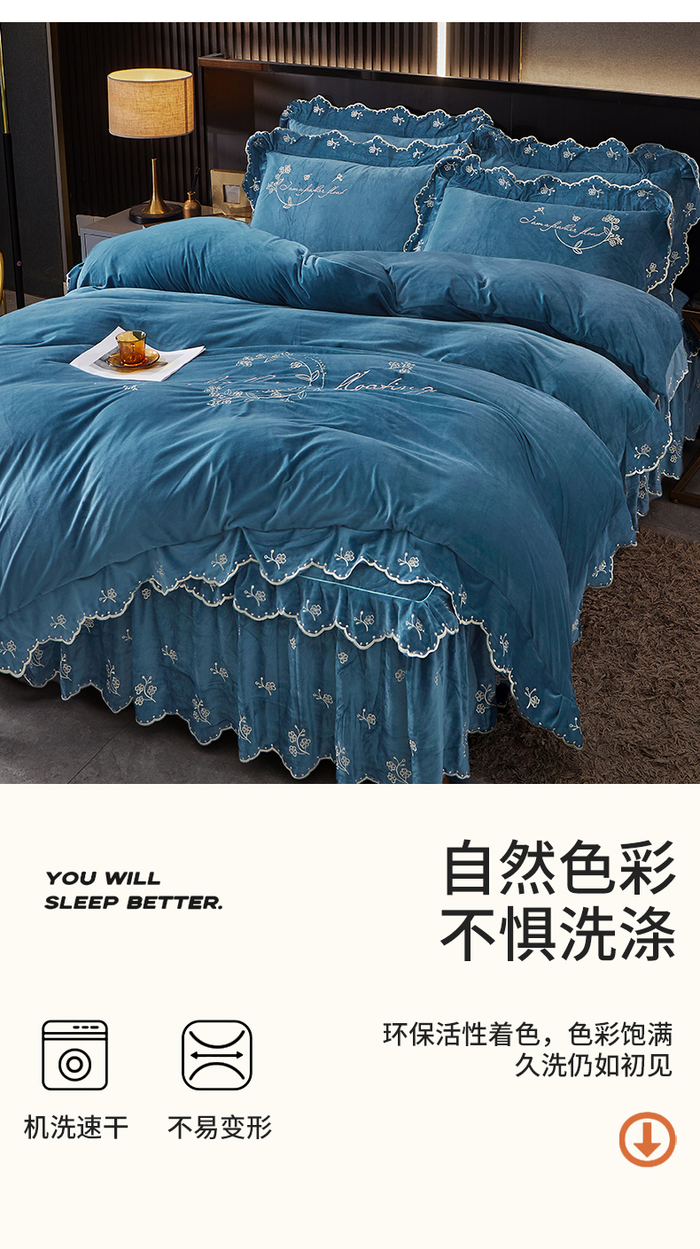 当前位置: 91家纺网 > 商品网购 > 床品套件 > 四件套 > 宝宝绒四件套 > 2023 恒爱家纺 花好月圆宝宝绒床裙四件套 宝利蓝