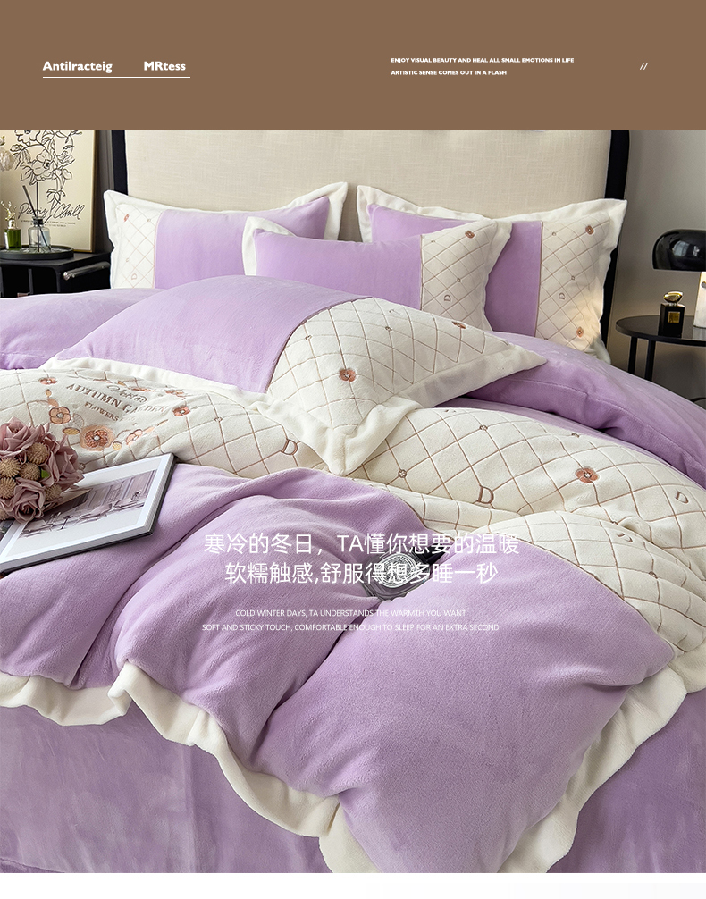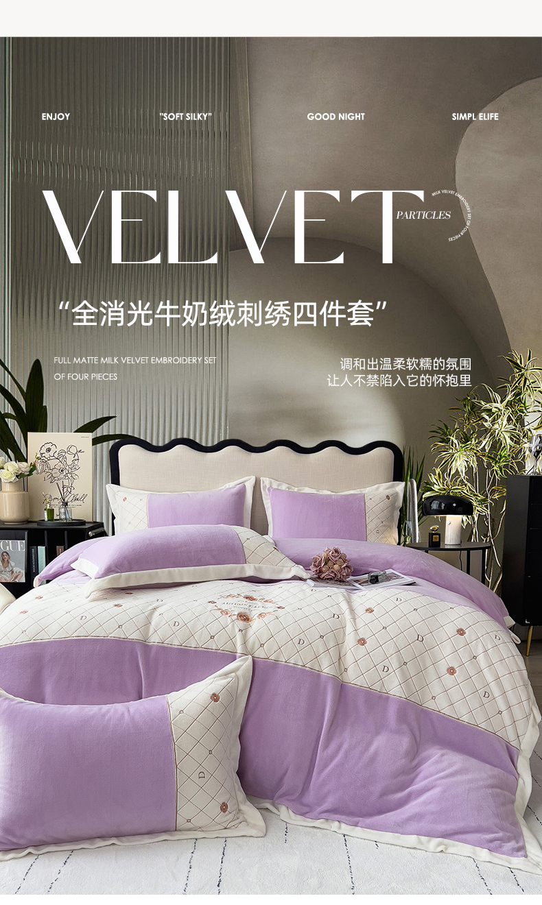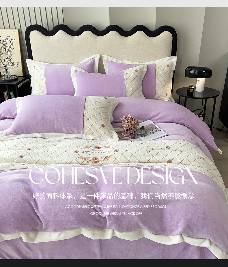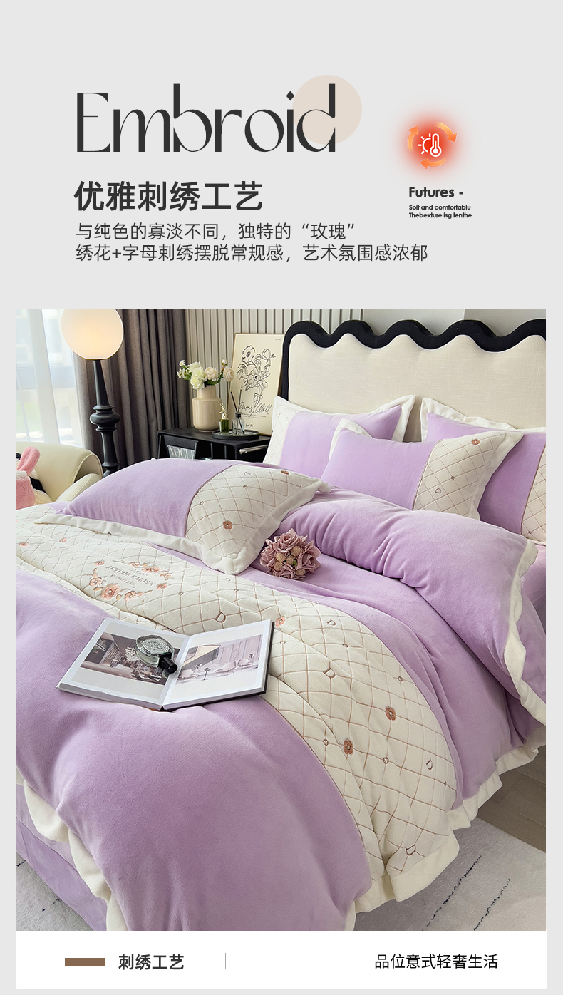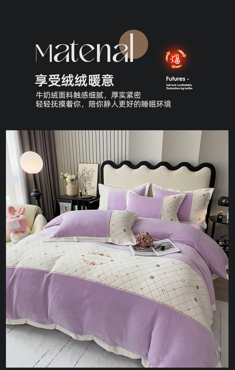 绒世界 2024秋冬高端刺绣菲曼牛奶绒四件套 菲曼-丁香紫