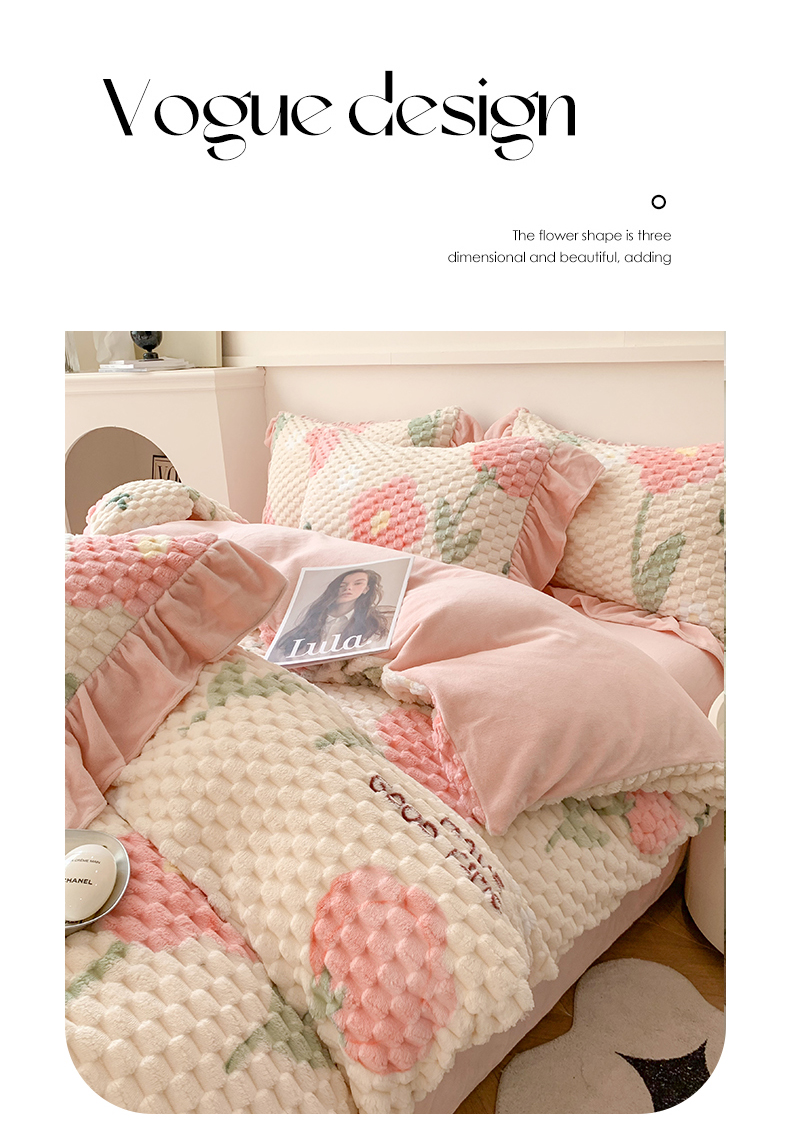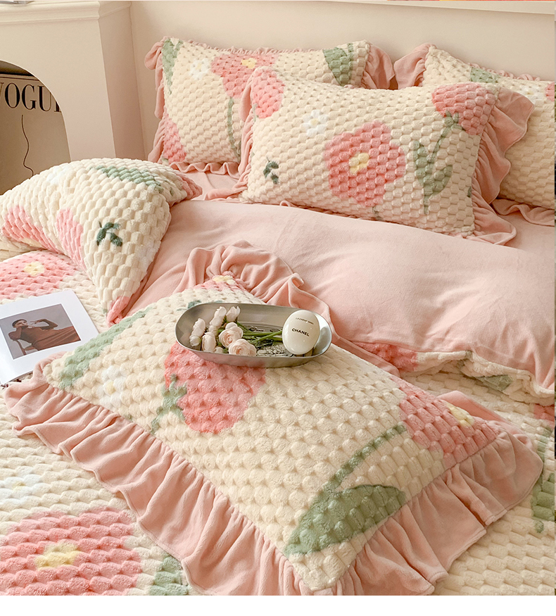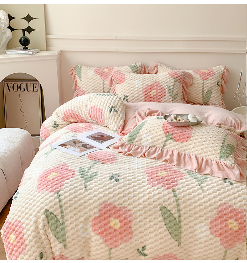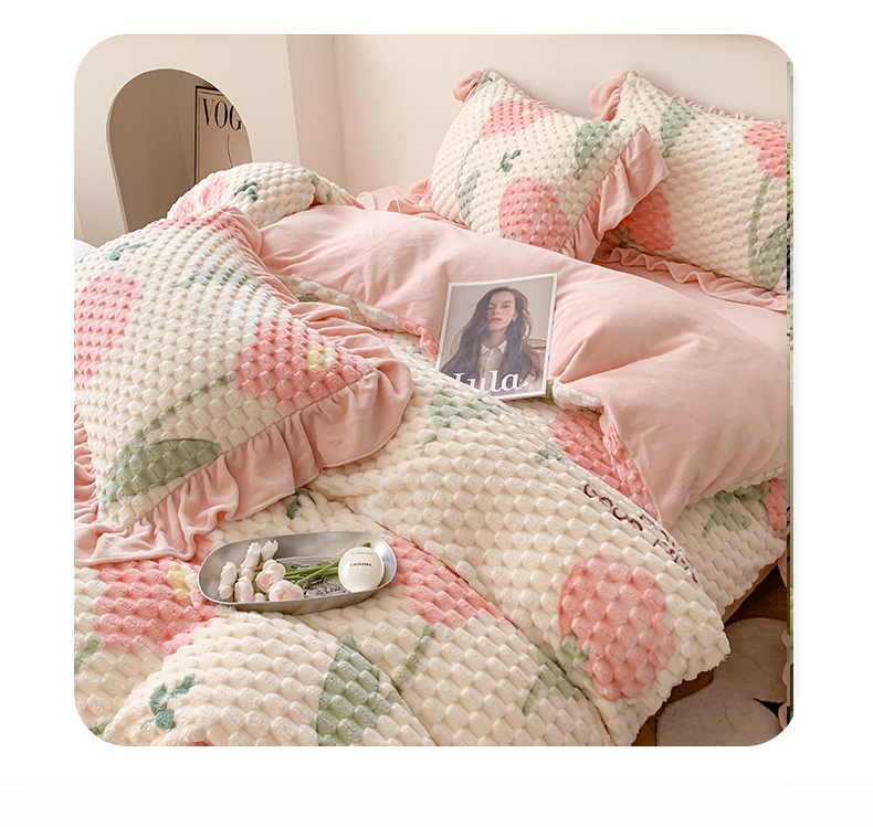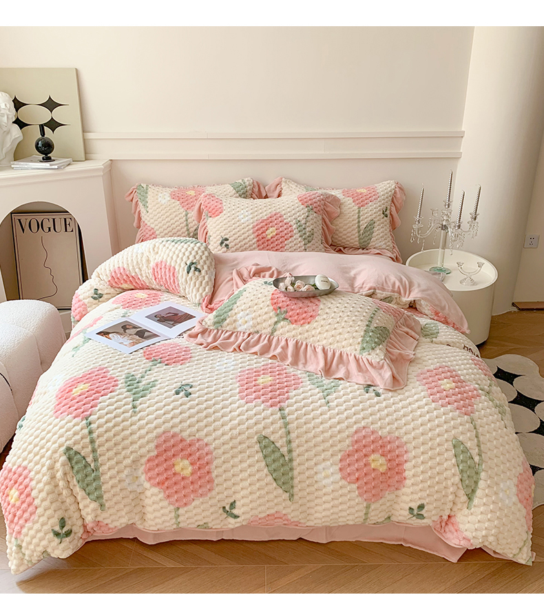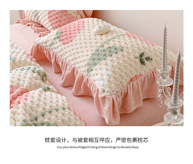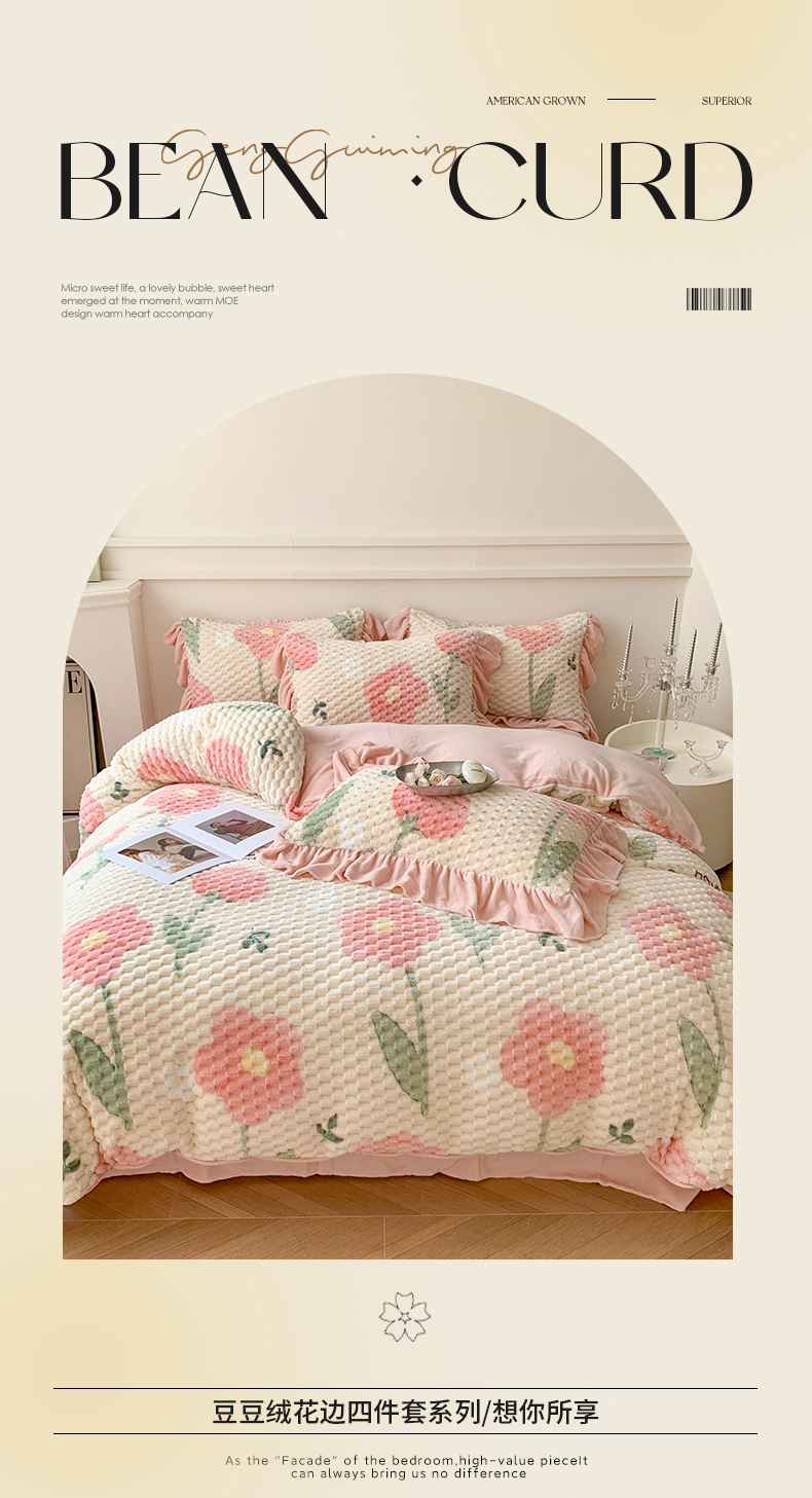 商品名称:潘朵拉 2023年新款豆豆绒花边牛奶绒四件套 粉萝