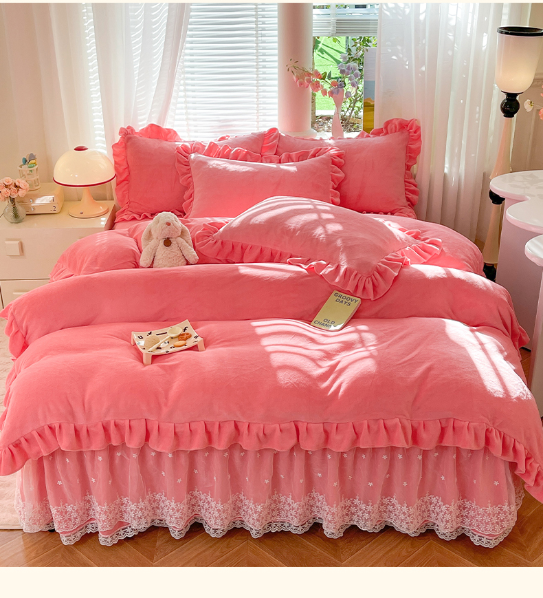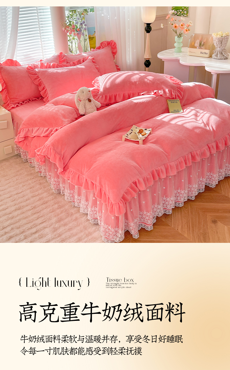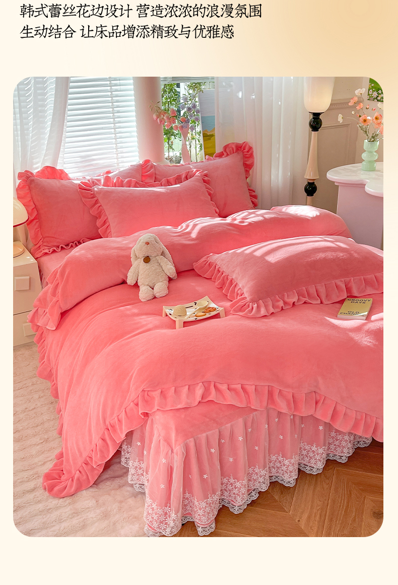 【8斤重】2025新款秋冬加厚牛奶绒床裙款四件套法式浪漫蕾丝花边工艺-遇见系列 遇见-红豆沙