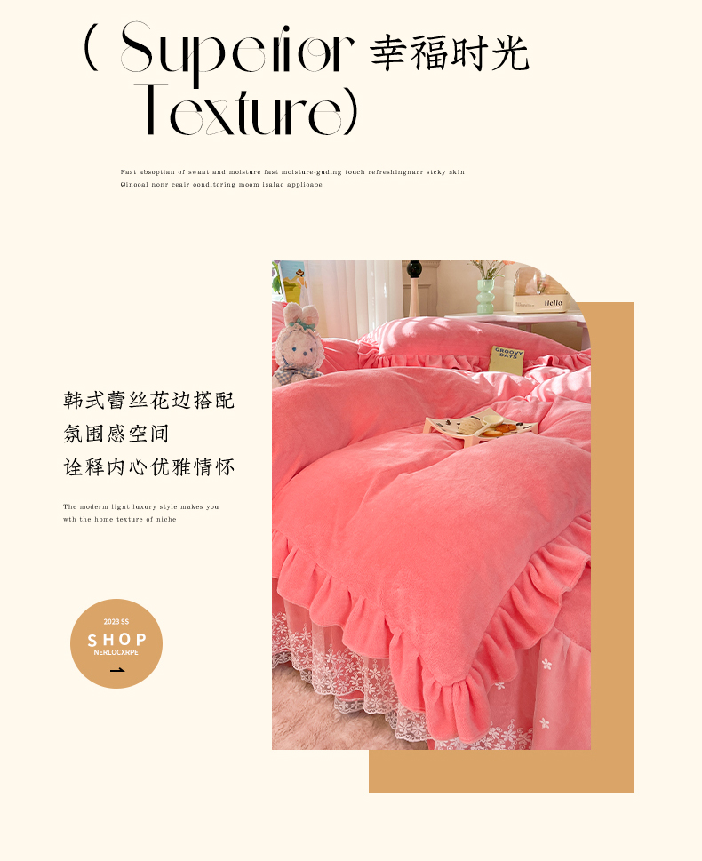 商品名称:【8斤重】2025新款秋冬加厚牛奶绒床裙款四件套法式浪漫蕾丝花边工艺-遇见系列 遇见-红豆沙
