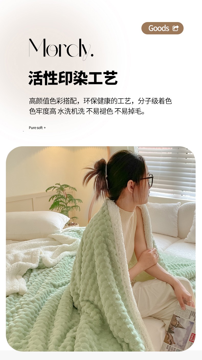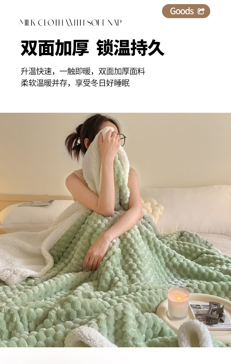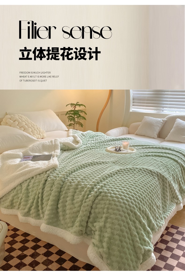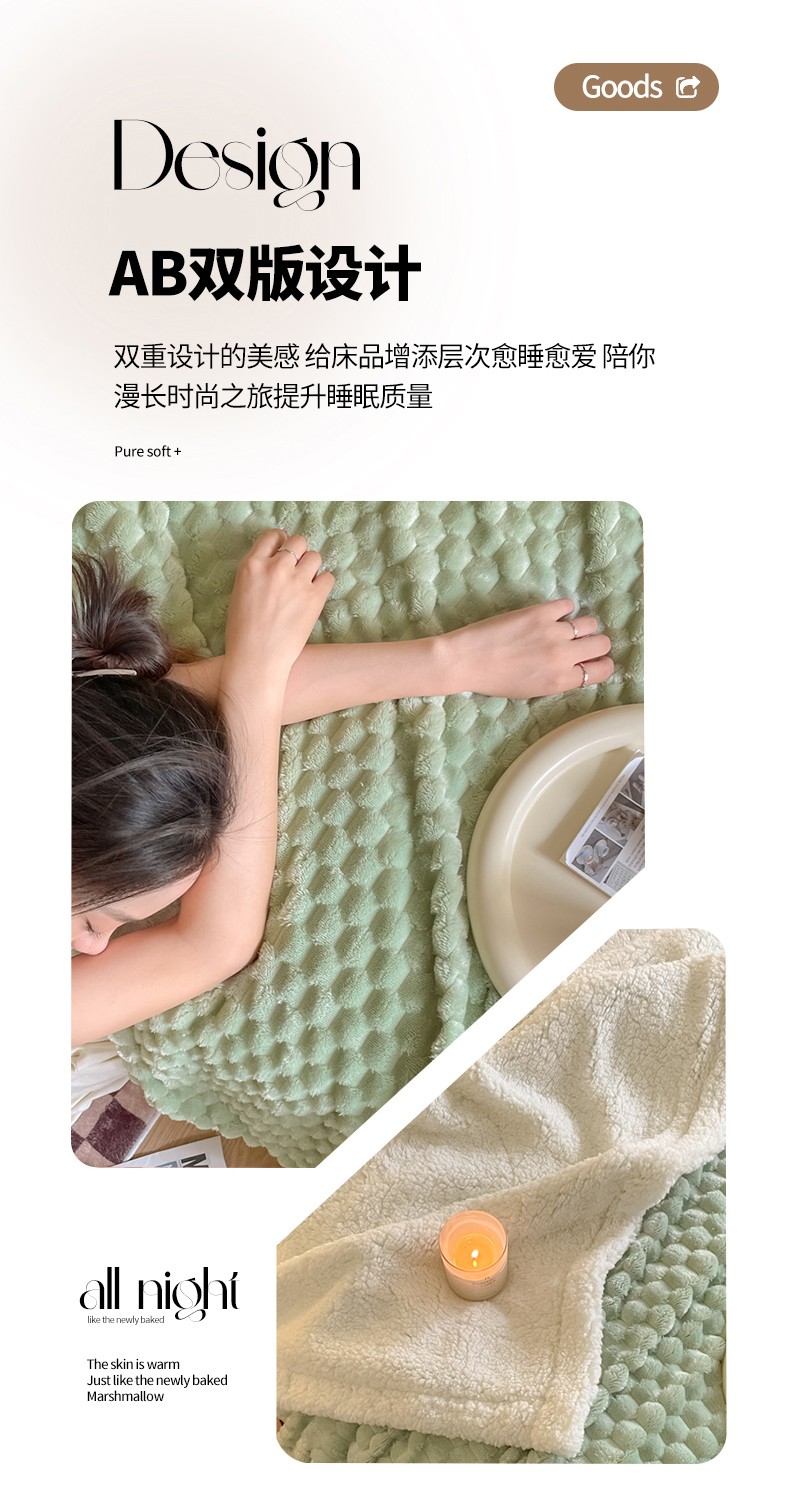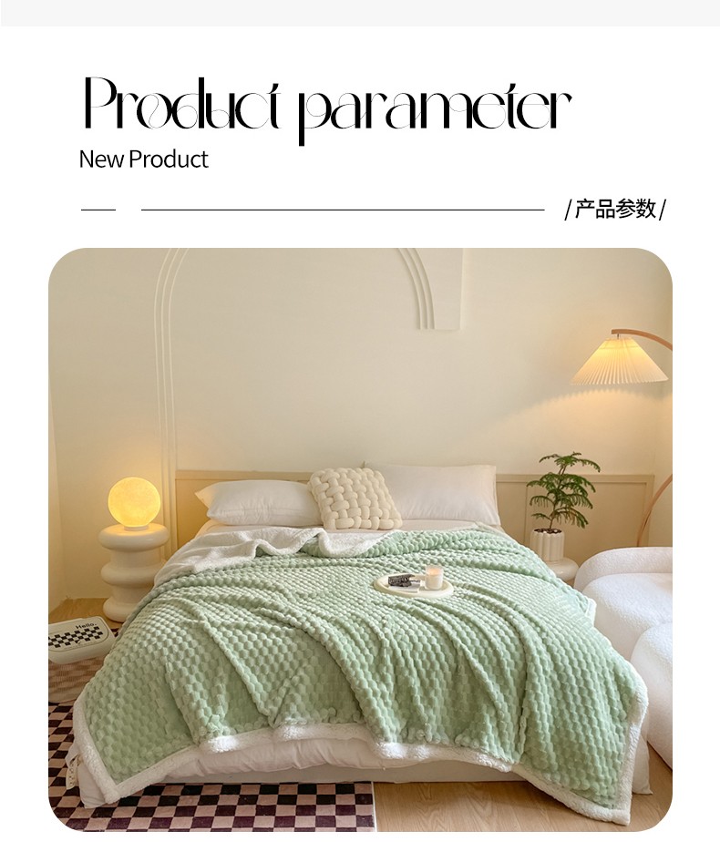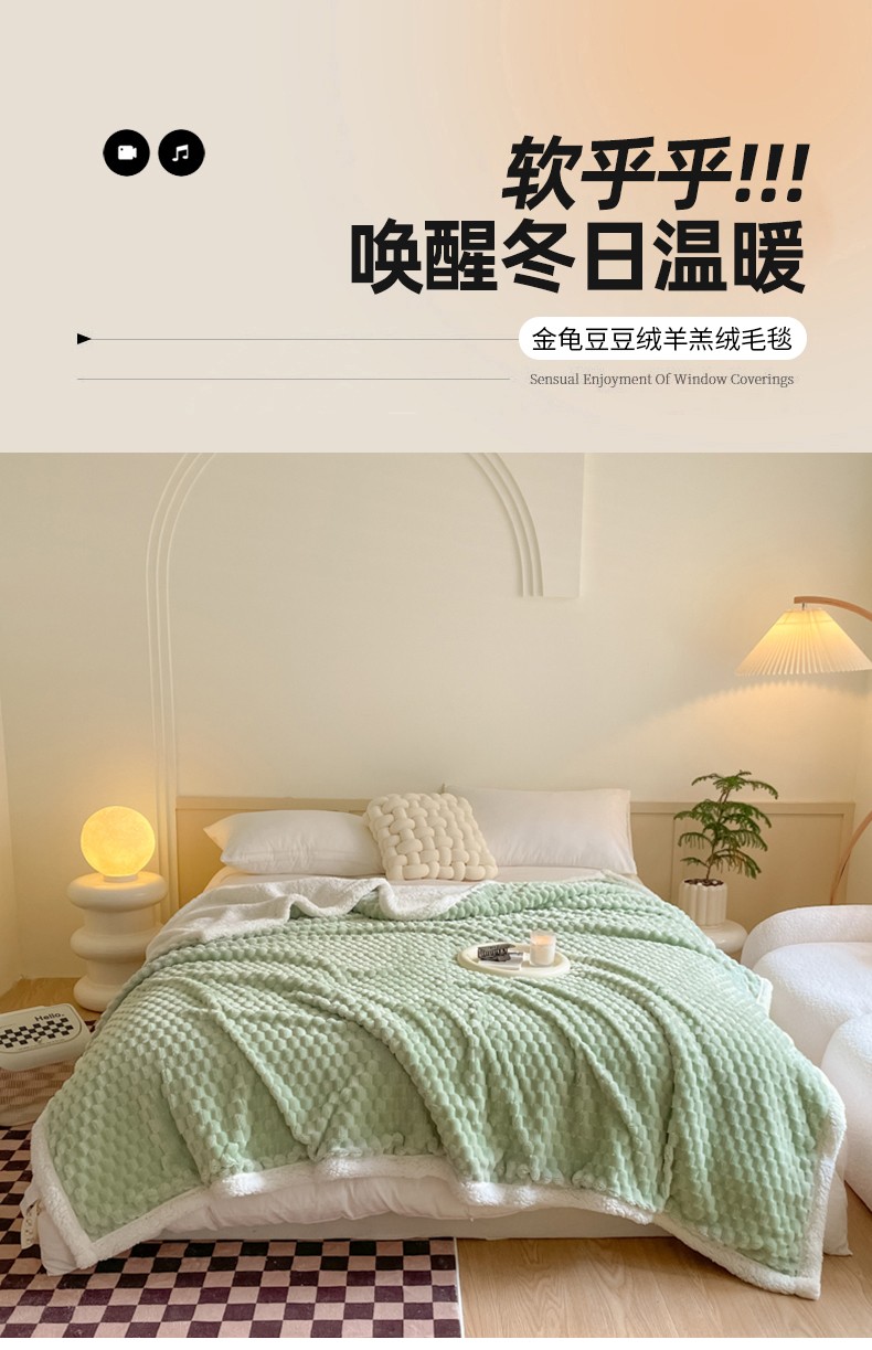 商品名称:欧邦 新款A类金龟绒提花豆豆绒毯子羊羔绒双层毛毯 豆绿