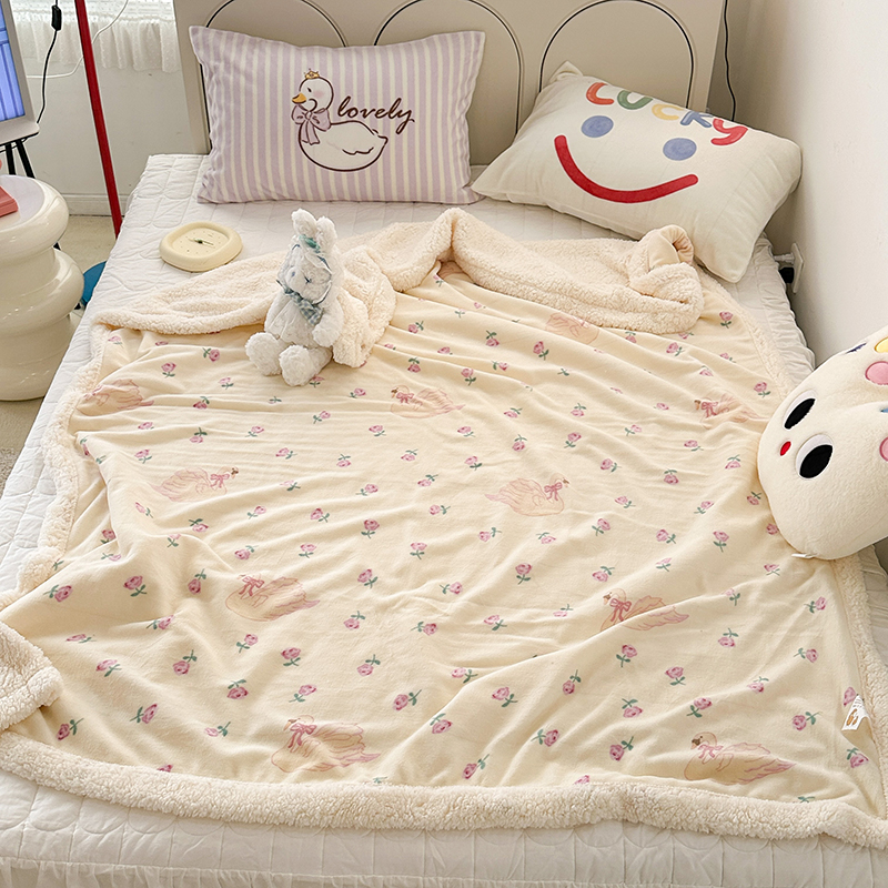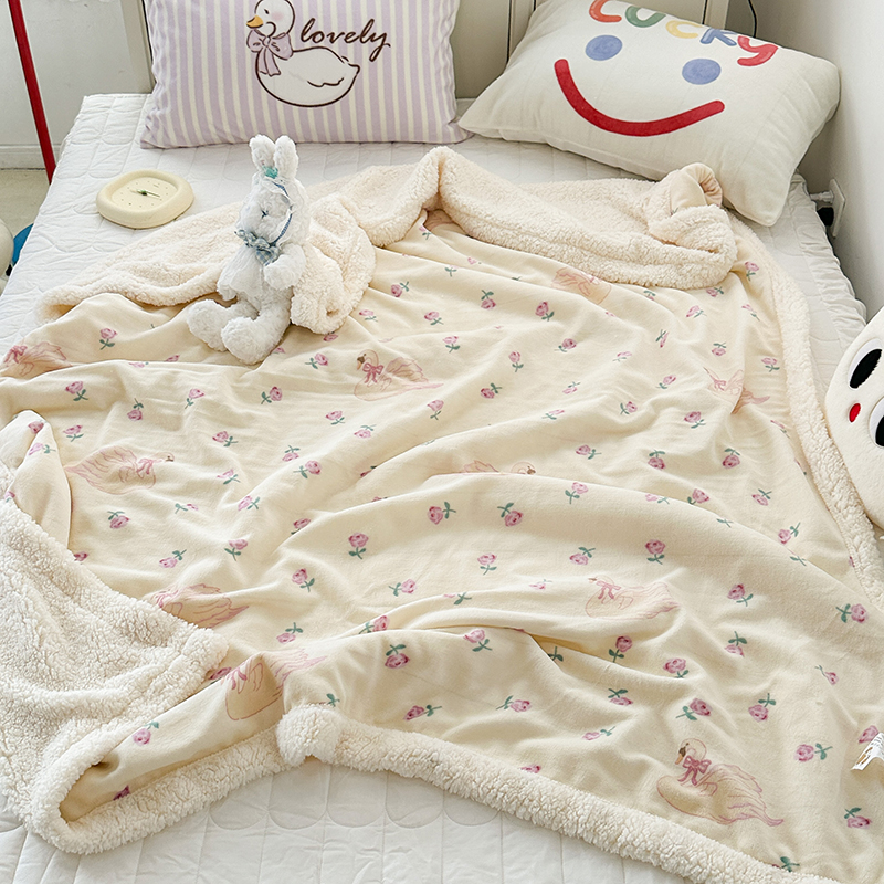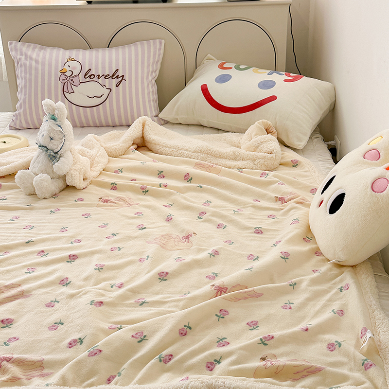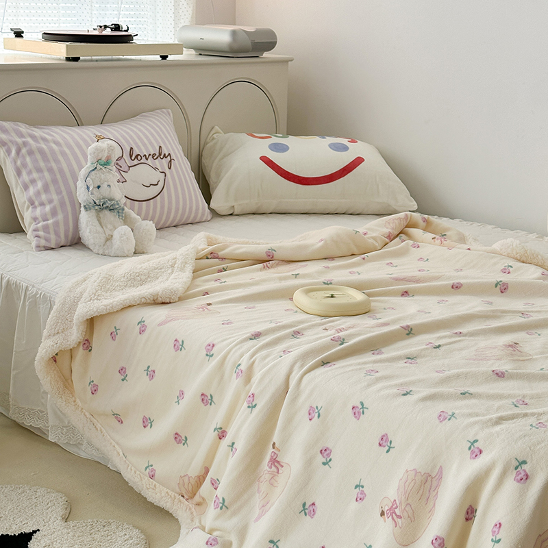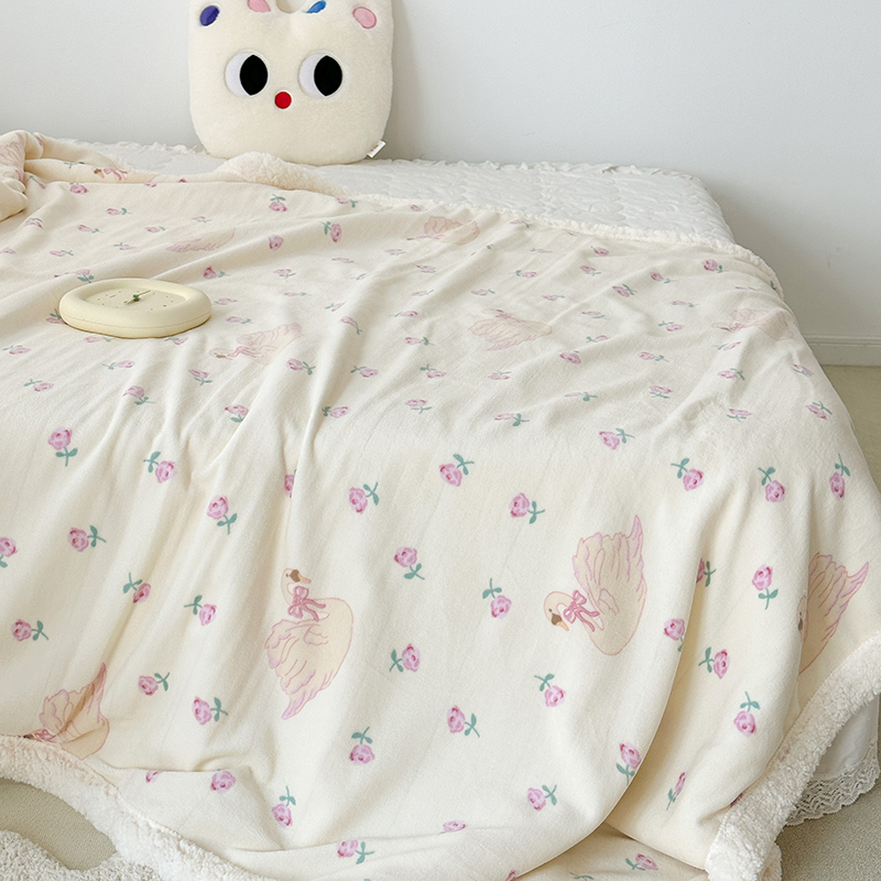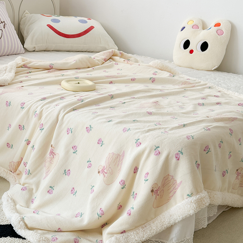 昔可家纺 2023新款ins风牛奶绒羊羔绒印花毛毯(风格一) 天鹅玫瑰