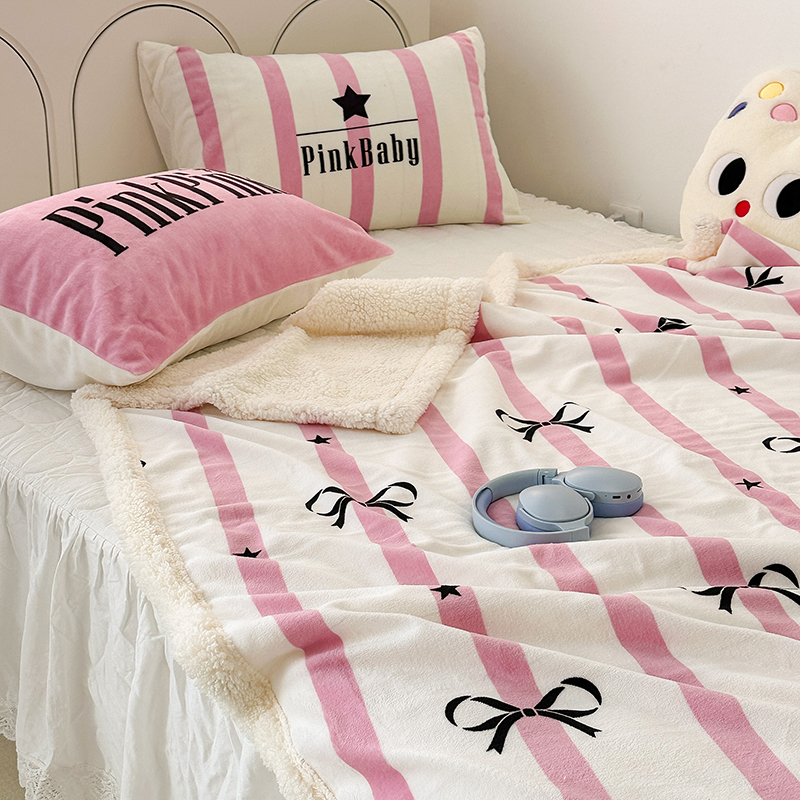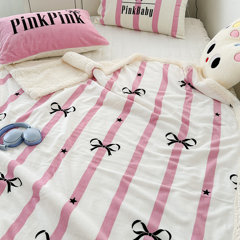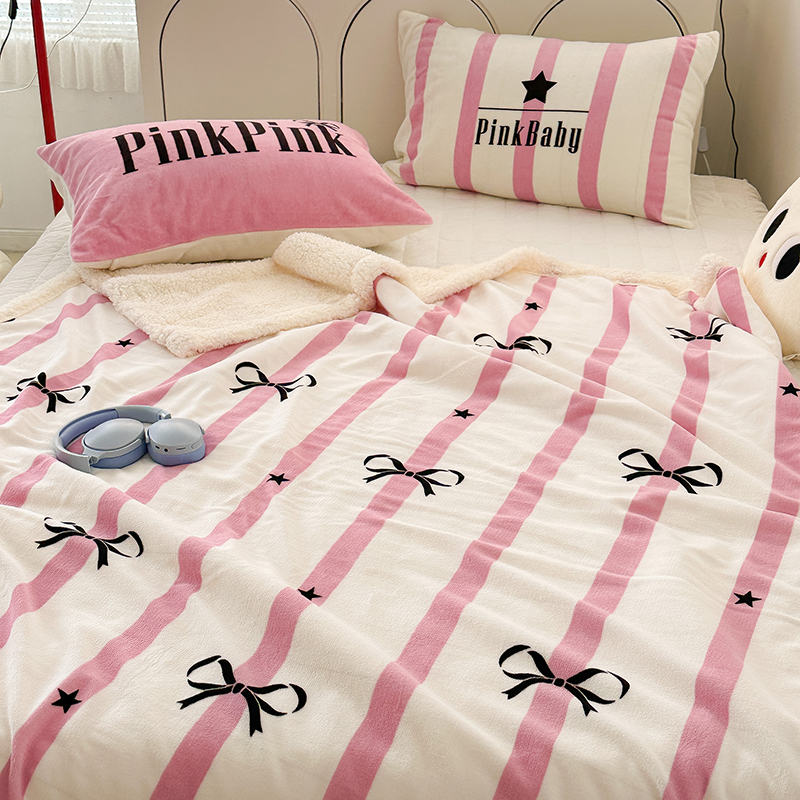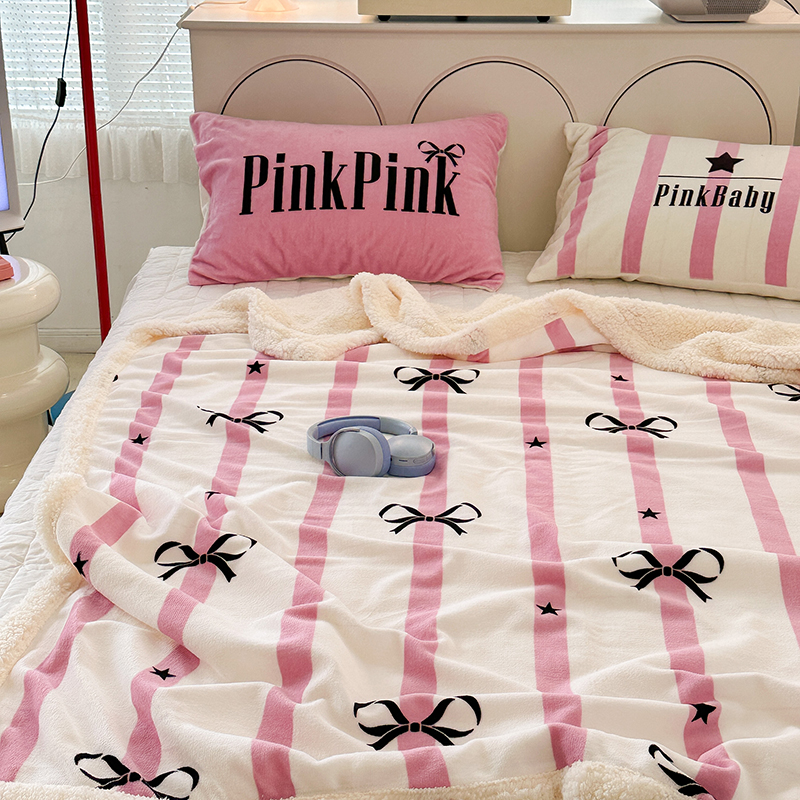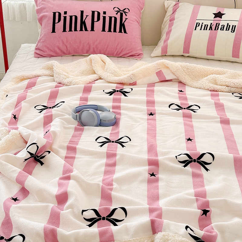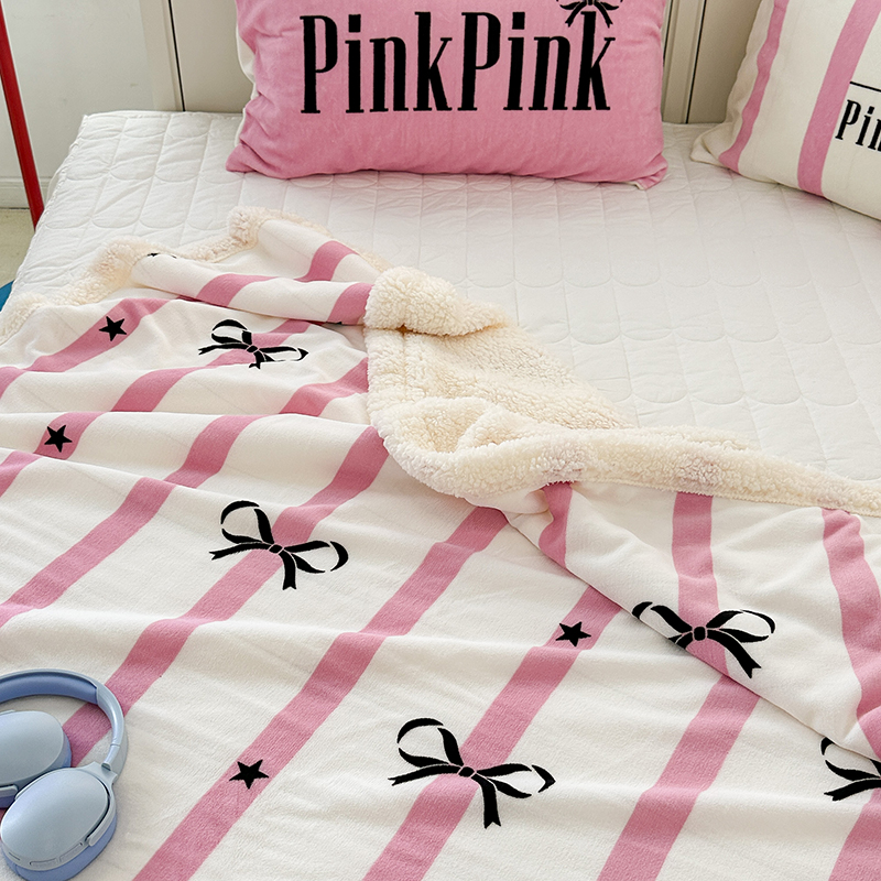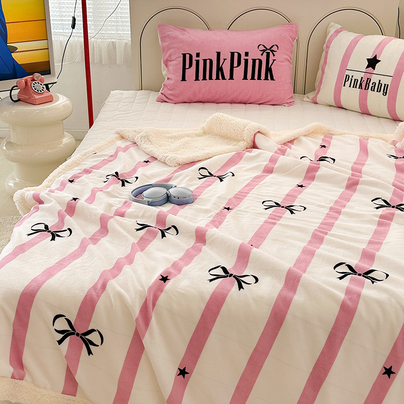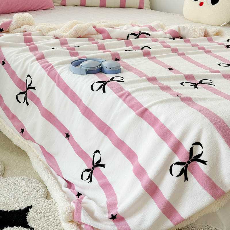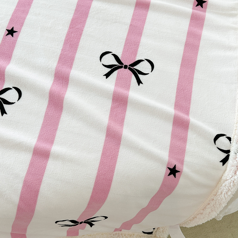 昔可家纺 2023新款ins风牛奶绒羊羔绒印花毛毯(风格一) 粉条星星蝴蝶结