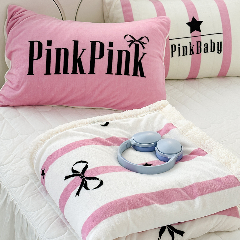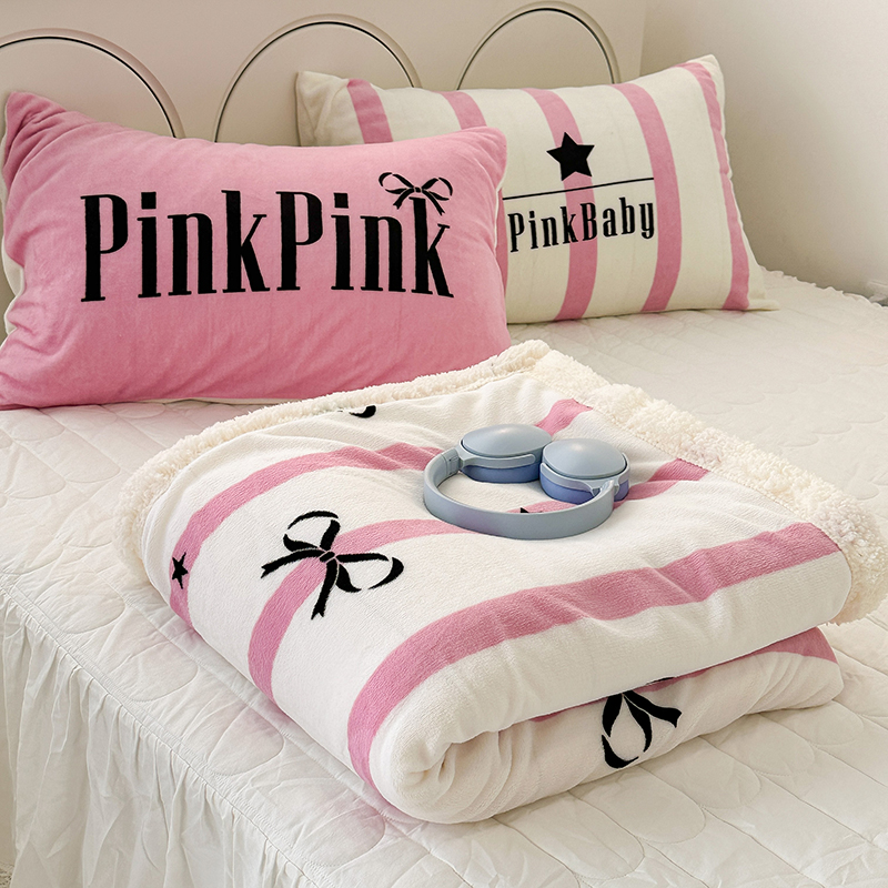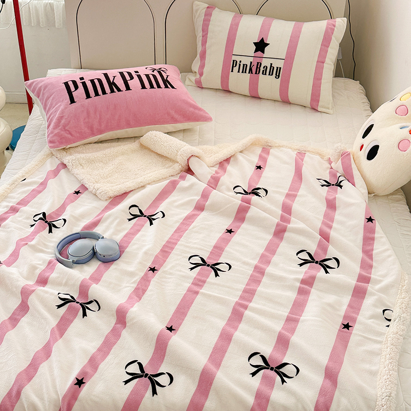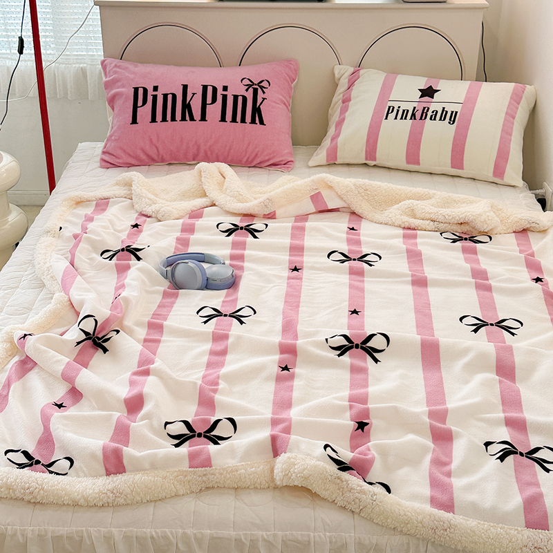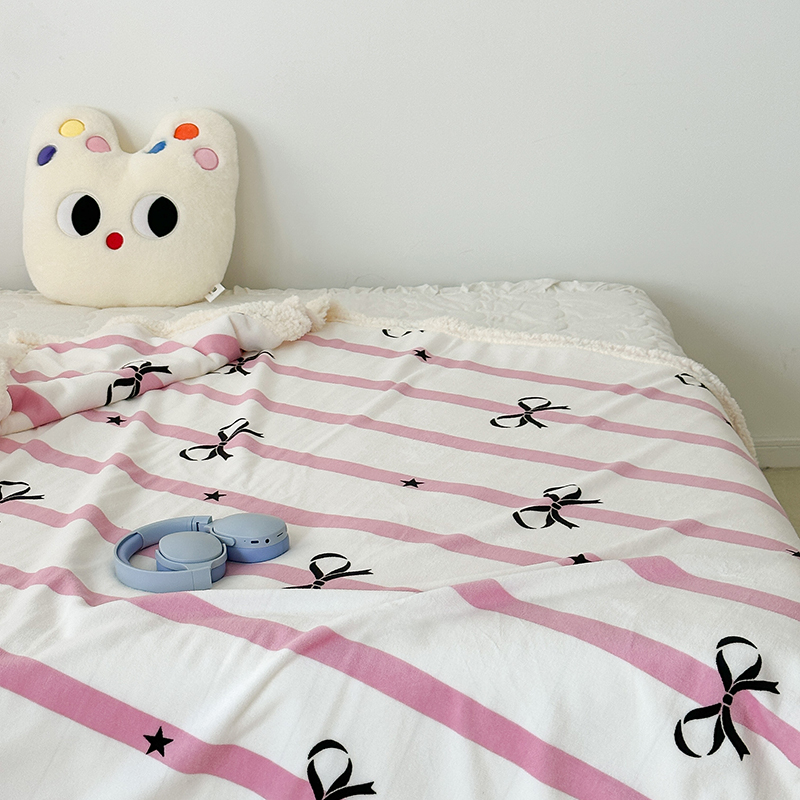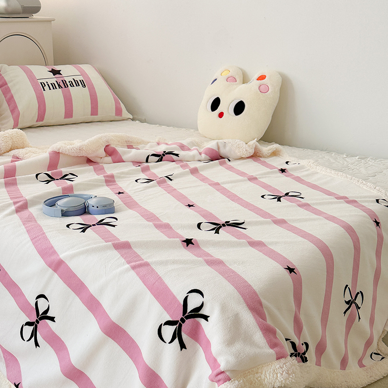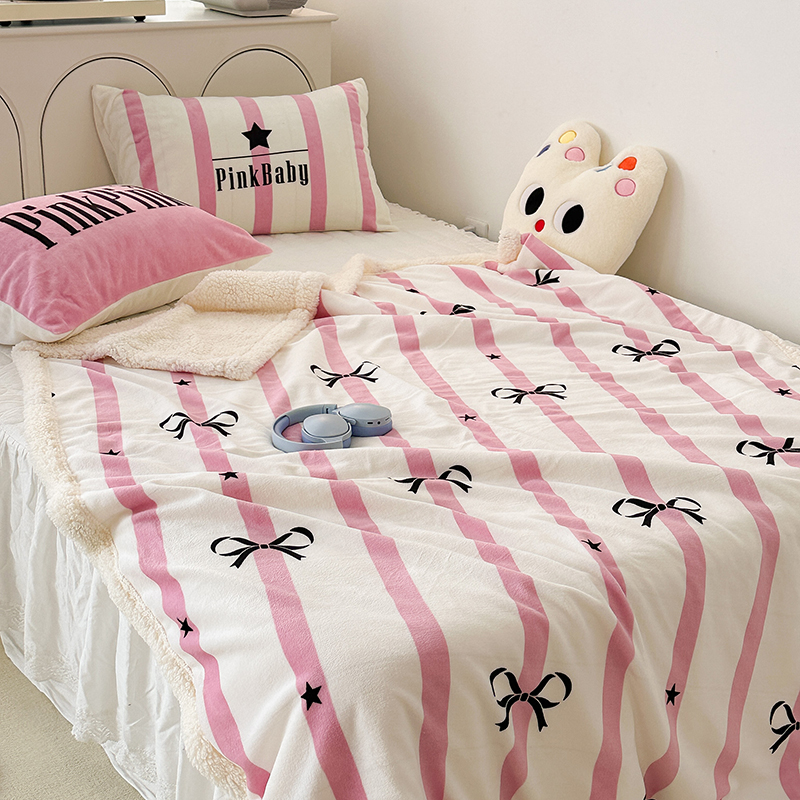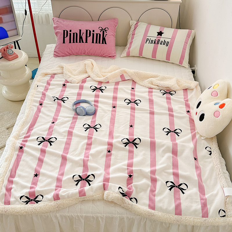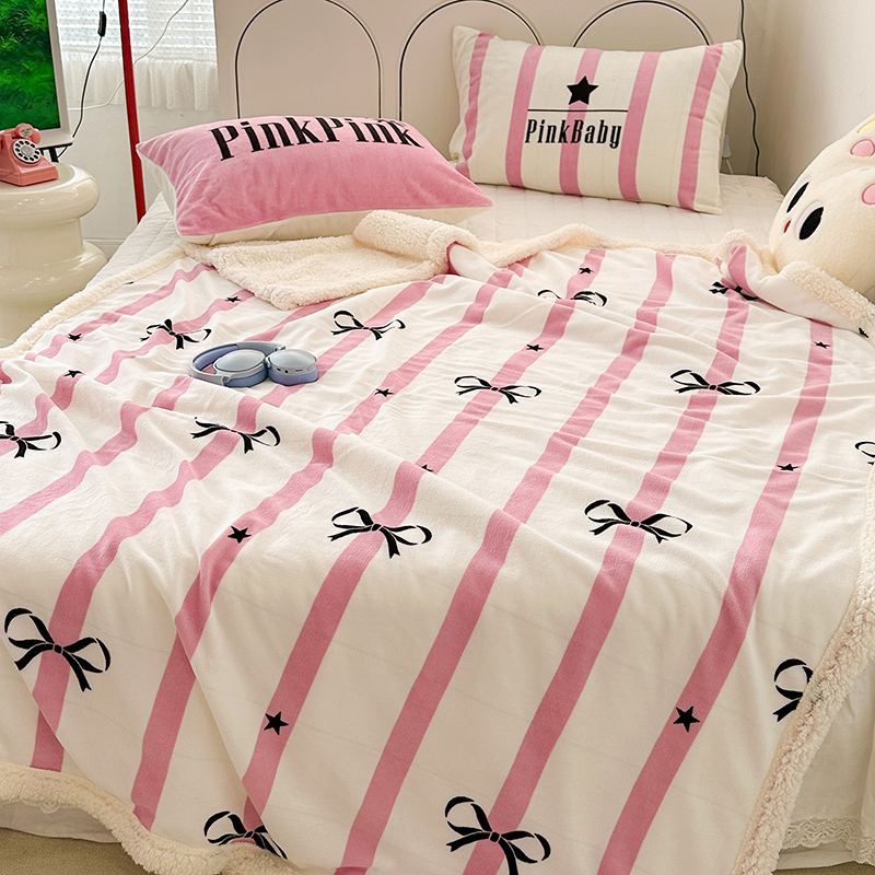 昔可家纺 2023新款ins风牛奶绒羊羔绒印花毛毯(风格一) 粉条星星蝴蝶结