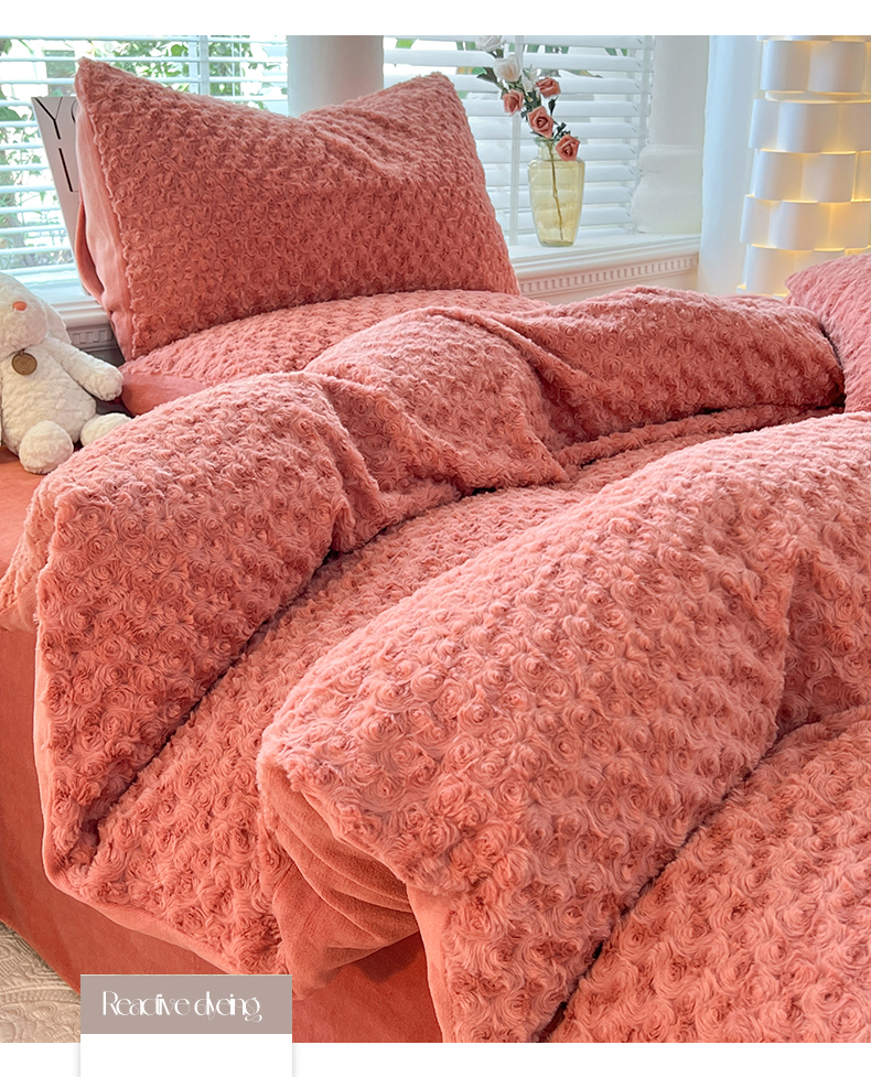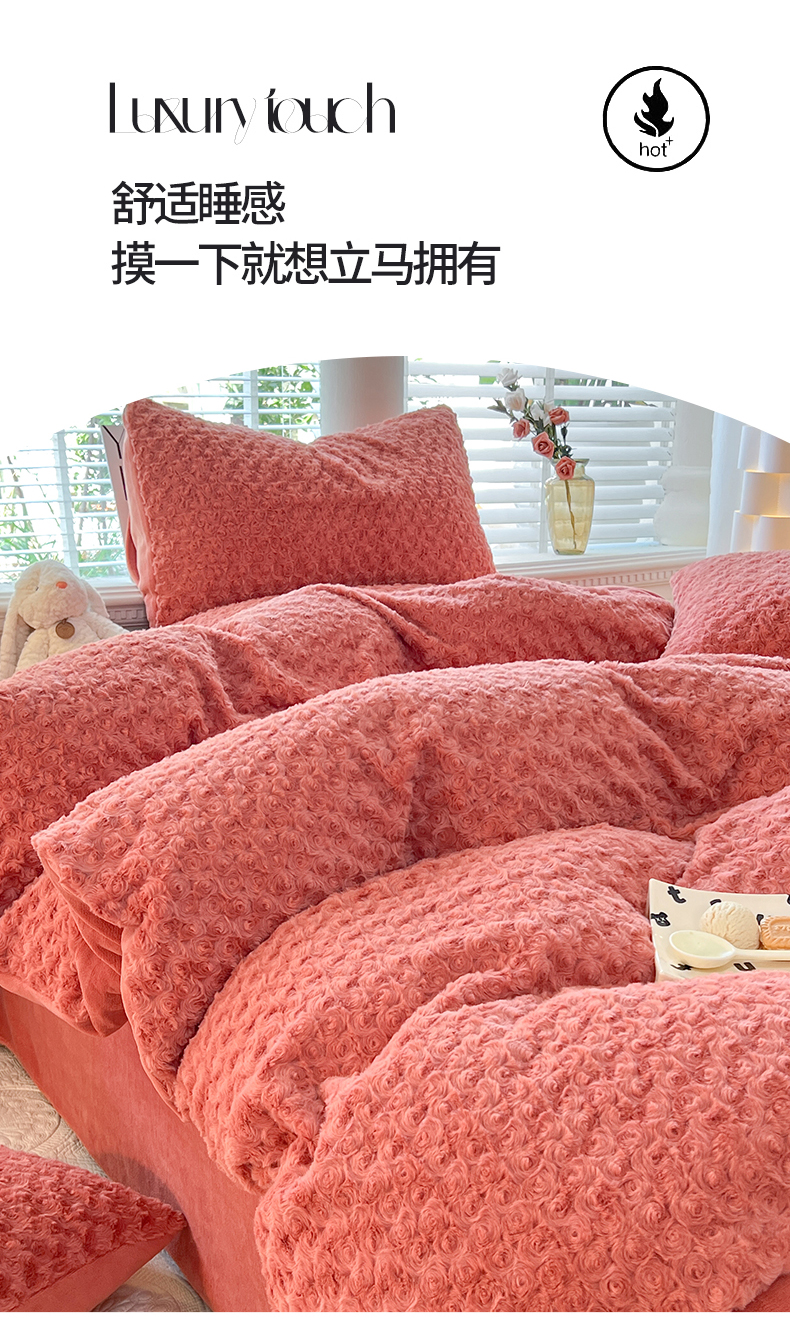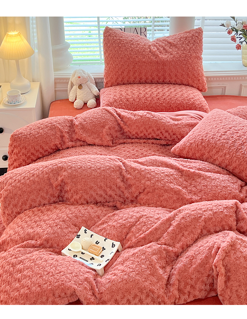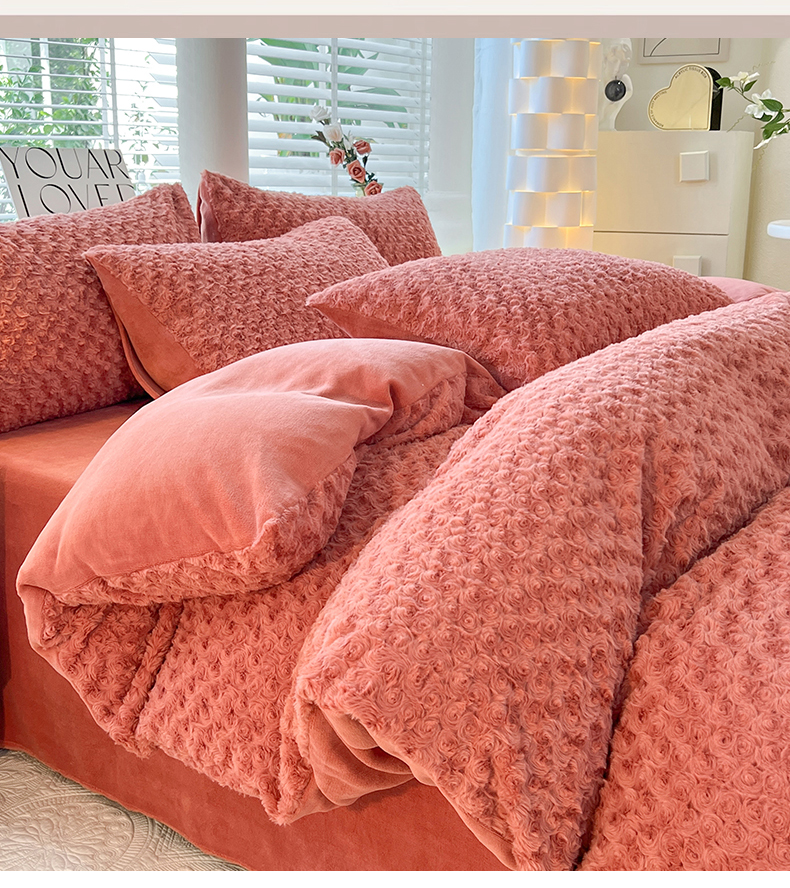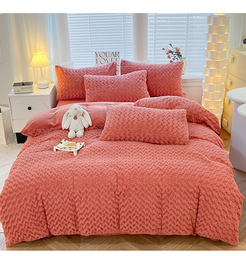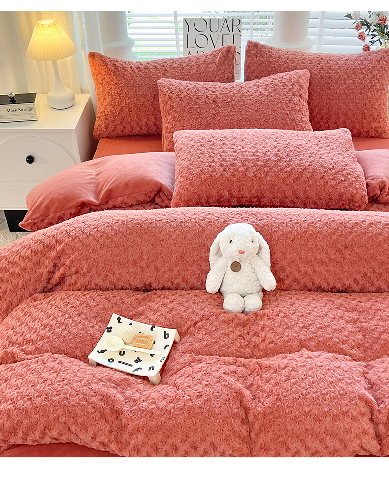 妖妖家纺 2023兔毛四件套-小玫瑰小格子 玫瑰-橘红