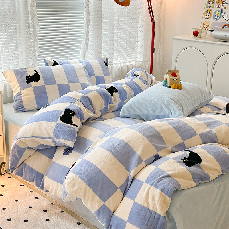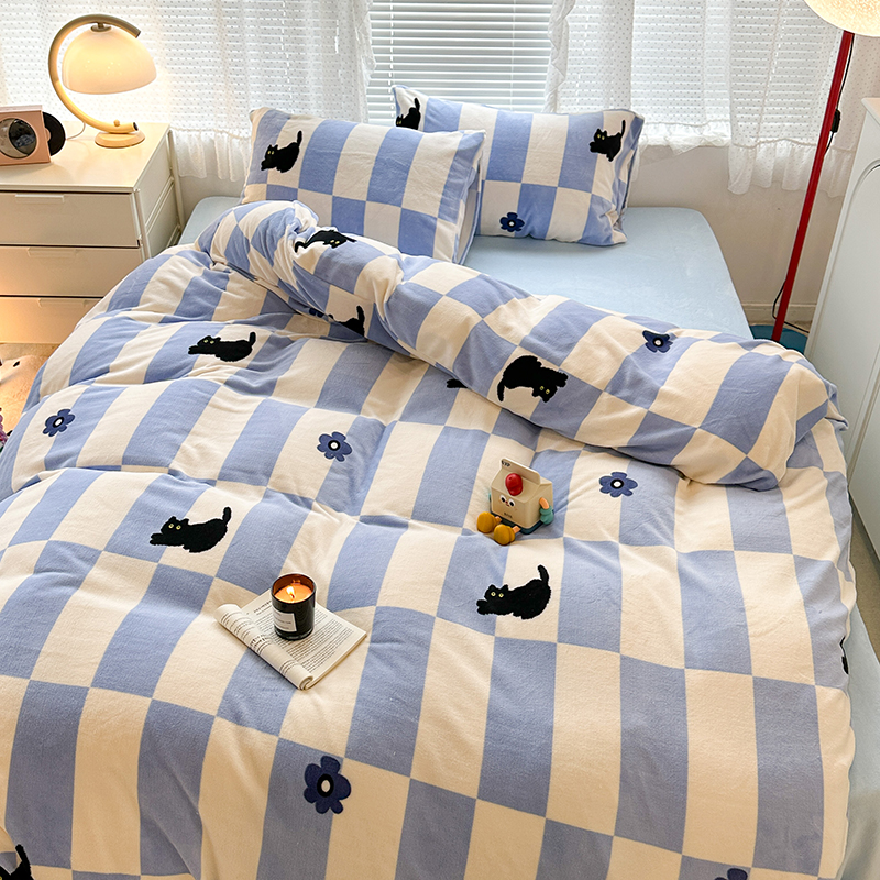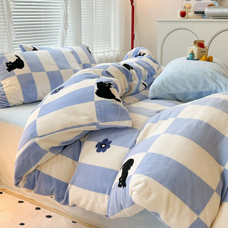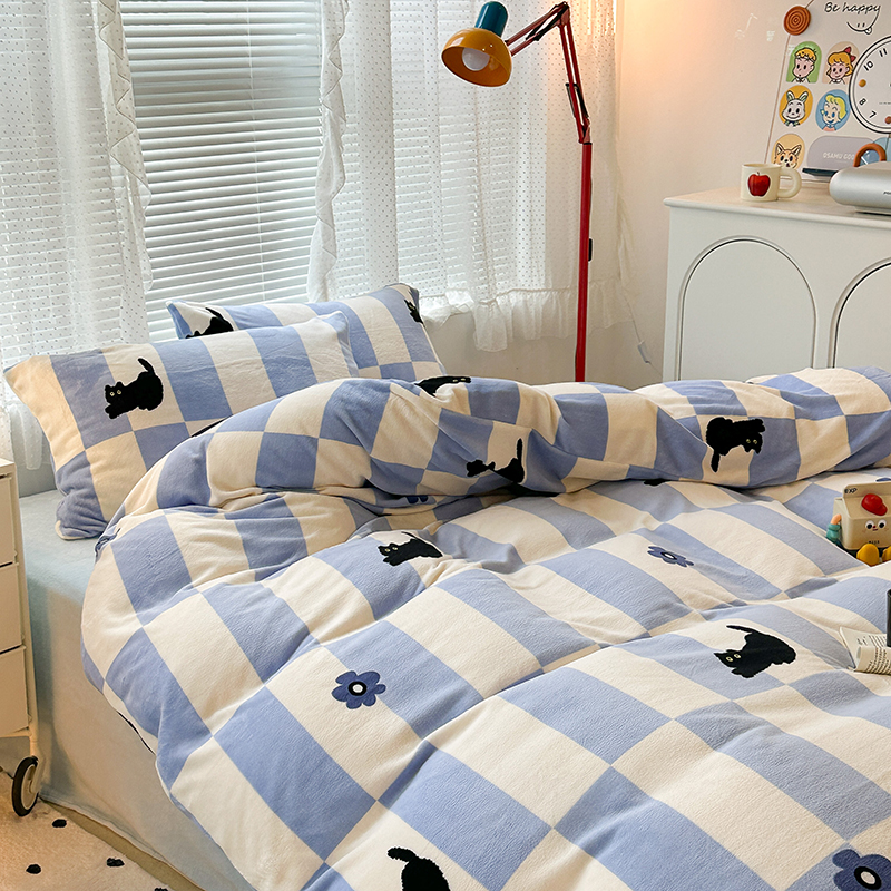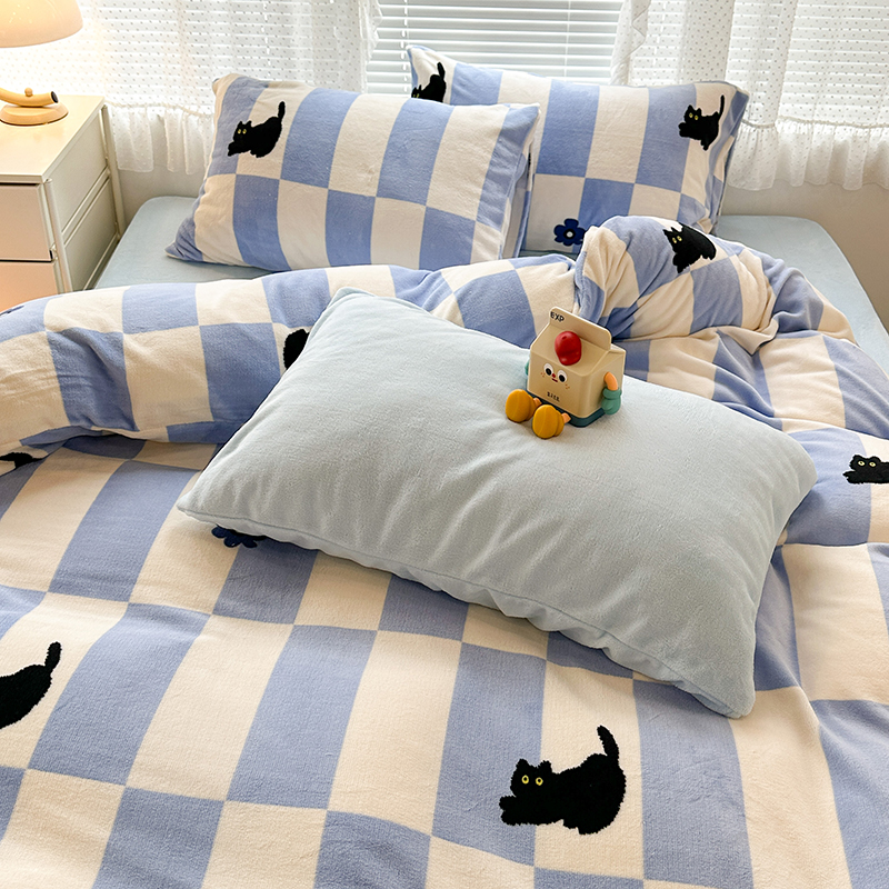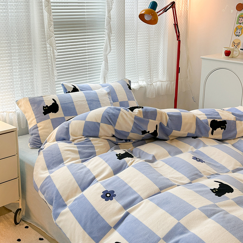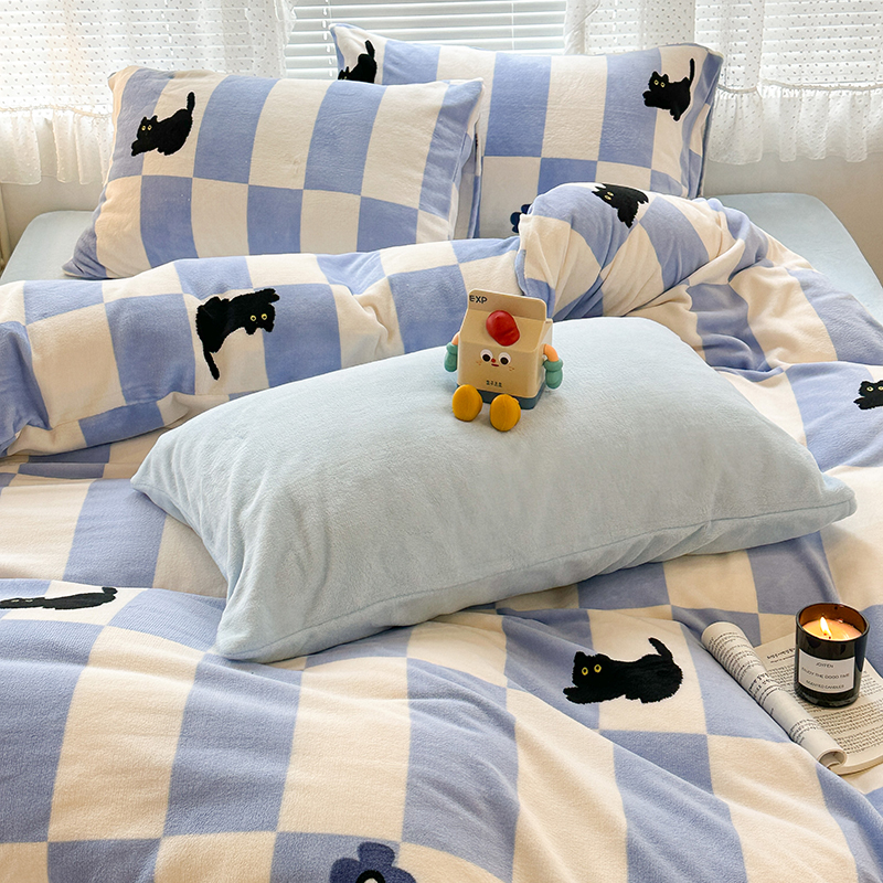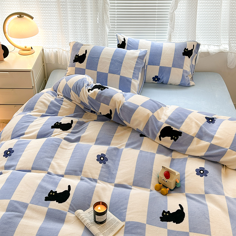 昔可家纺 2023新款高克重印花牛奶绒卡通系列四件套 蓝格小黑猫