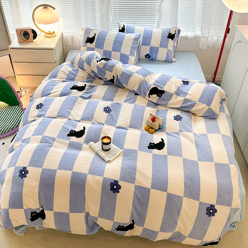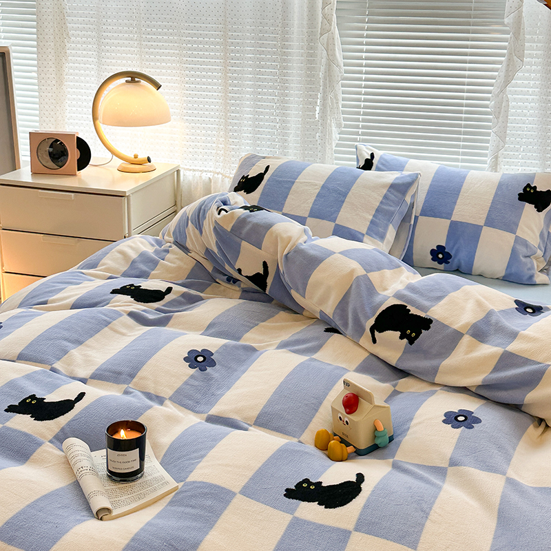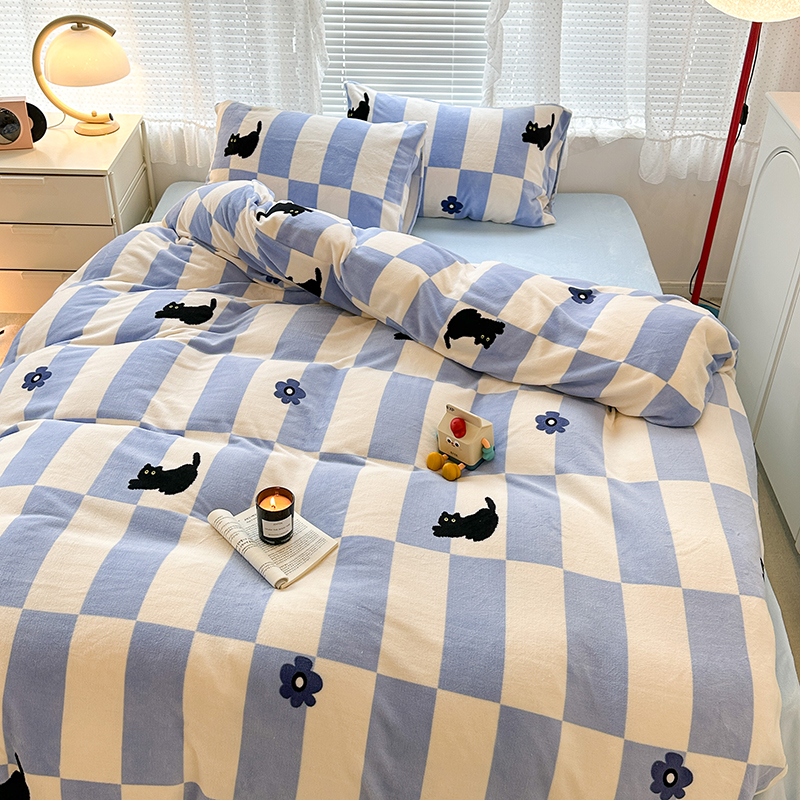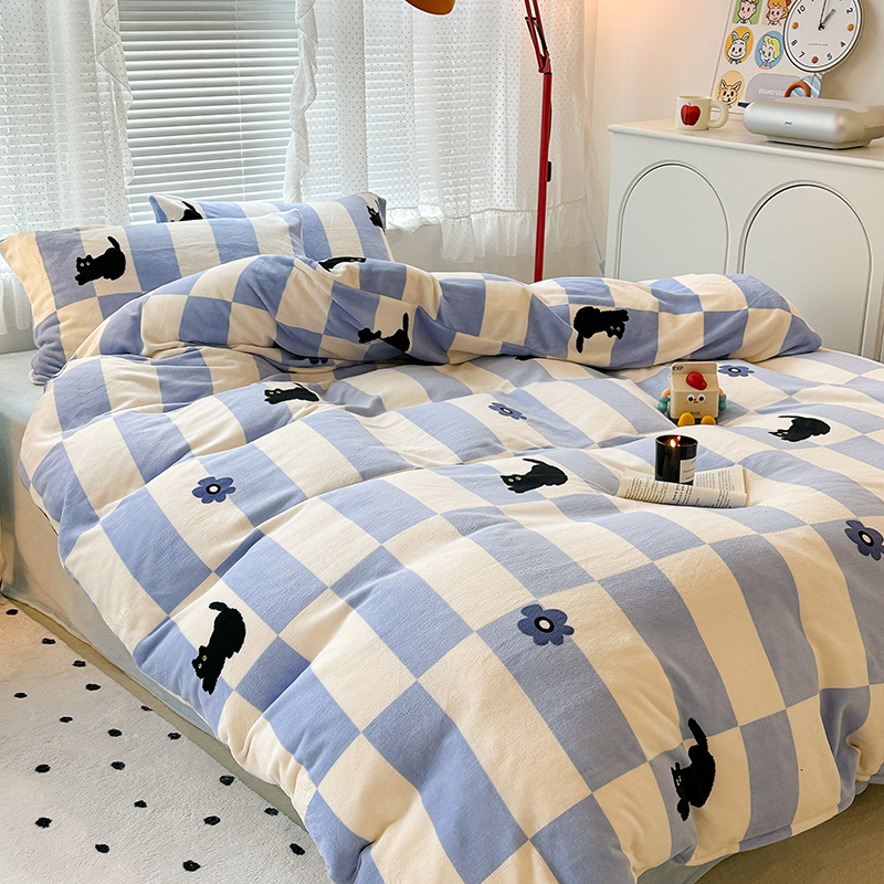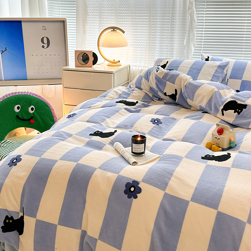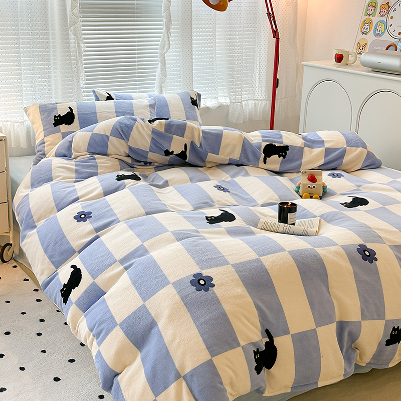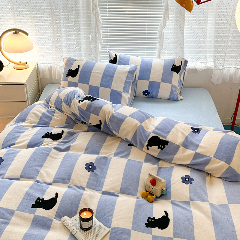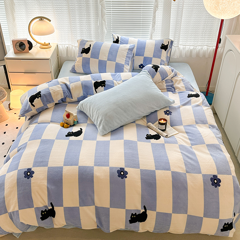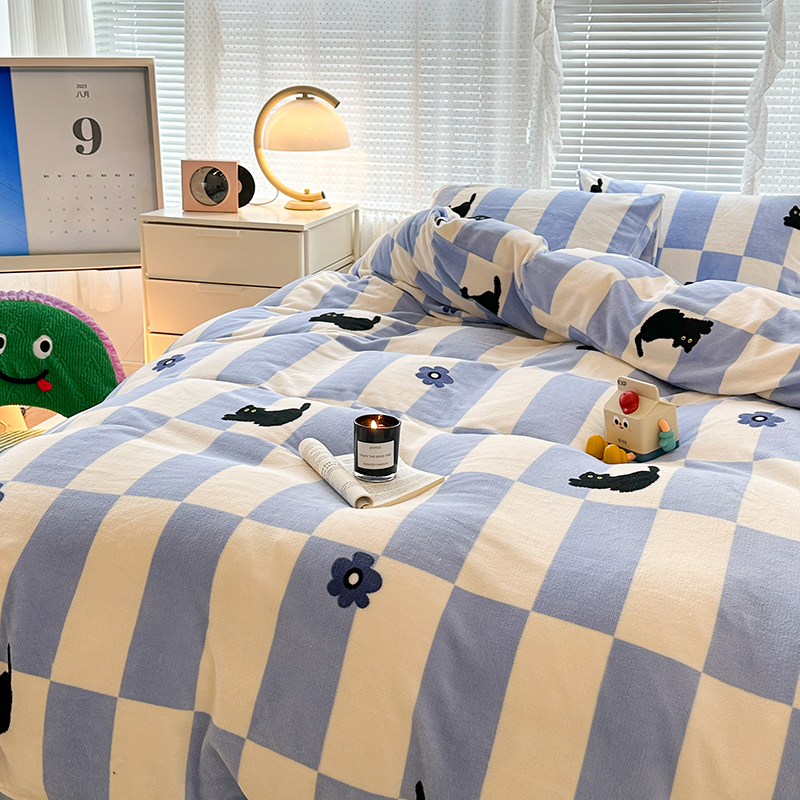 昔可家纺 2023新款高克重印花牛奶绒卡通系列四件套 蓝格小黑猫