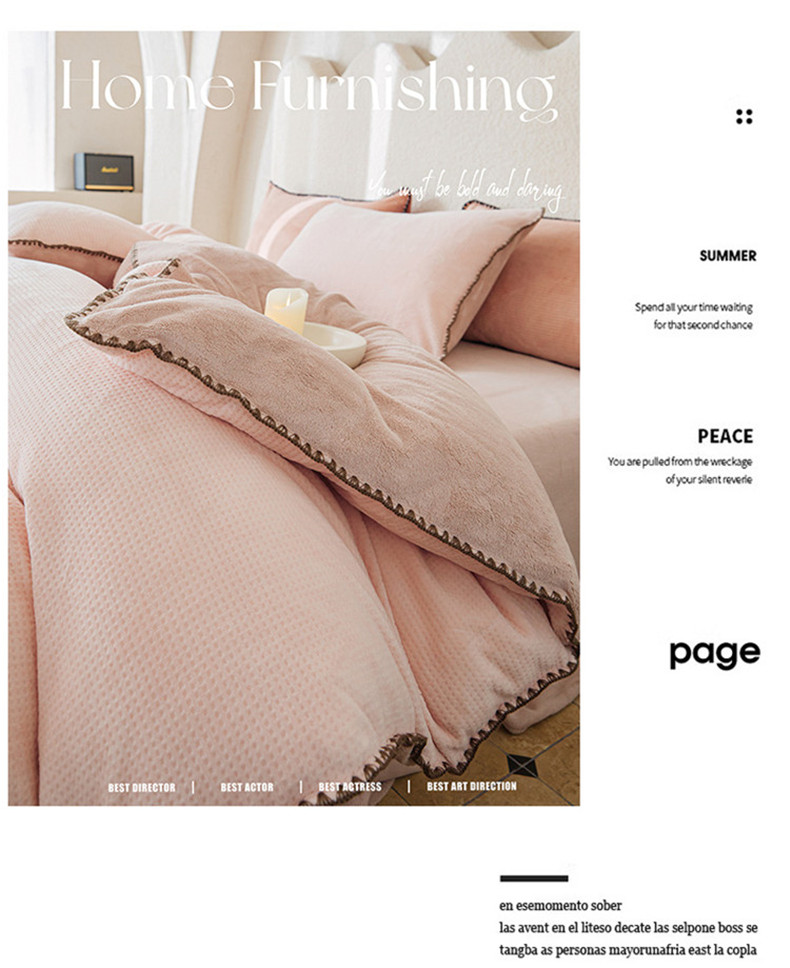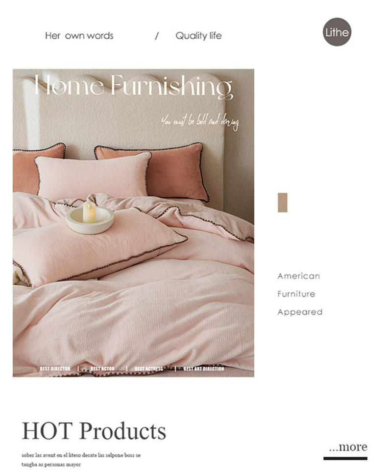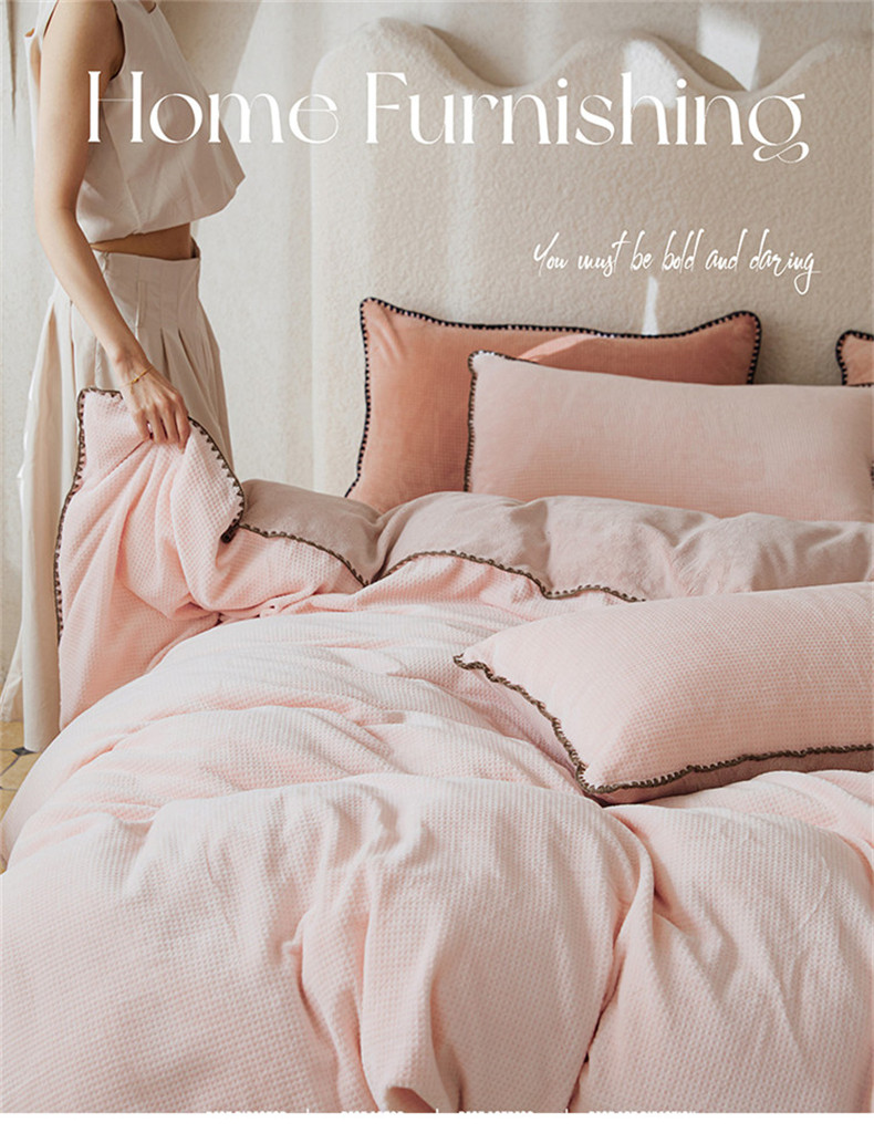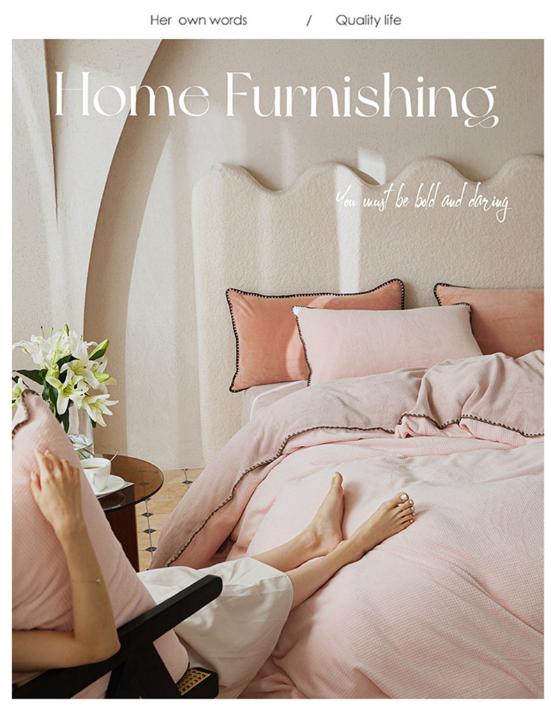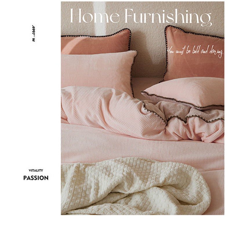 当前位置: 91家纺网 > 商品网购 > 床品套件 > 四件套 > 雕花绒四件套 > 新款华夫格立体雕花绒四件套-未央系列(英文版) 未央-盈盈粉