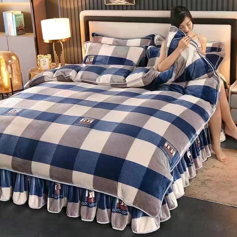 静缘分 2025新款230克特厚8.5斤牛奶绒金貂绒床裙款保暖四件套-清新雅格,清新雅格