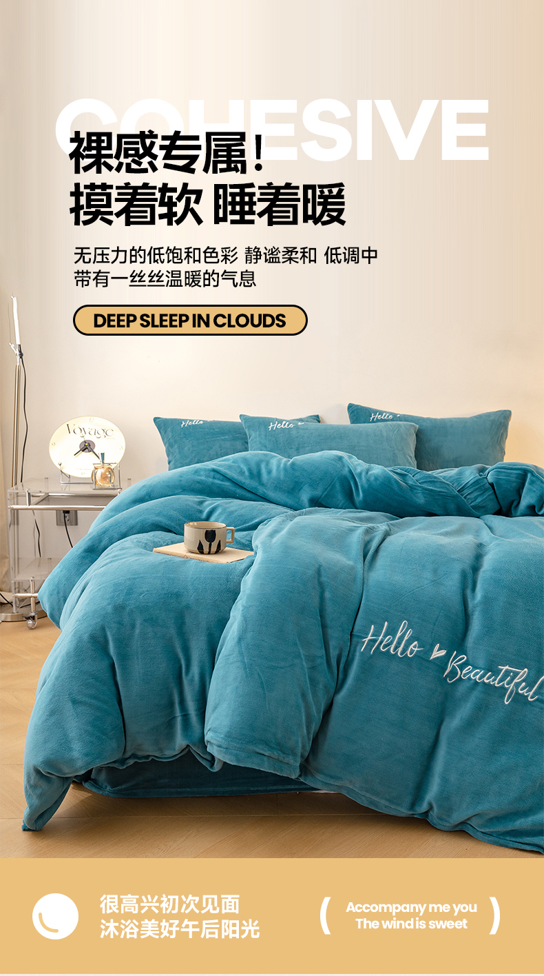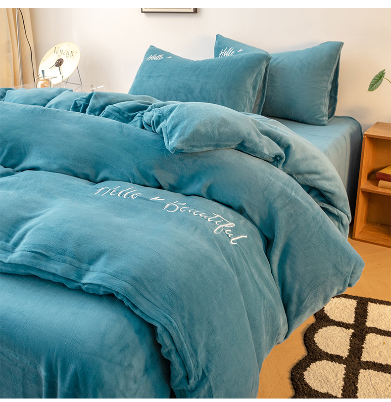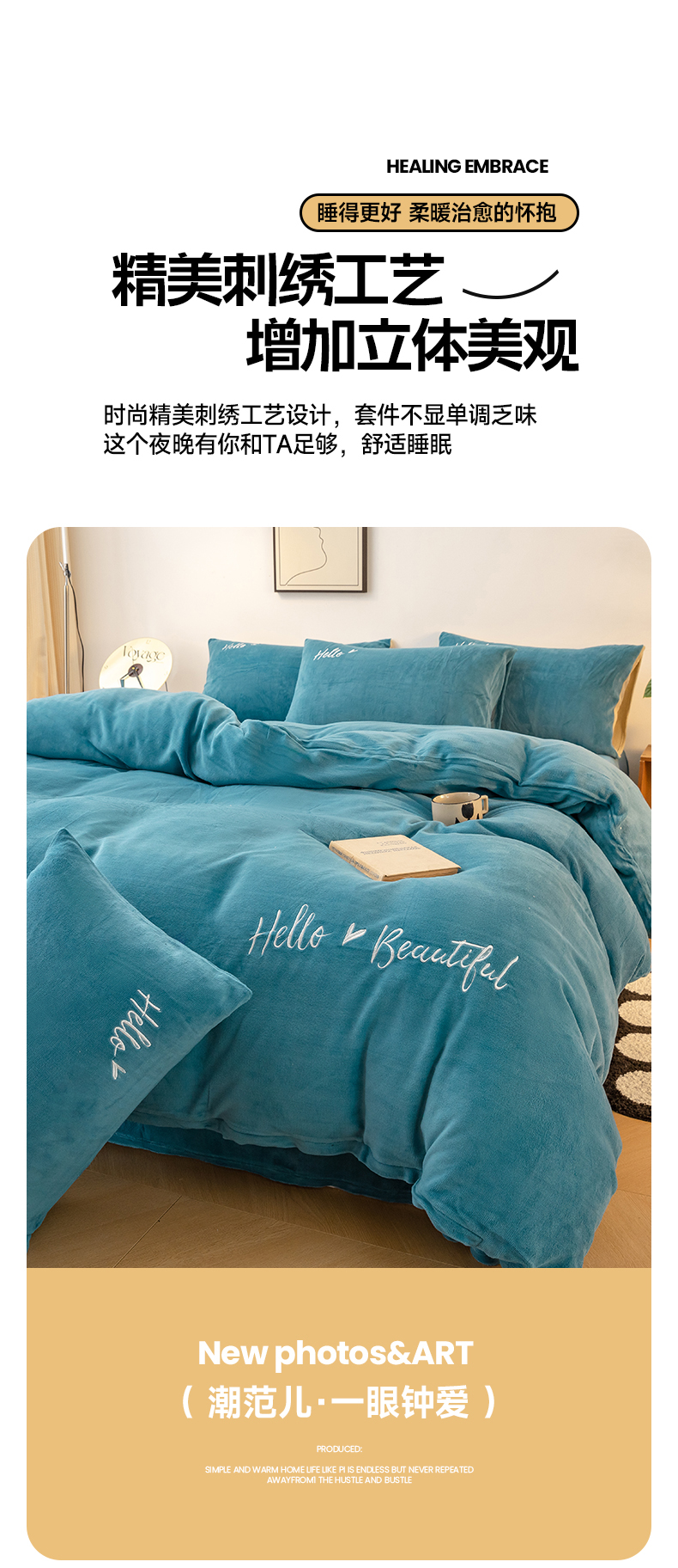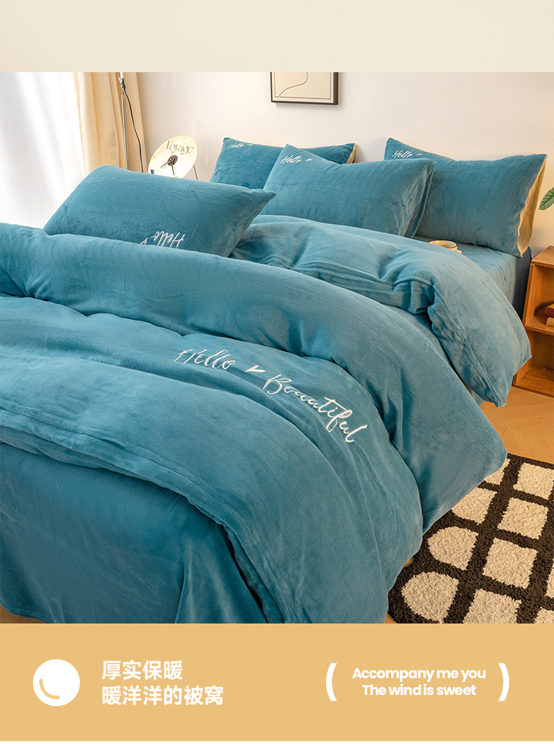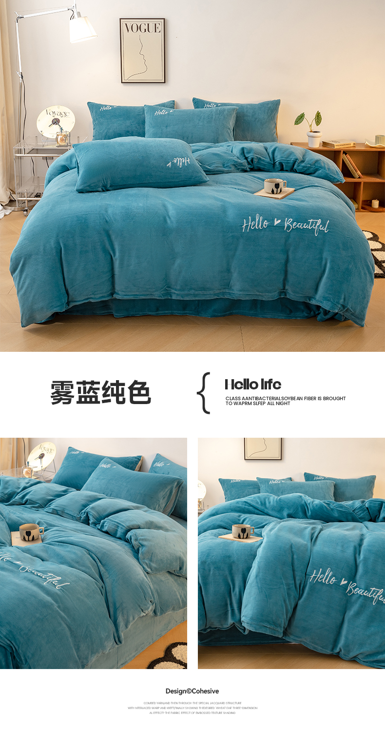 当前位置: 91家纺网 > 商品网购 > 床品套件 > 四件套 > 牛奶绒四件套 > 寐眠 2023新款牛奶绒刺绣四件套 Hello life雾蓝纯色