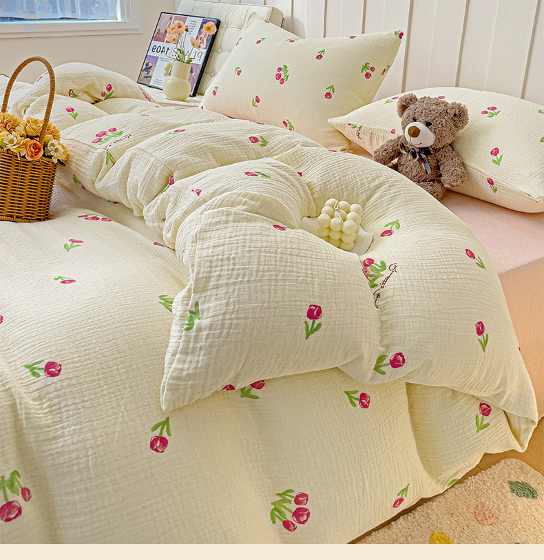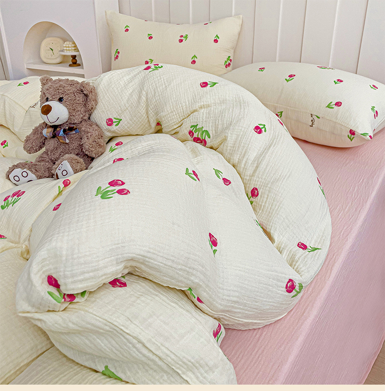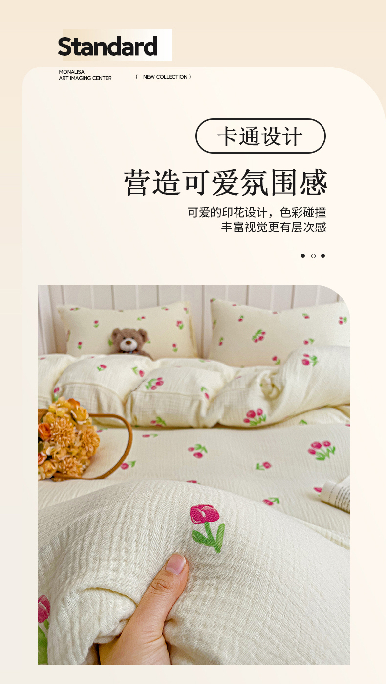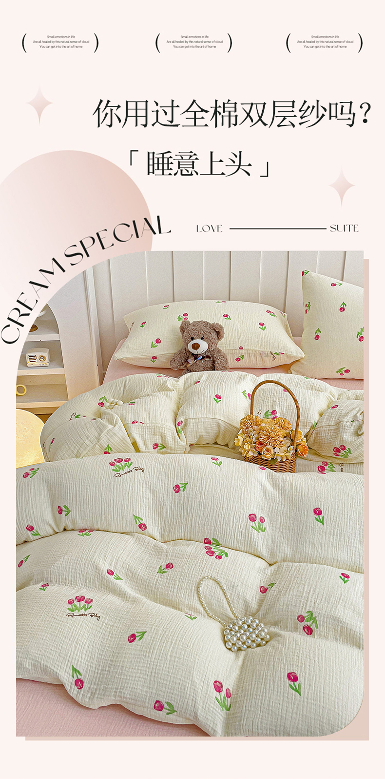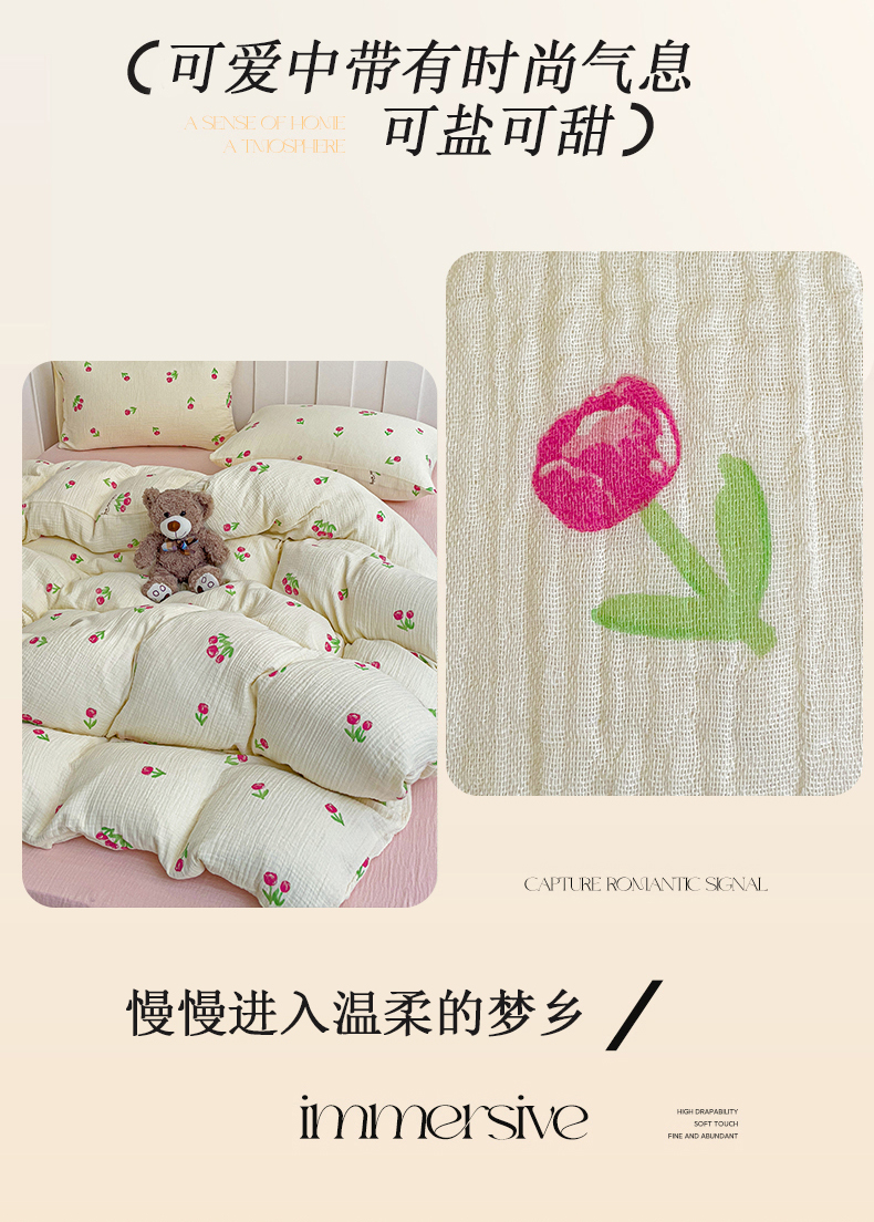 商品名称:珺柔家纺 2024新款全棉皱皱双层纱印花四件套 粉色郁金香