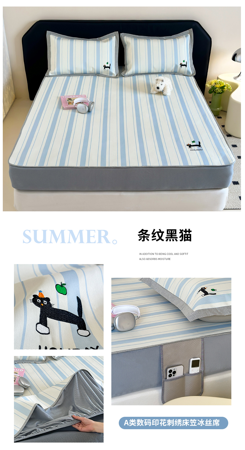 昔可家纺 2024新款A类900D数码印花刺绣床笠款冰丝席 条纹黑猫