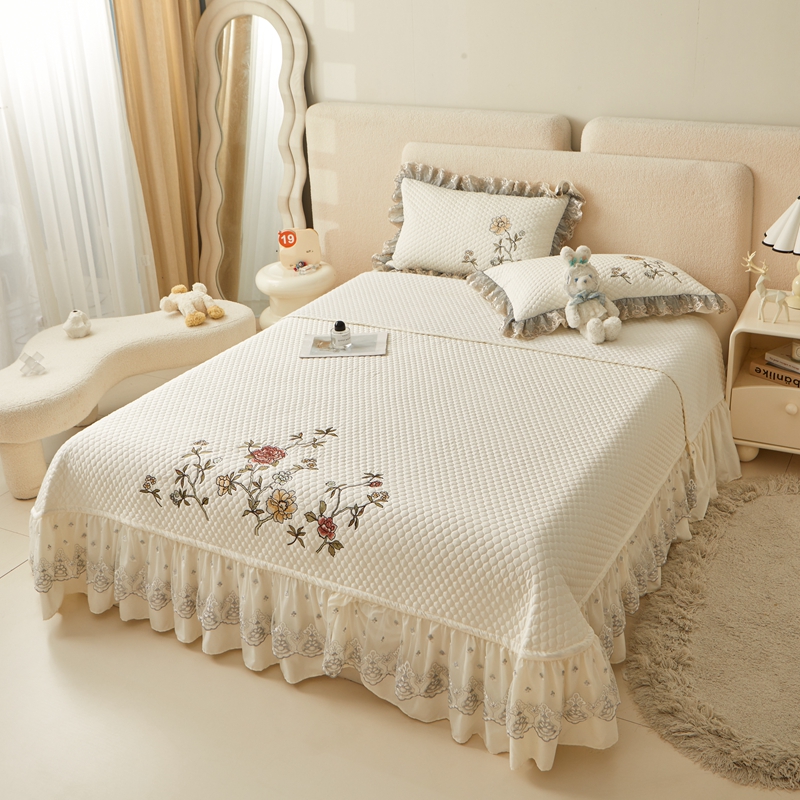 紫碧螺家纺 2024新款刺绣花边床裙式床盖(仿天丝) 米白