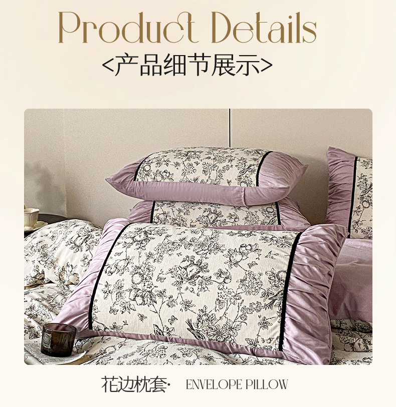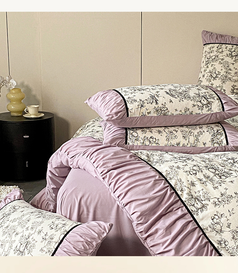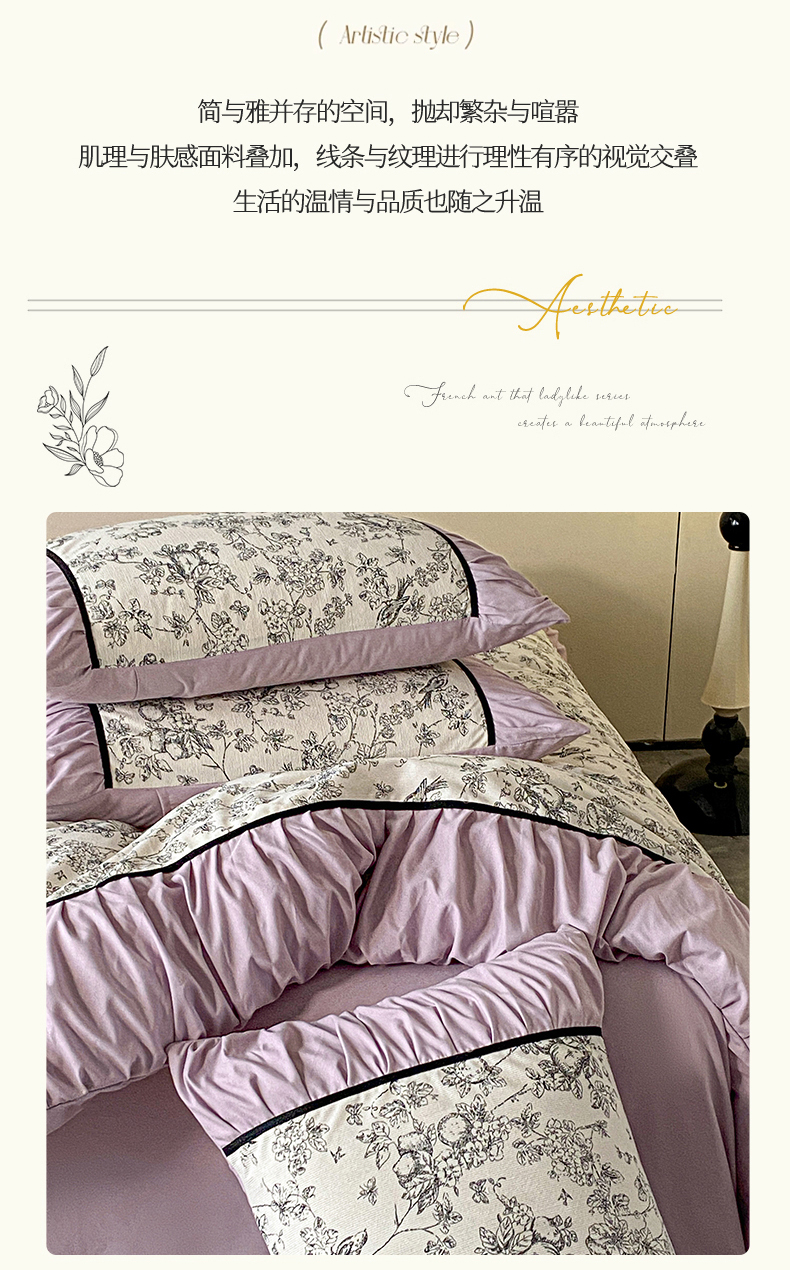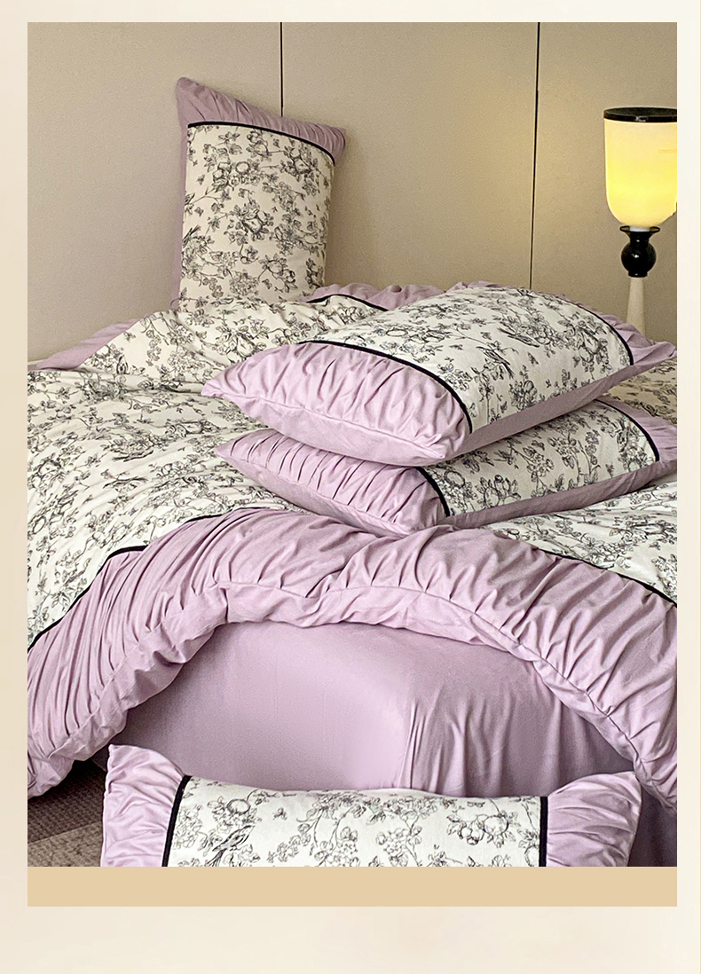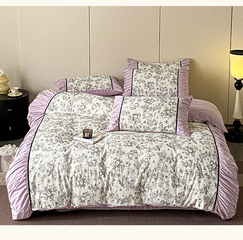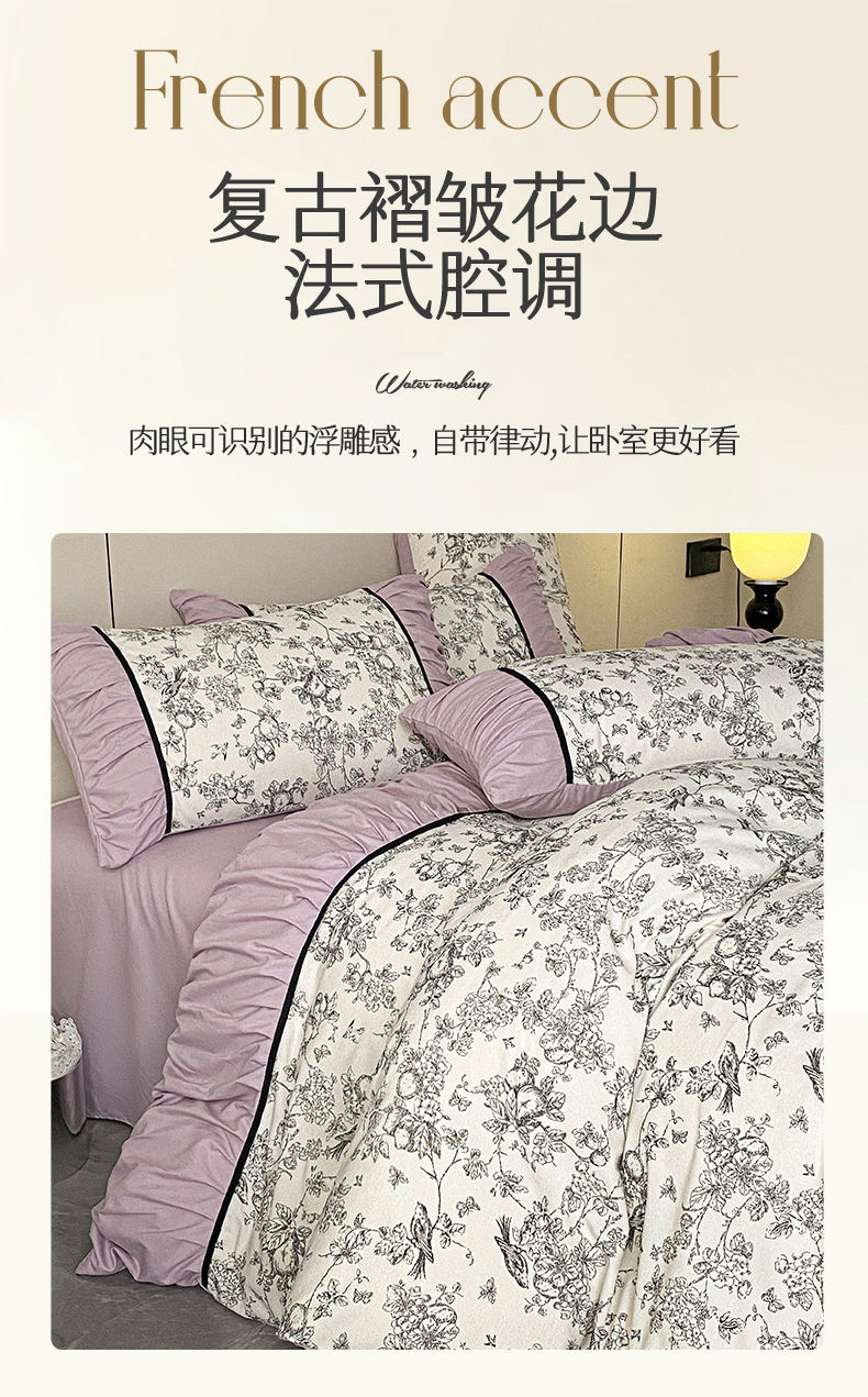 一左一右 2024秋冬新款法式复古印花褶皱花边水洗磨毛四件套-场景一(提供买家秀) 优雅紫