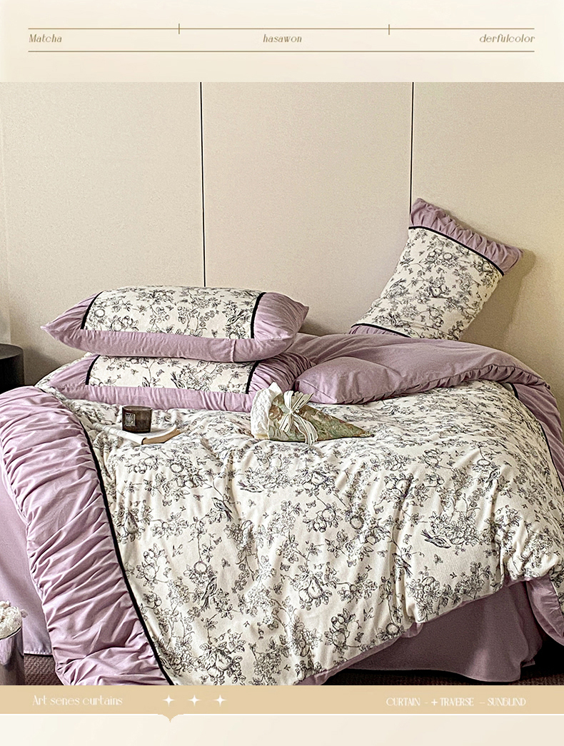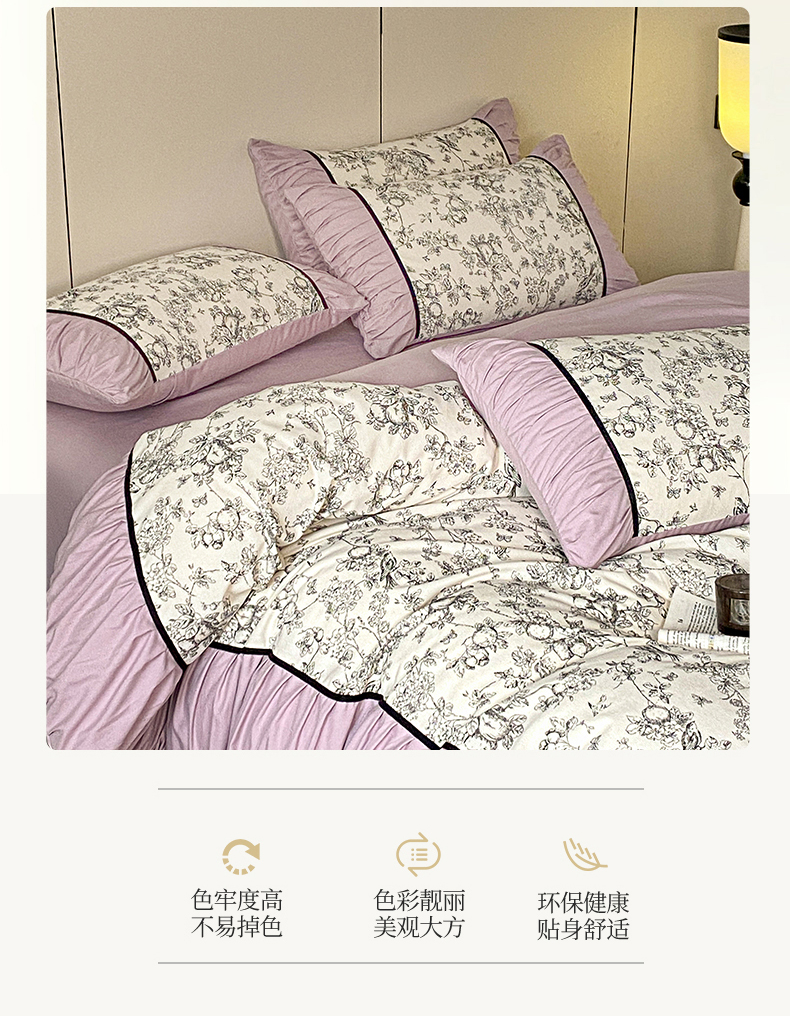 商品名称:一左一右 2024秋冬新款法式复古印花褶皱花边水洗磨毛四件套-场景一(提供买家秀) 优雅紫