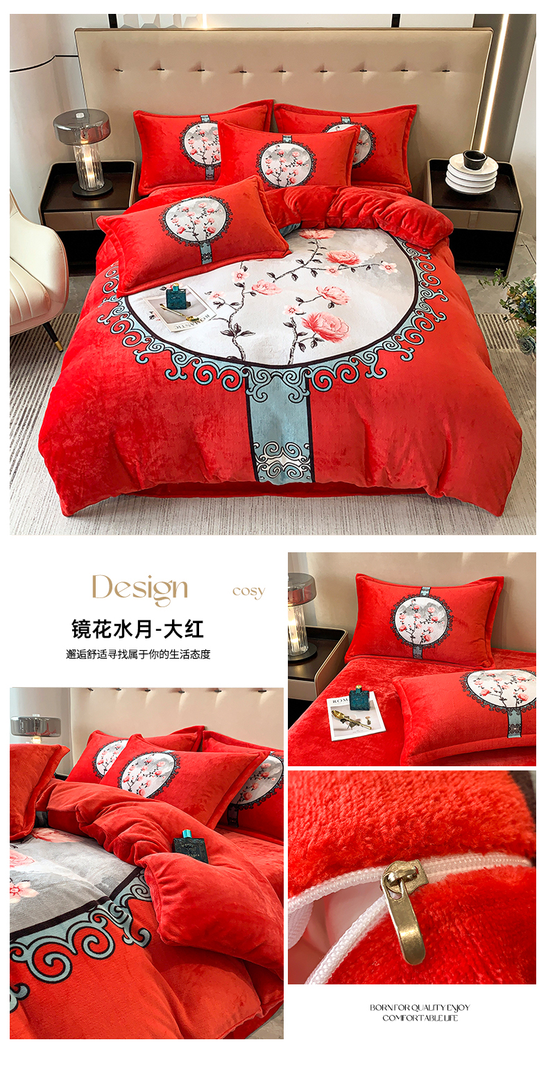 商品名称:喜梦缘 2025新款大版花卉牛奶绒四件套 镜花水月-大红
