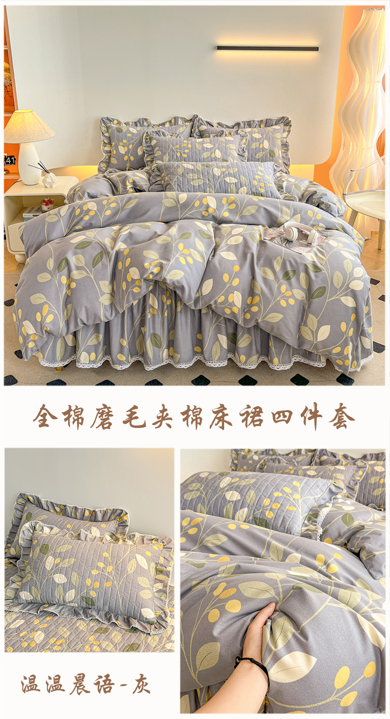 当前位置: 91家纺网 > 商品网购 > 床品套件 > 四件套 > 全棉普通四件套 > 缦彩 (支持一件定制)2024新款全棉夹棉加厚公主风磨毛床裙款四件套纯棉床罩床笠套件 温温晨语-灰