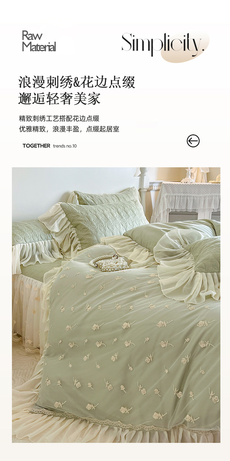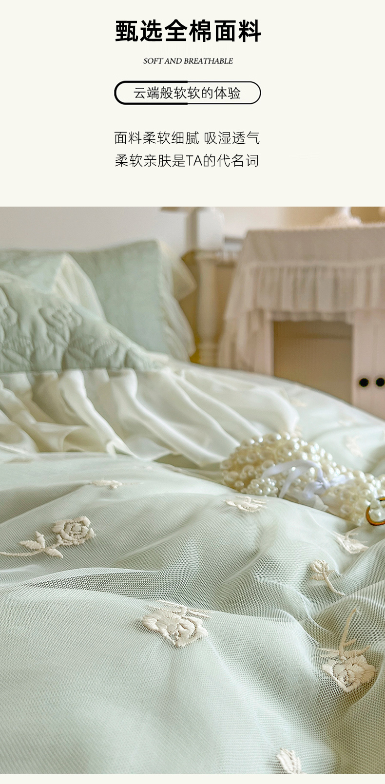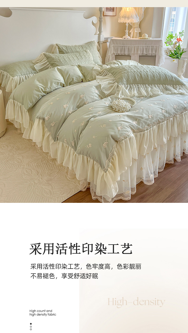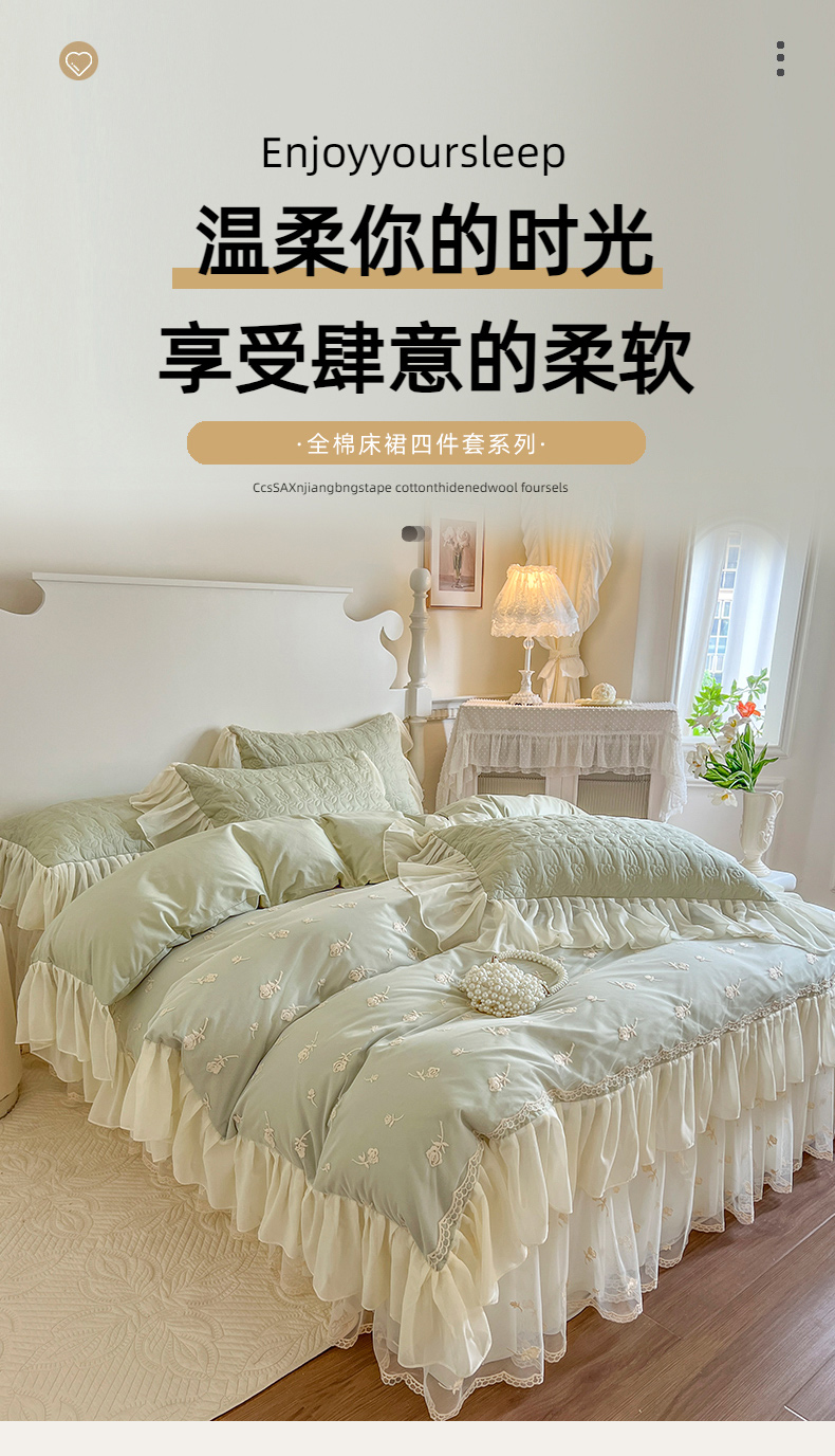 当前位置: 91家纺网 > 商品网购 > 床品套件 > 四件套 > 全棉普通四件套 > 网红馆 2025新款全棉床裙四件套-玫瑰花园 麦绿