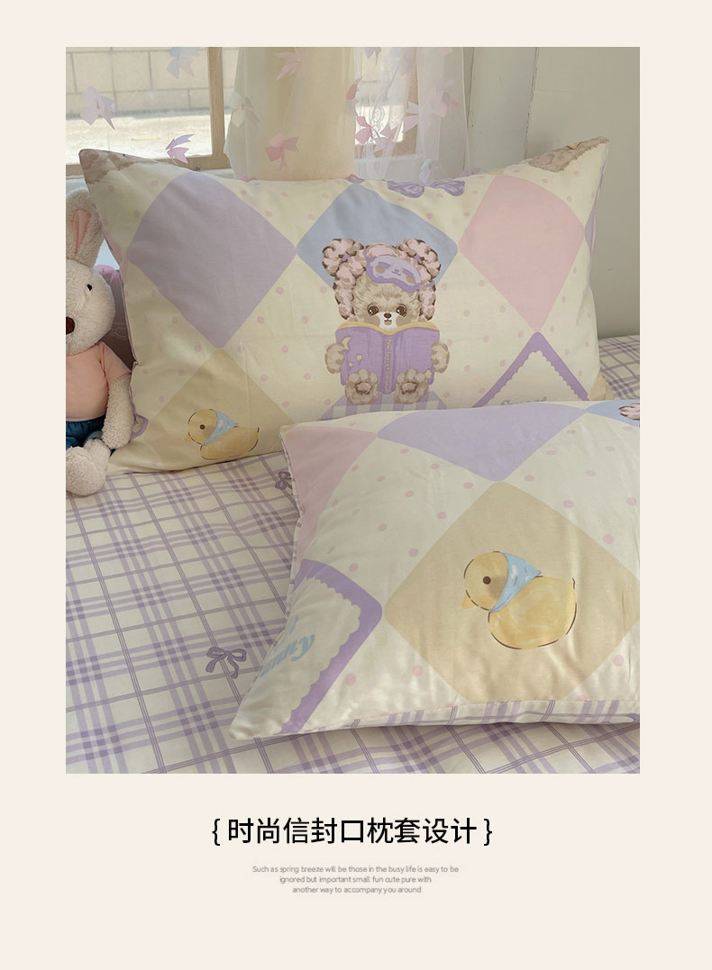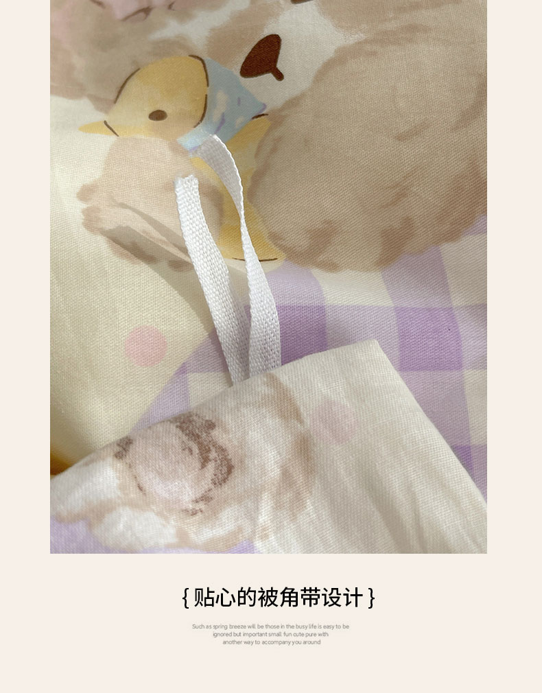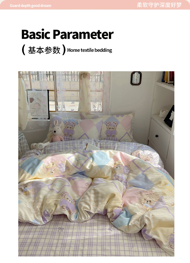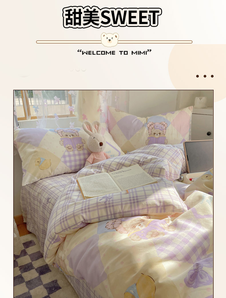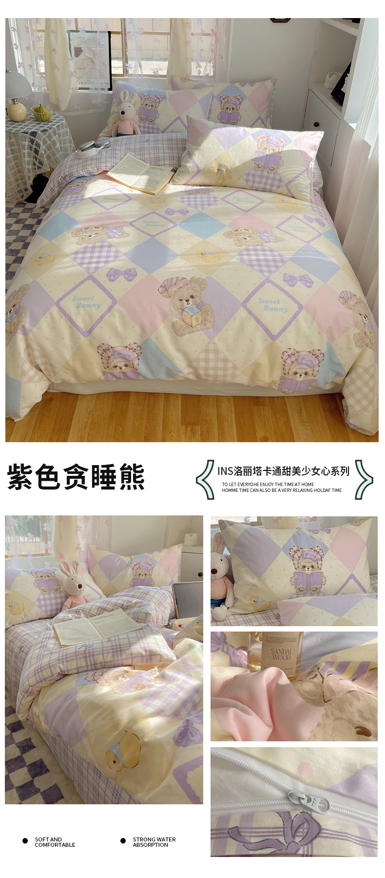 商品名称:六巷胡同 2024新款40支全棉纯棉INS洛丽塔卡通甜美少女心系列四件套 紫色贪睡熊