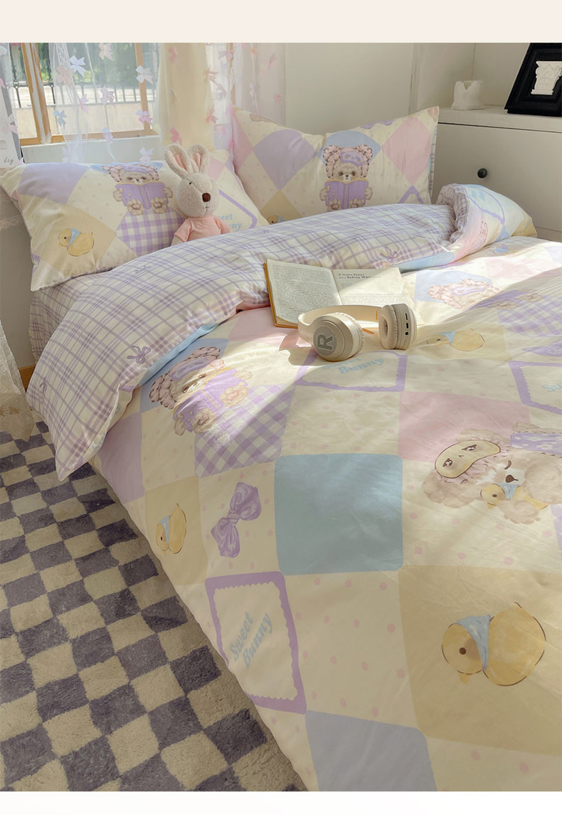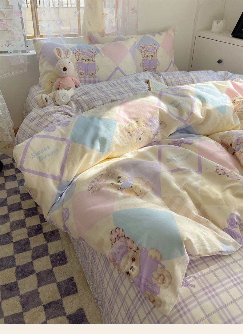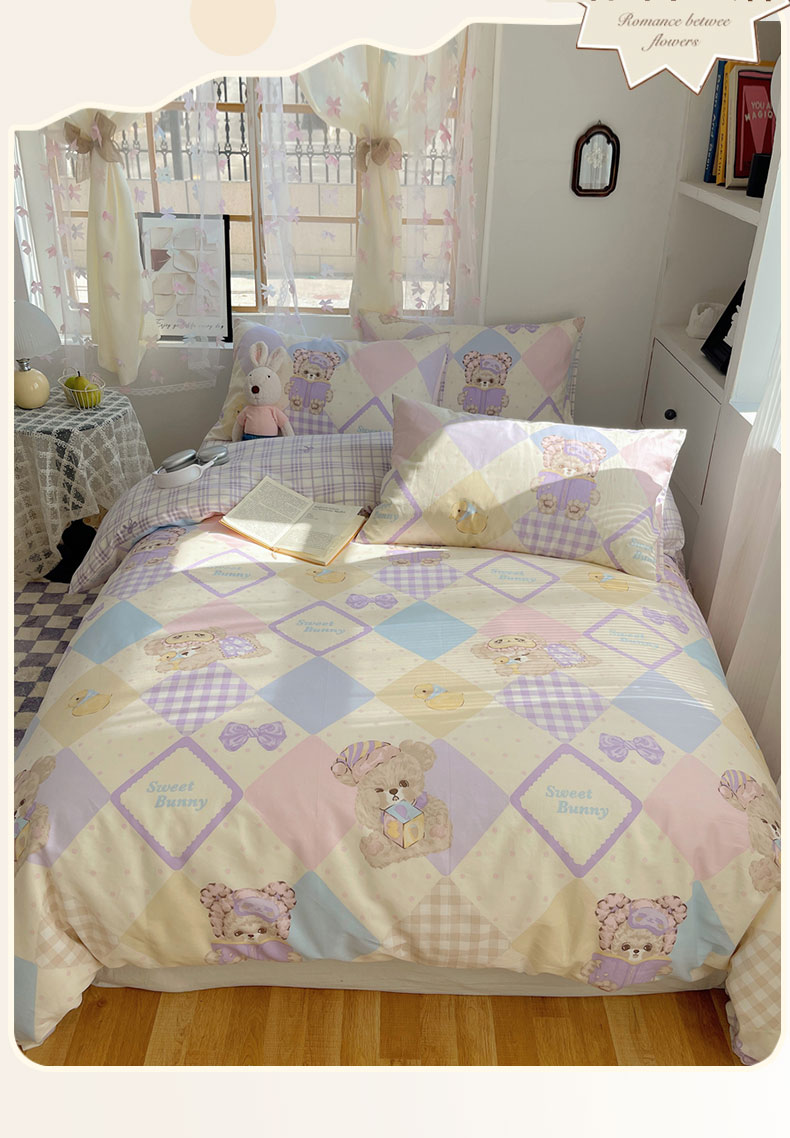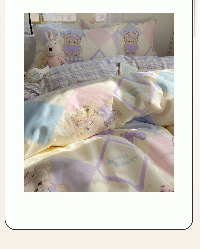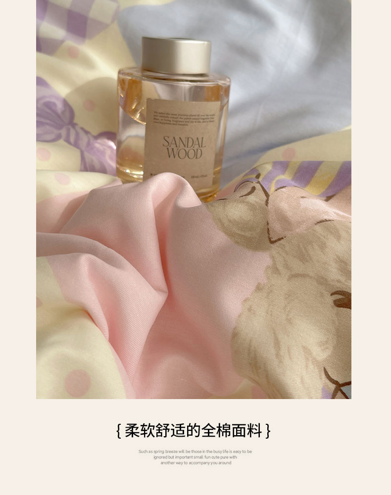 商品名称:六巷胡同 2024新款40支全棉纯棉INS洛丽塔卡通甜美少女心系列四件套 紫色贪睡熊