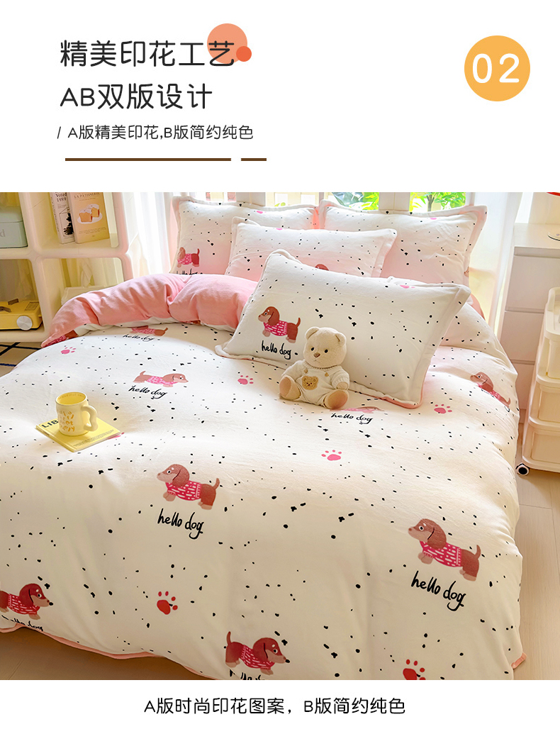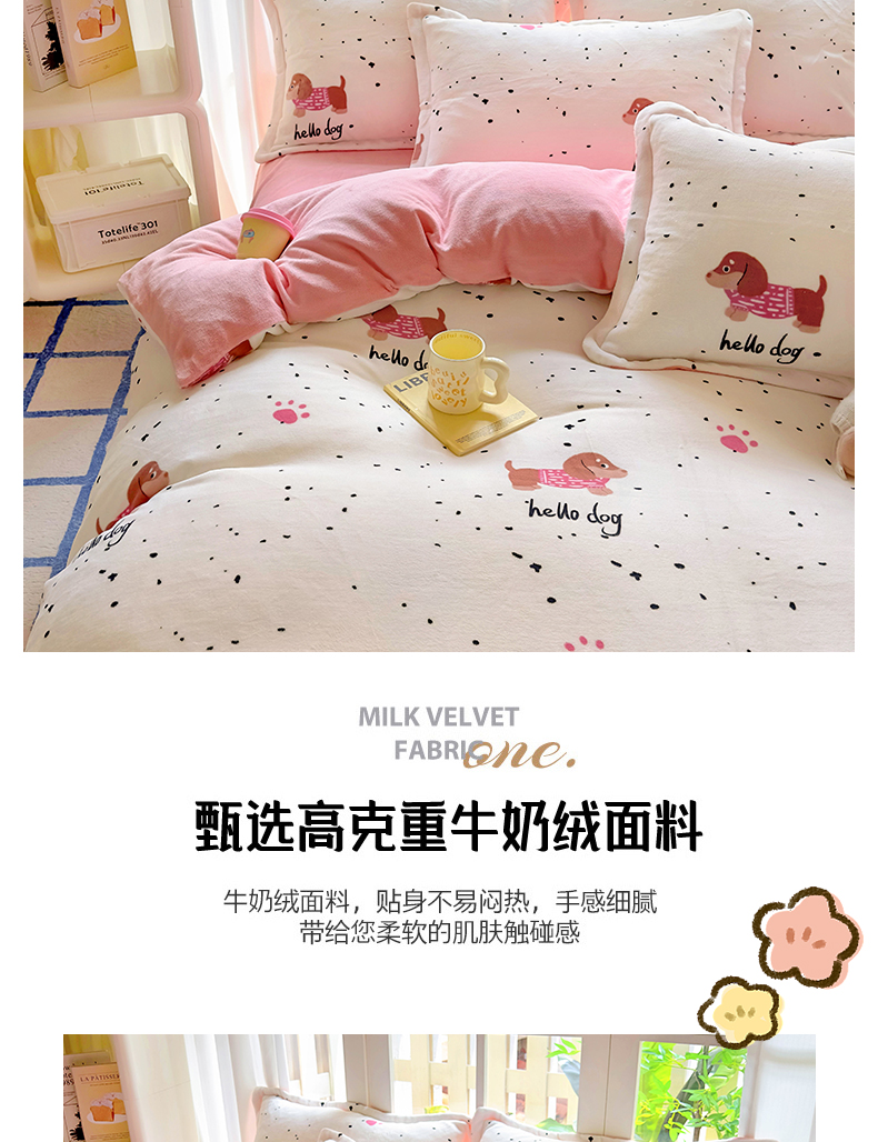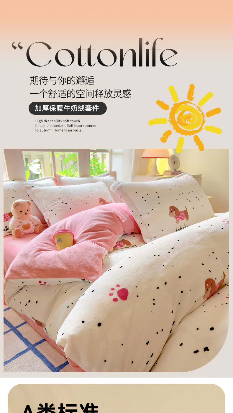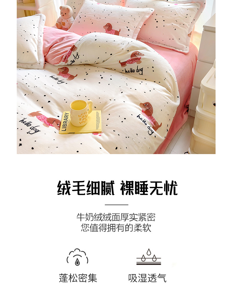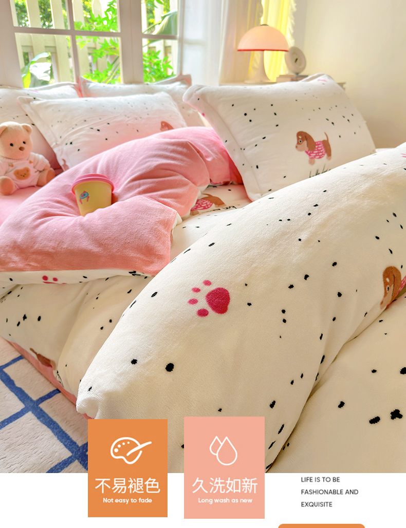 当前位置: 91家纺网 > 商品网购 > 床品套件 > 四件套 > 牛奶绒四件套 > 百寐 2024新款加厚A类牛奶绒印花卡通床单床笠四件套三件套 点点狗