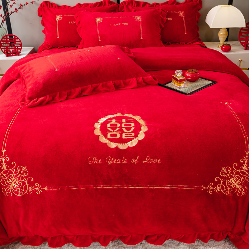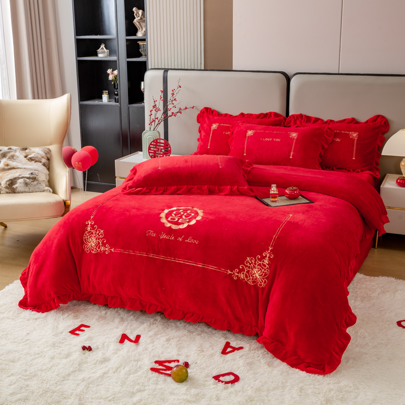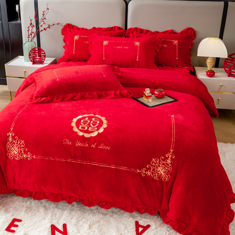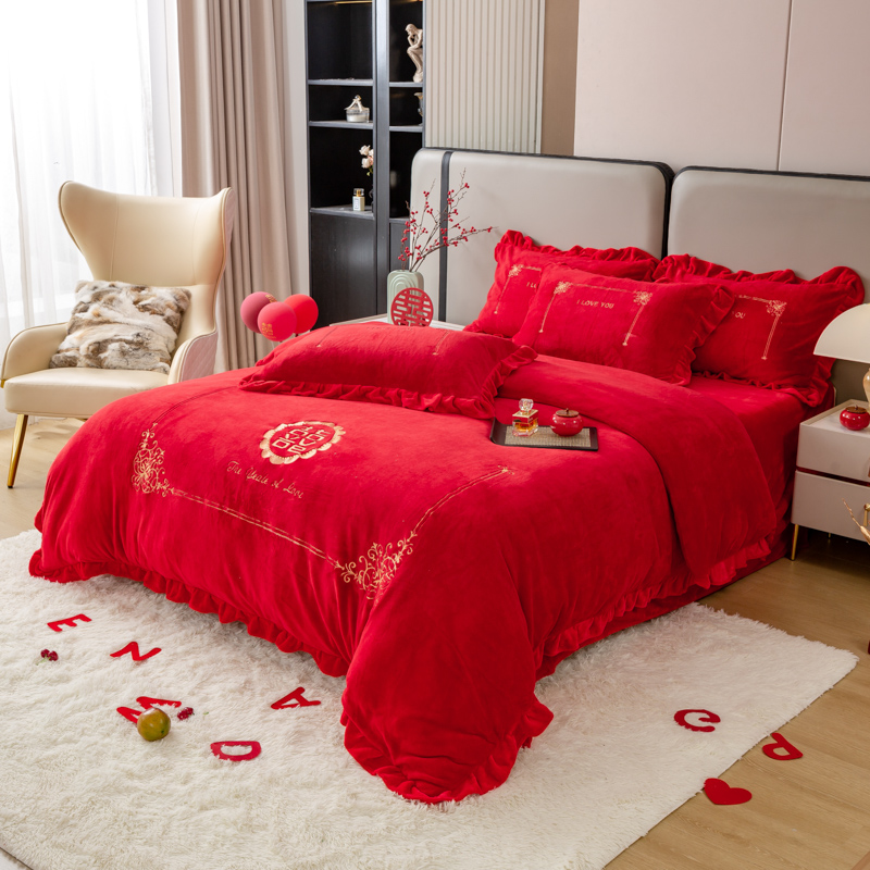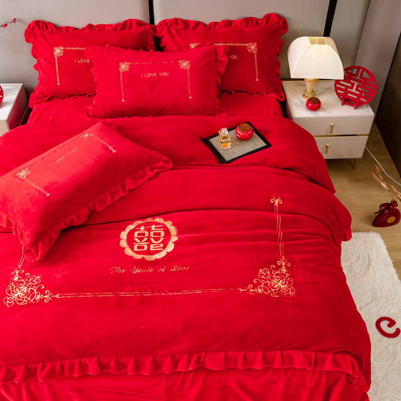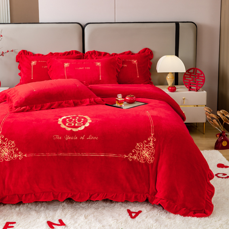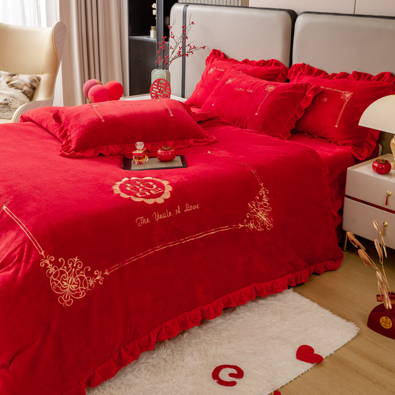 银石 2024新款秋冬230克全消光牛奶绒大红四件套喜结良缘