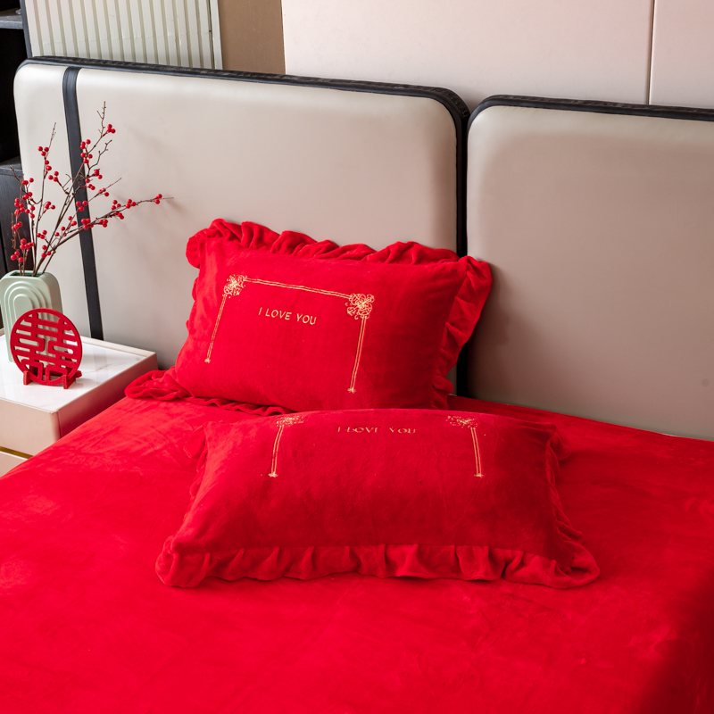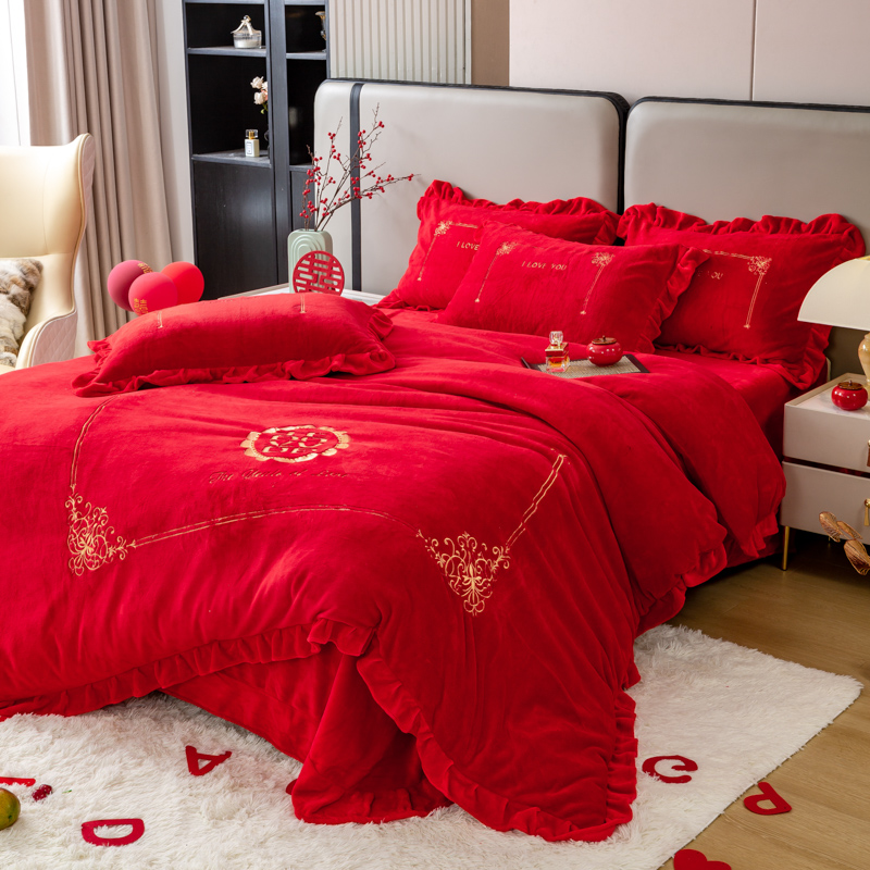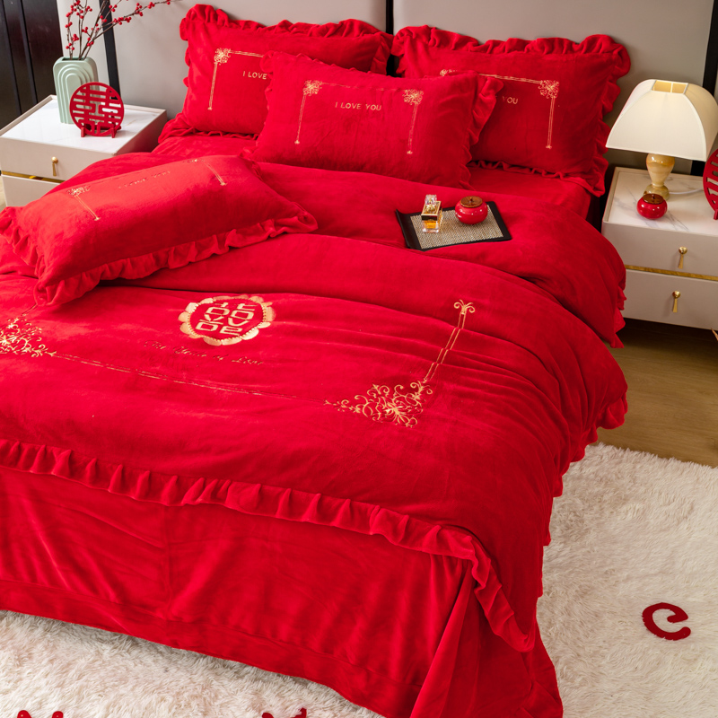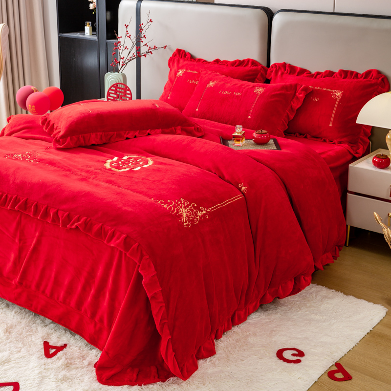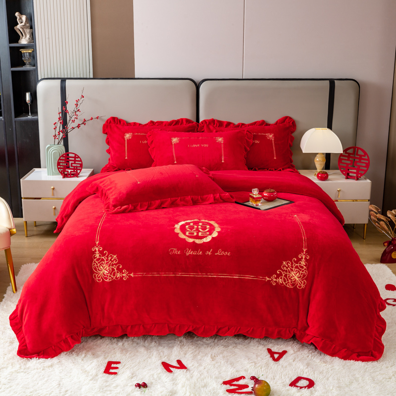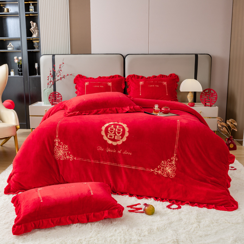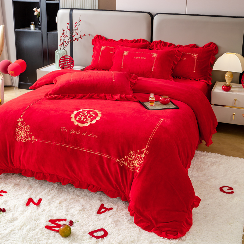 银石 2024新款秋冬230克全消光牛奶绒大红四件套喜结良缘