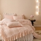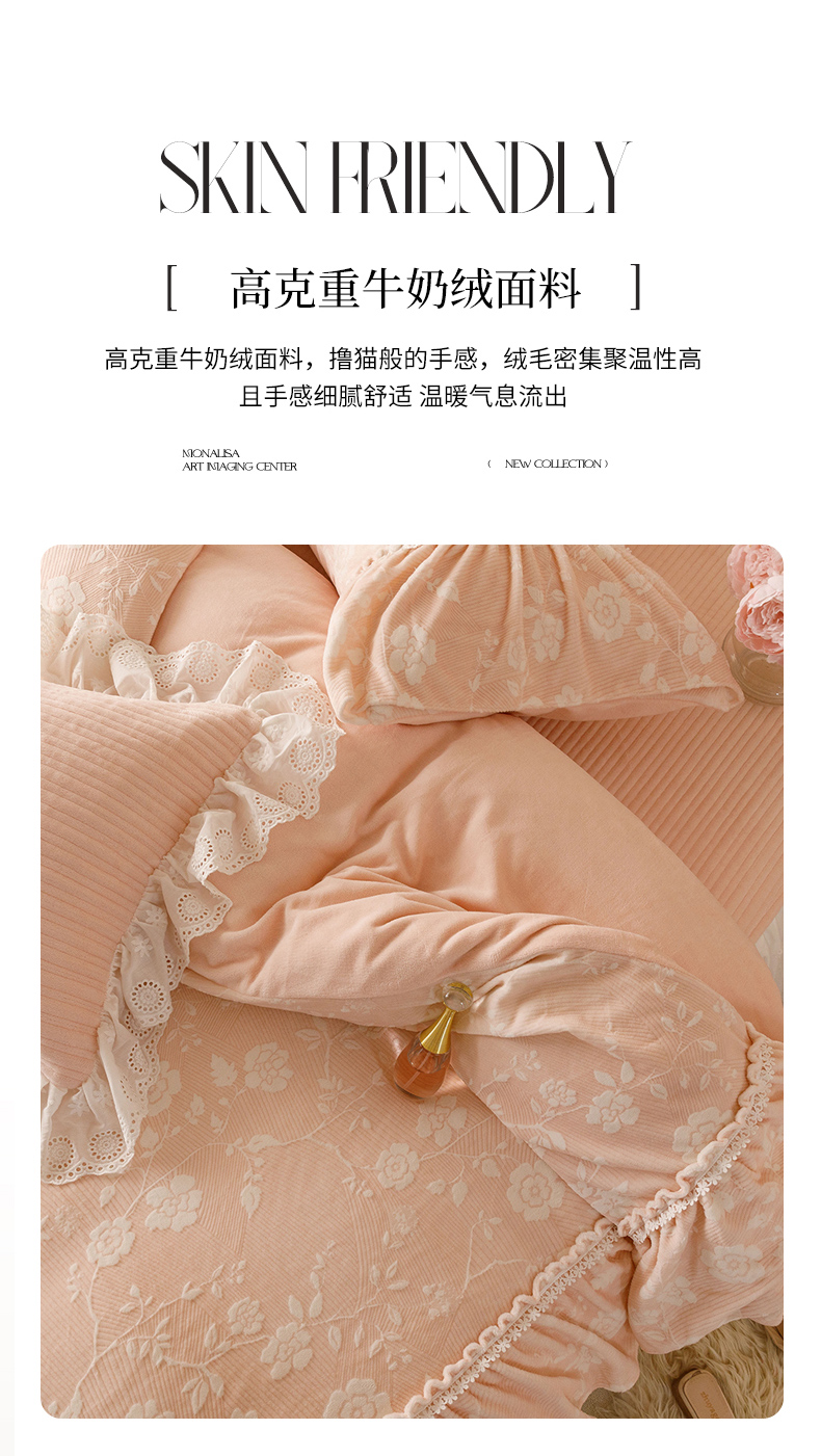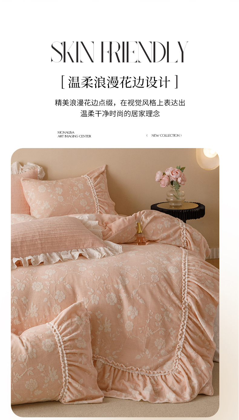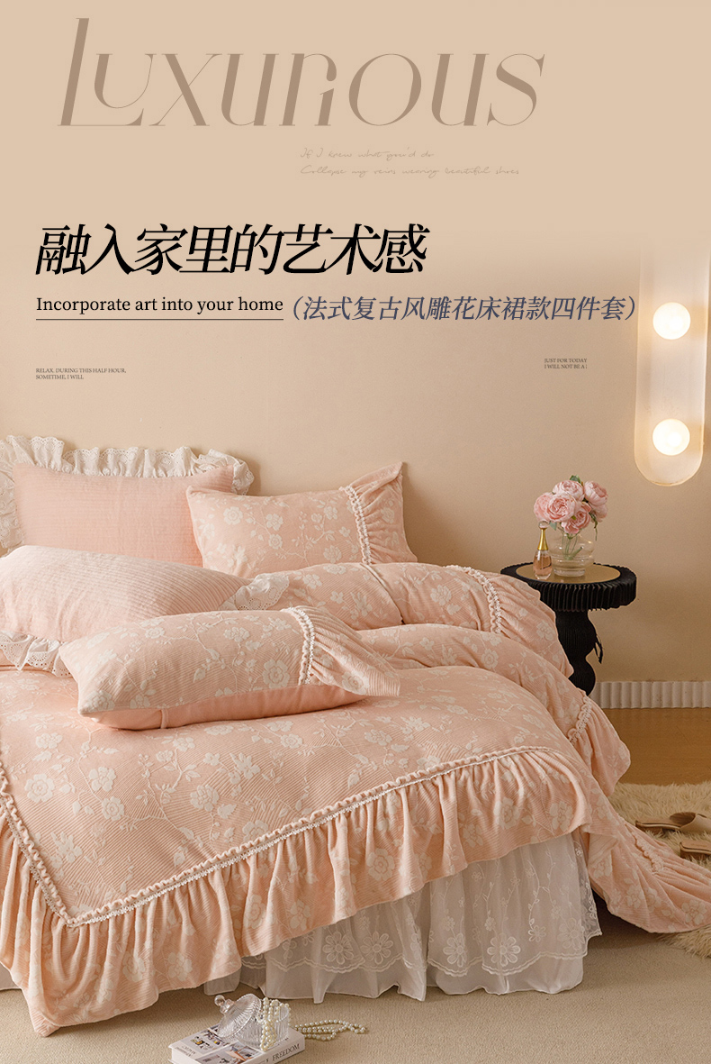 胜权家纺 2024秋冬新款5D雕花着色牛奶绒法式奶油风夹棉床裙四件套 蜜粉