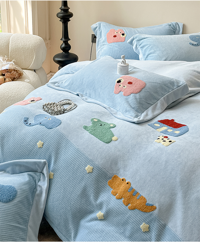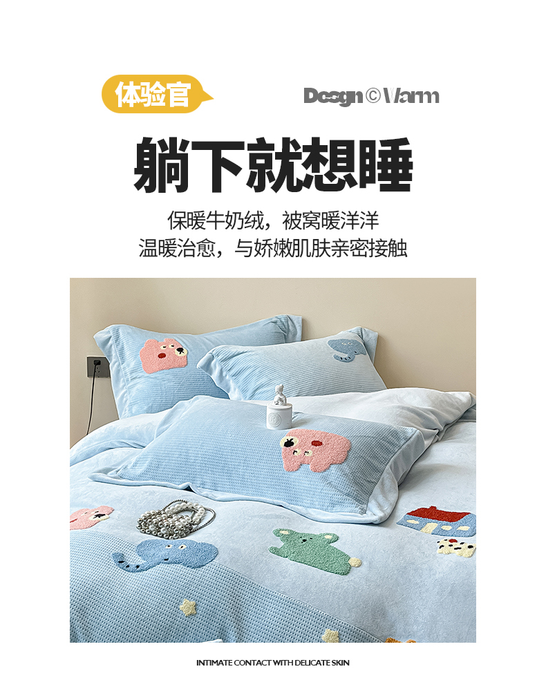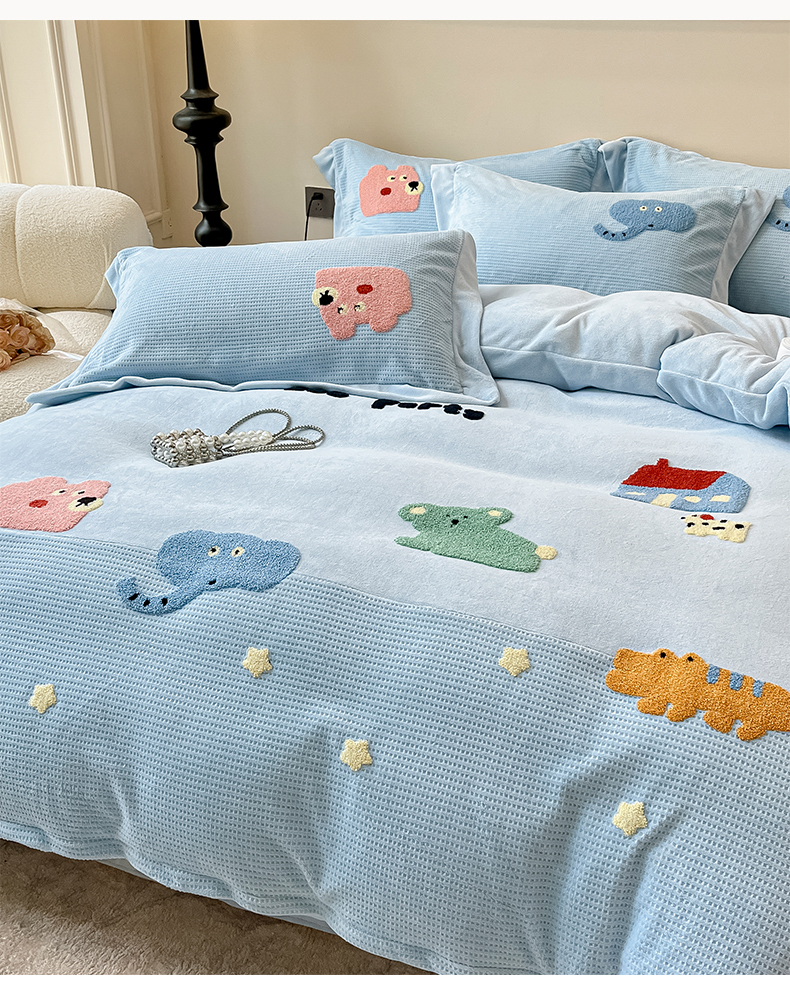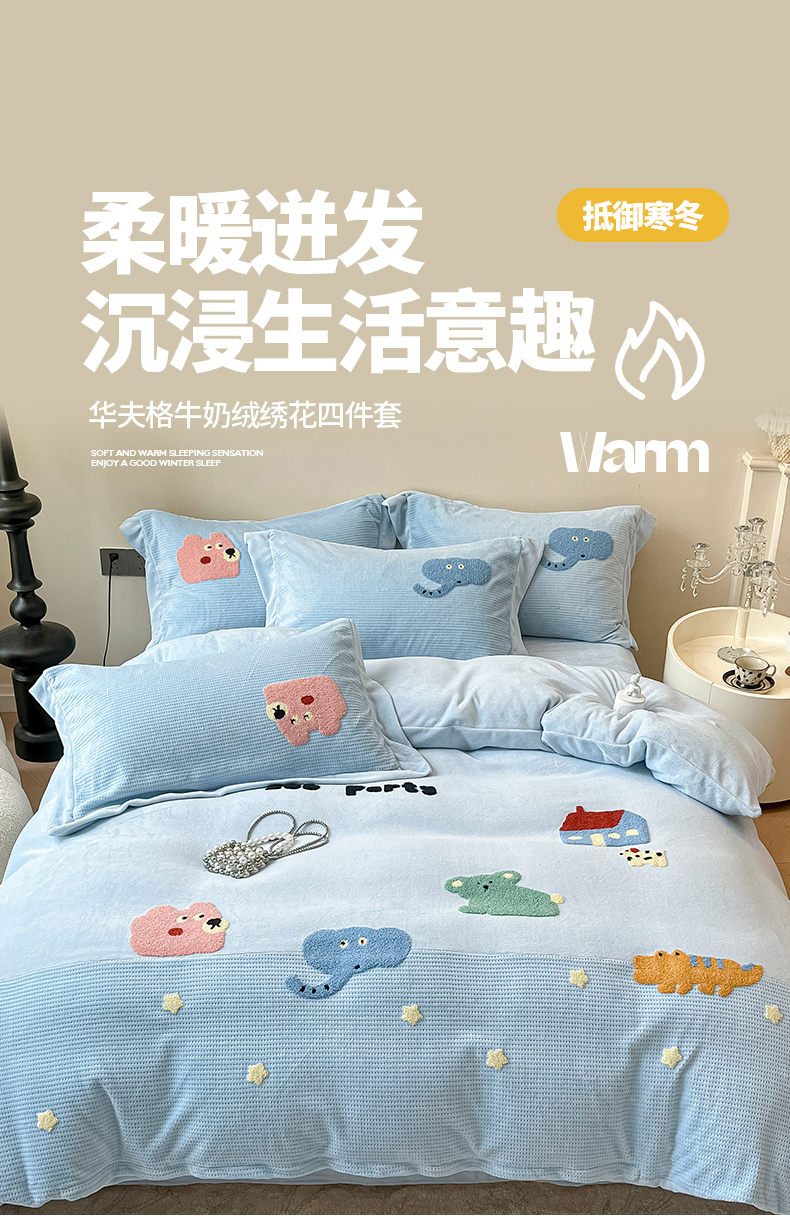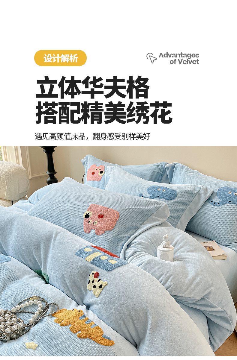 商品名称:典曼家纺 2024新款【华夫格绣花】牛奶绒四件套 奇趣乐园