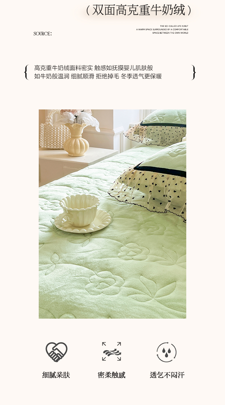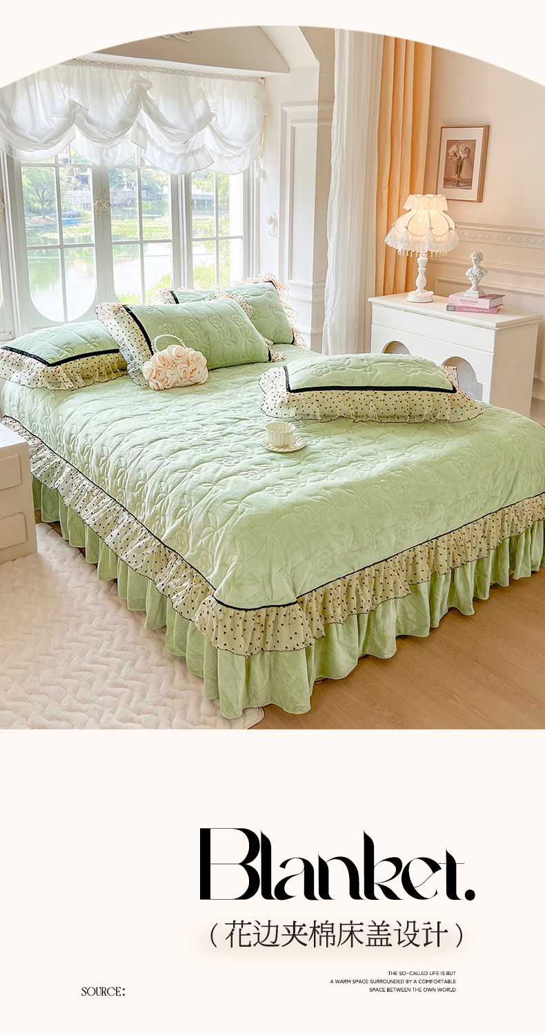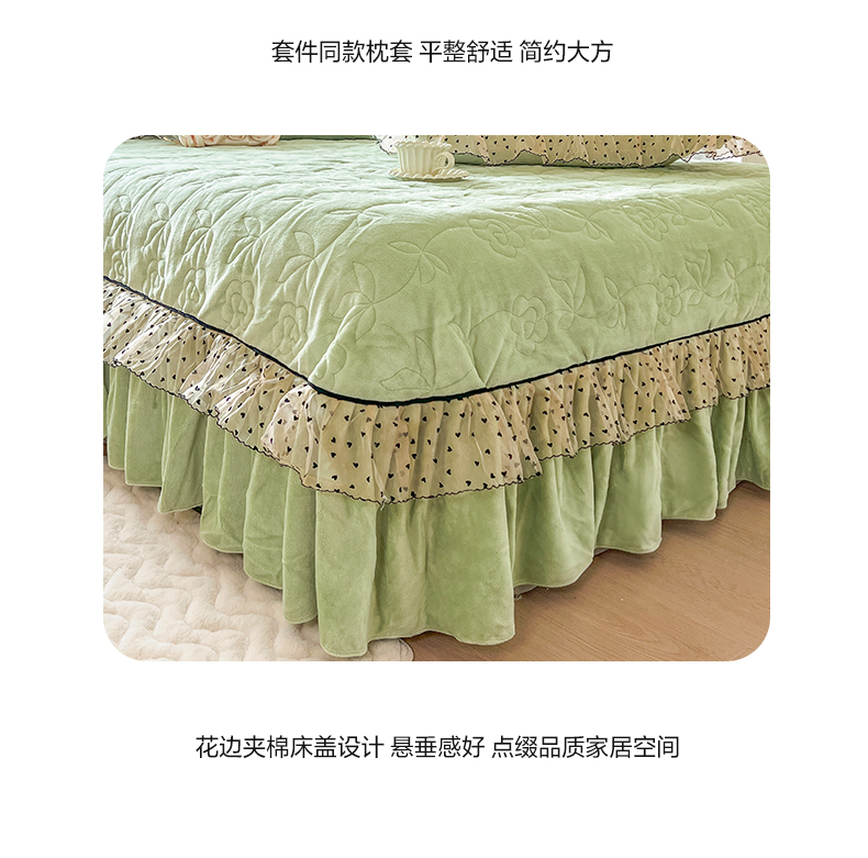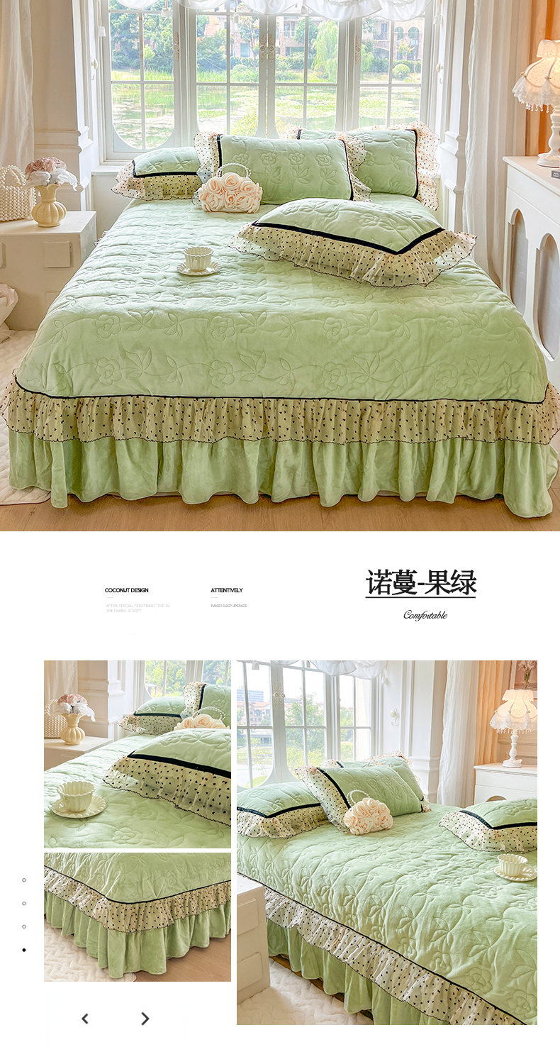商品名称:网红馆(ck家纺) 2025新款牛奶绒花边床盖三件套-诺蔓 诺蔓-果绿
