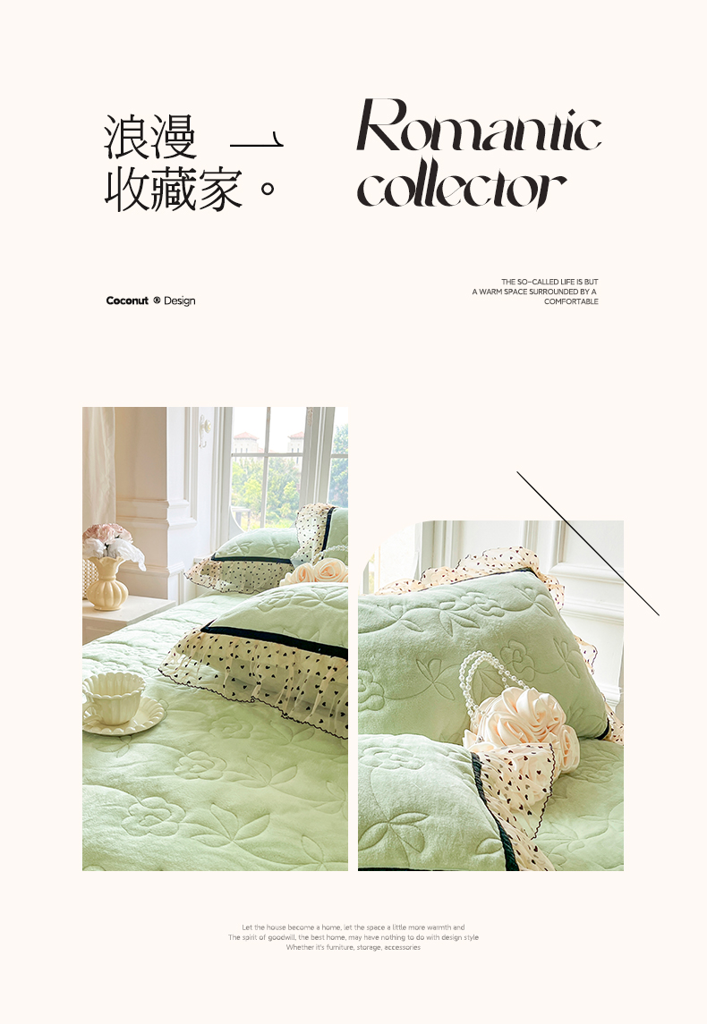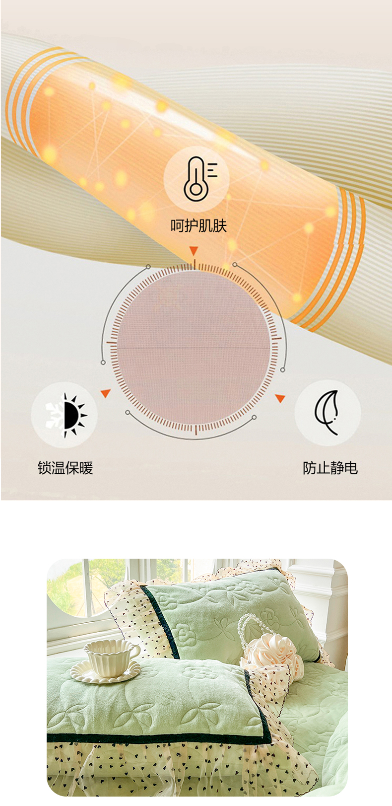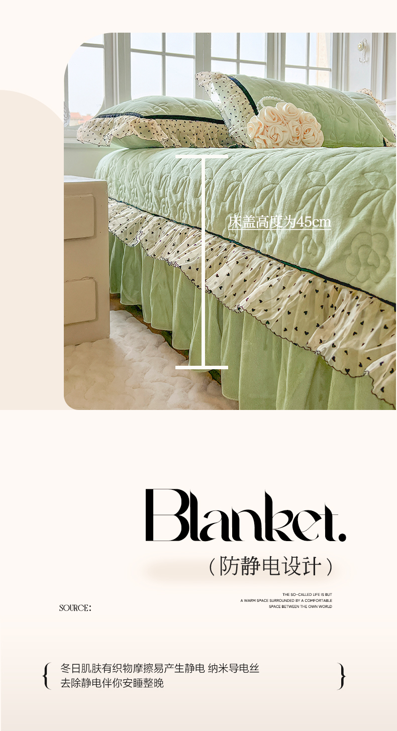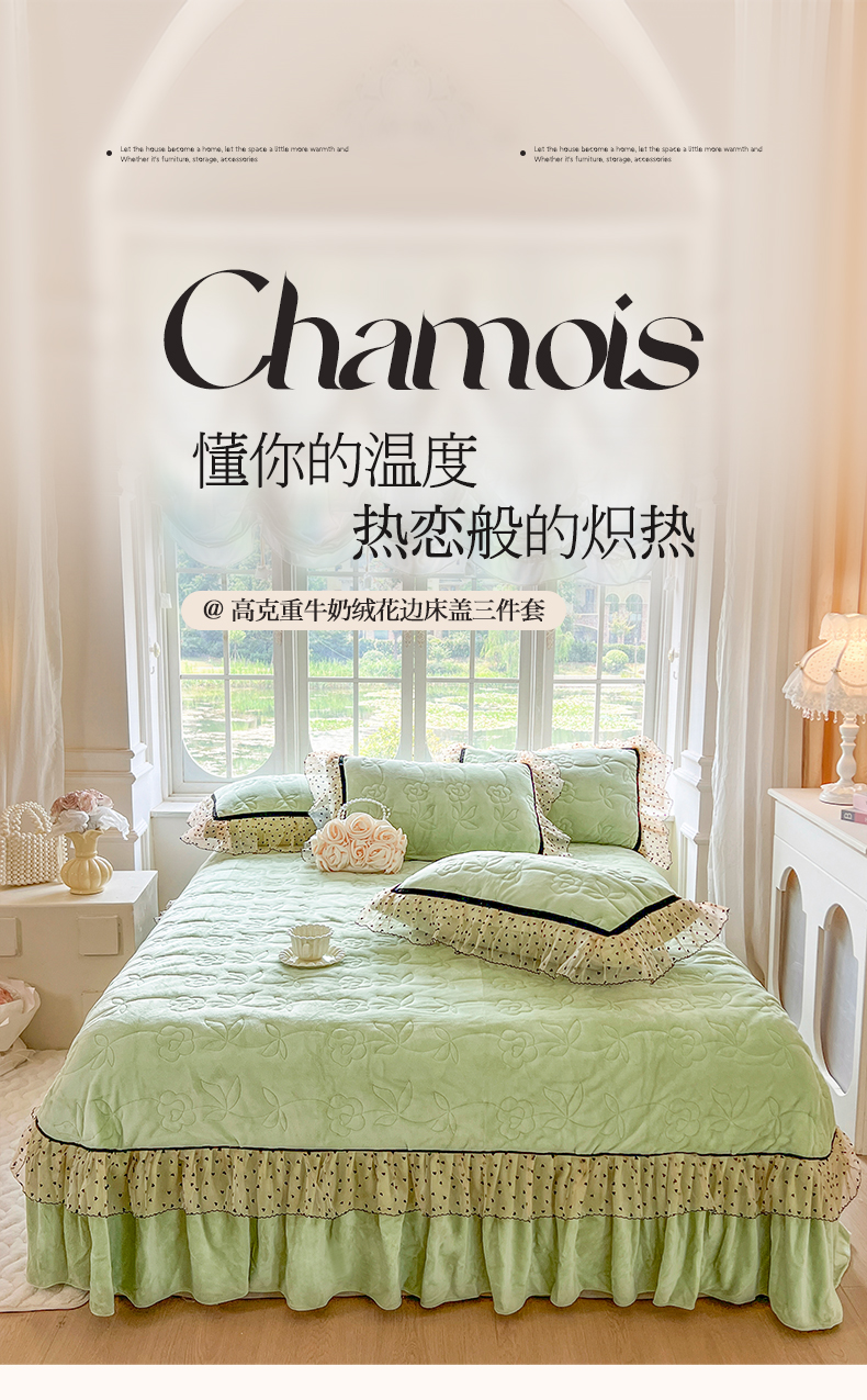商品名称:网红馆(ck家纺) 2025新款牛奶绒花边床盖三件套-诺蔓 诺蔓-果绿
