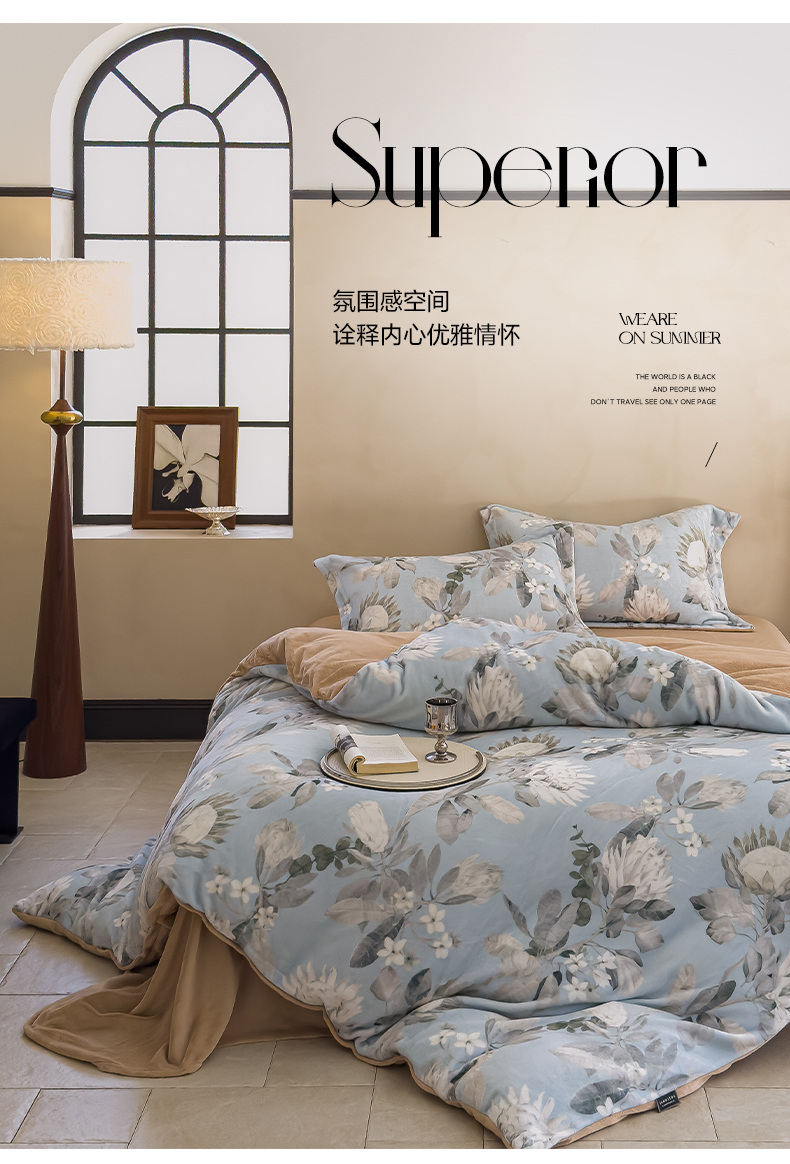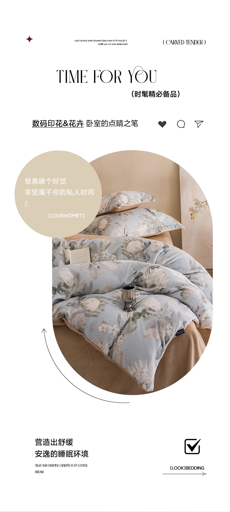 商品名称:三味舒屋 2024新款小清新数码印花牛奶绒四件套-花艺系列 兰亭
