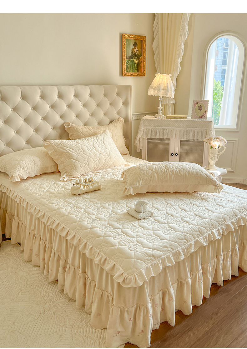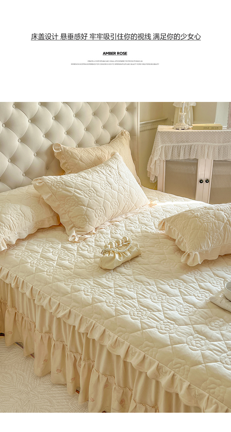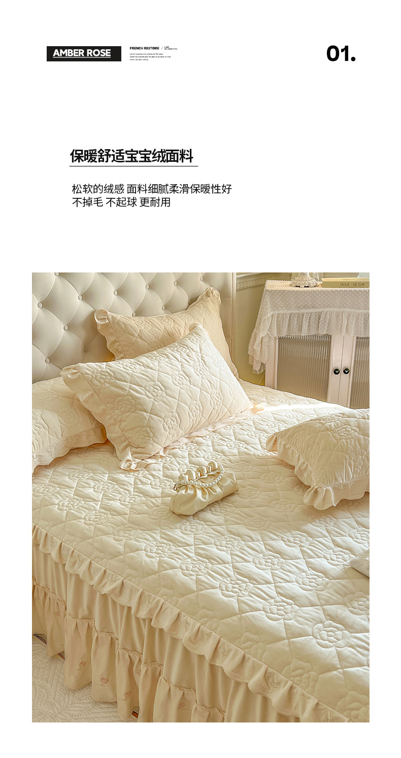 商品名称:网红馆(ck家纺) 2025新款高克重加厚保暖时尚花边宝宝绒乐伊系列床裙三件套 乐伊-米