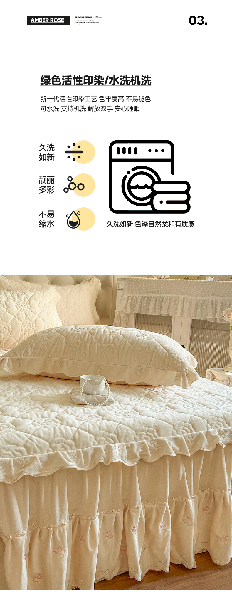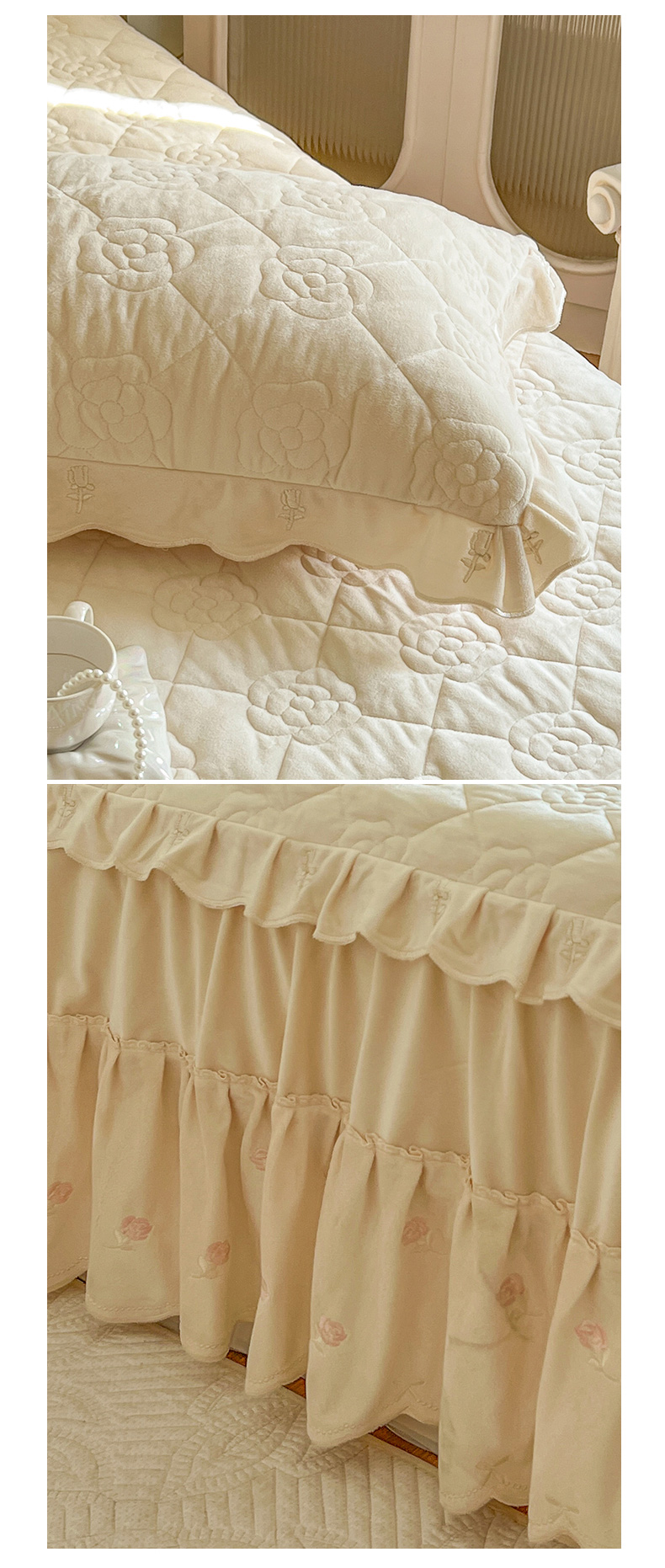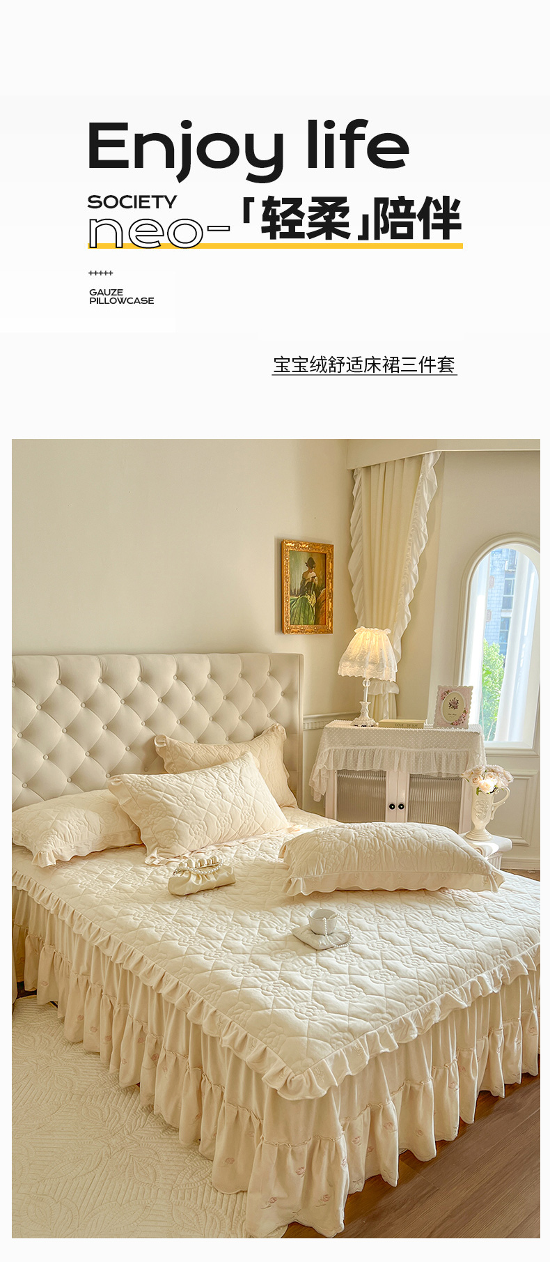 商品名称:网红馆(ck家纺) 2025新款高克重加厚保暖时尚花边宝宝绒乐伊系列床裙三件套 乐伊-米