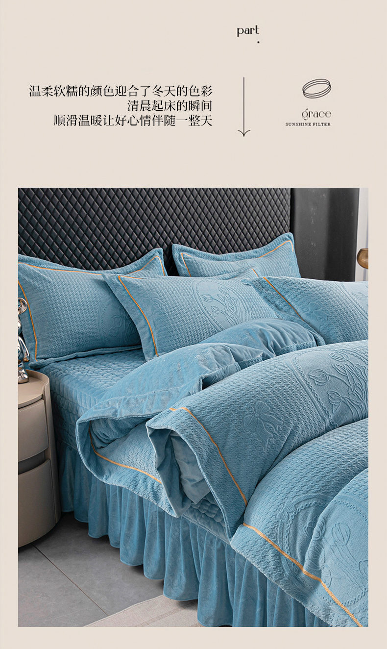 畅畅家纺 2024新款11斤加厚冬季轻奢款230克全消光立体雕花牛奶绒夹棉床盖四件套 轻奢花语-蓝色