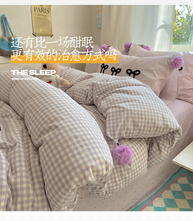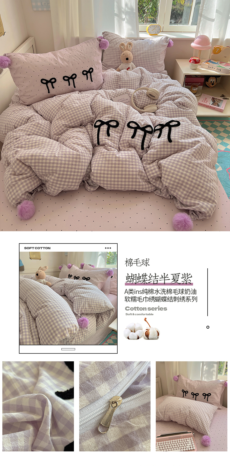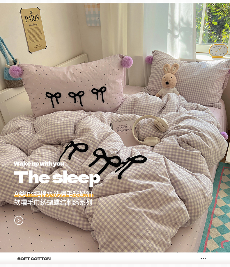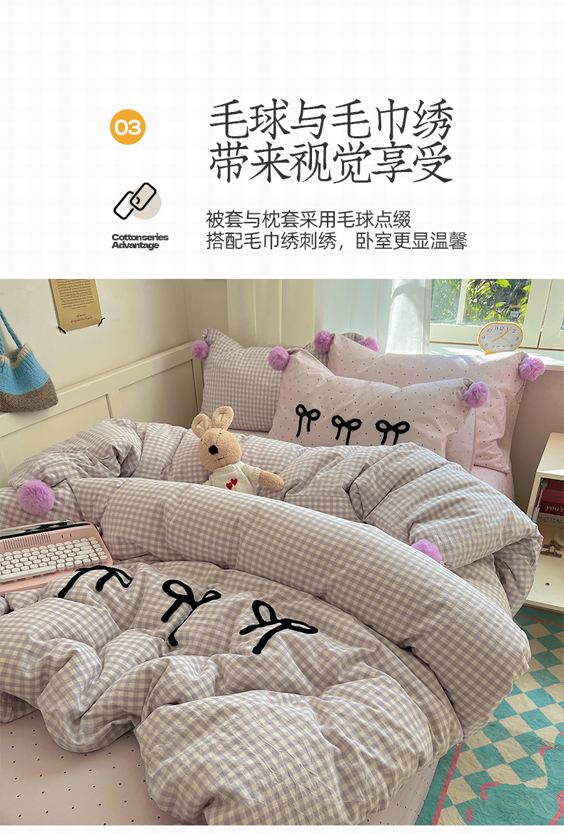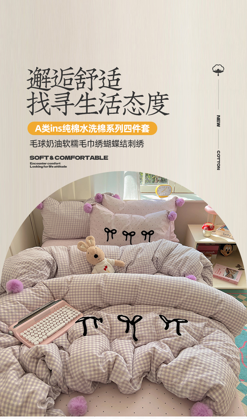 当前位置: 91家纺网 > 商品网购 > 床品套件 > 四件套 > 水洗棉四件套 > 桃子家居 2025新款A类ins纯棉水洗棉毛球奶油软糯毛巾绣蝴蝶结刺绣系列四件套 棉毛球-蝴蝶结半夏紫