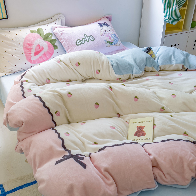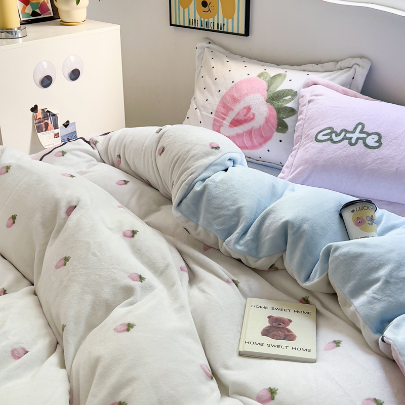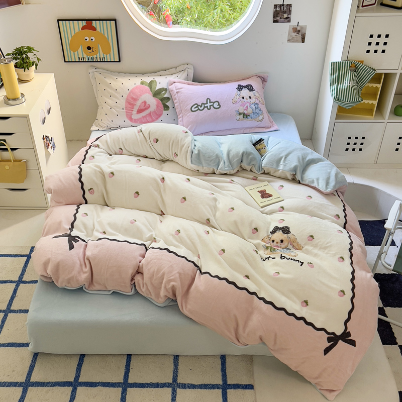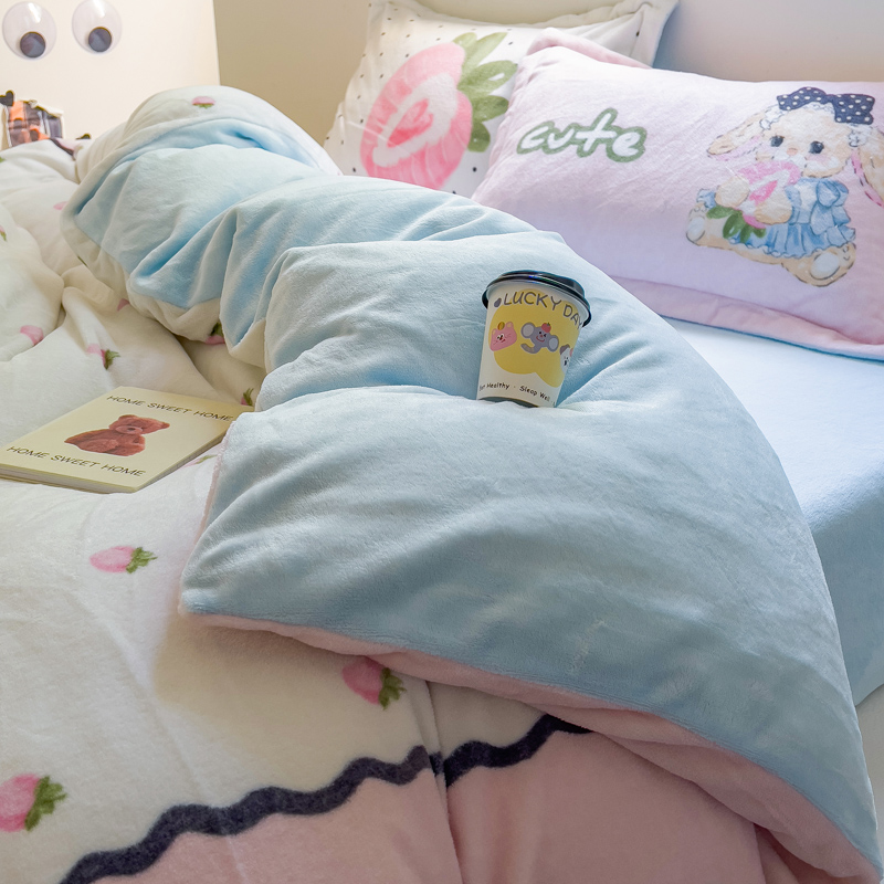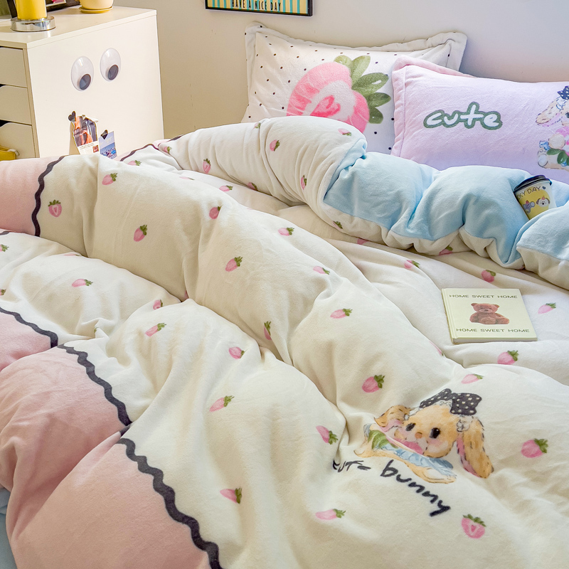 当前位置: 91家纺网 > 商品网购 > 床品套件 > 四件套 > 牛奶绒四件套 > (买家秀 爆款不断货)A类母婴级双面牛奶绒珊瑚绒雪花绒四件套AB版高克重卡通牛奶绒四件套花卉-场景2 草莓小兔