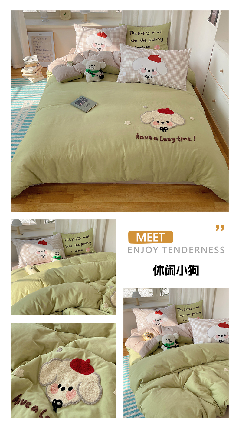 商品名称:美乐迪家纺 2025新款休闲风系列全棉毛巾绣四件套 休闲小狗