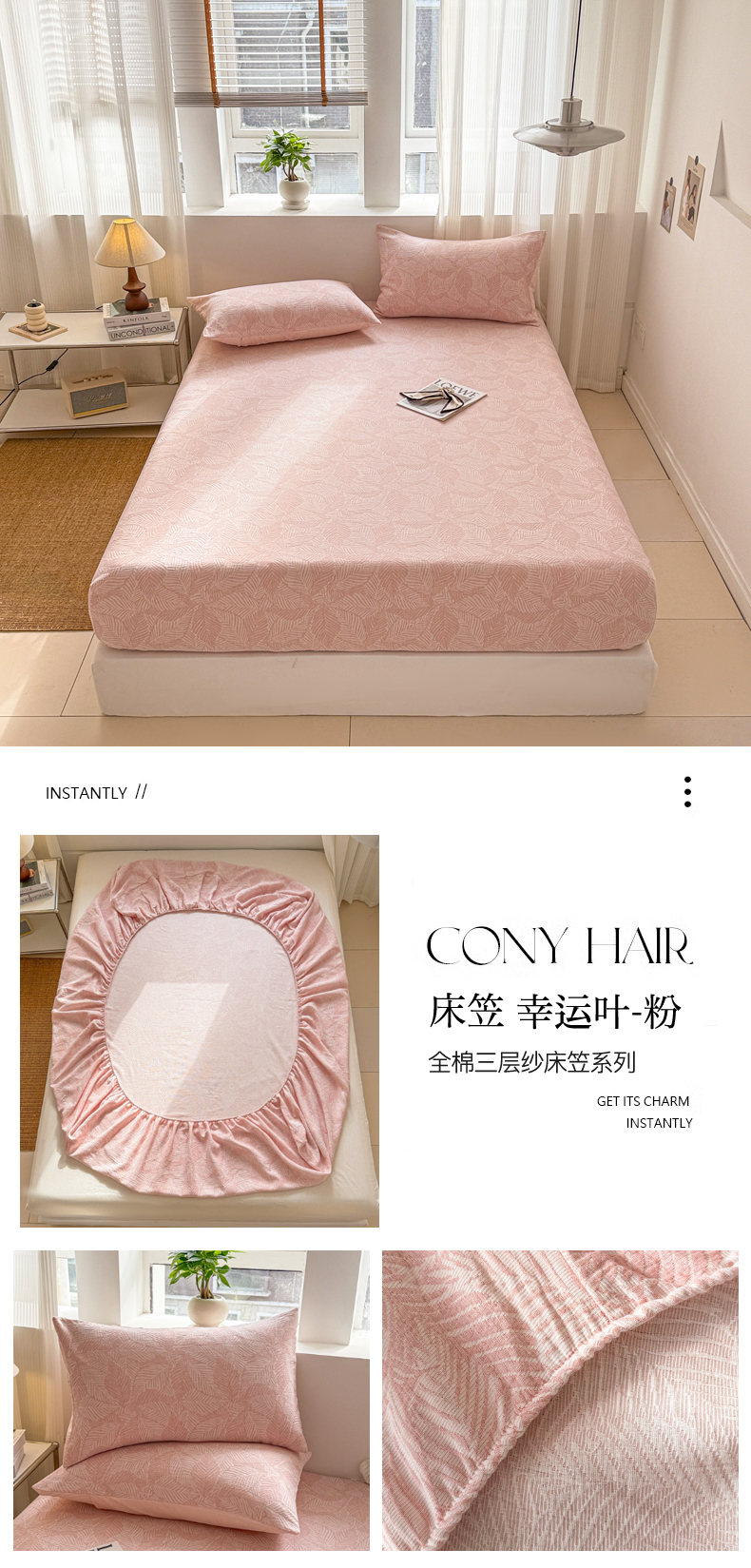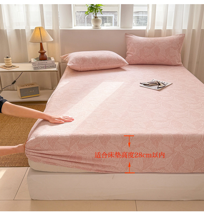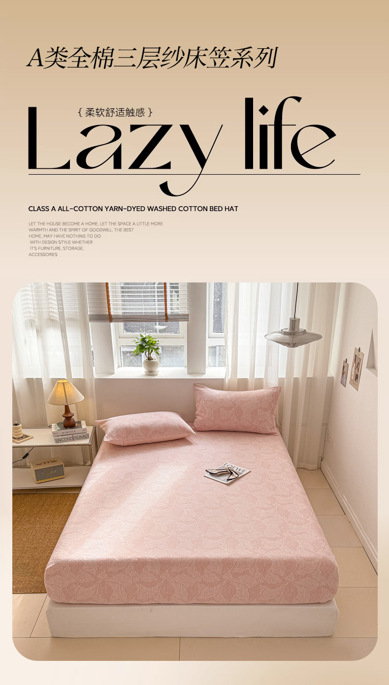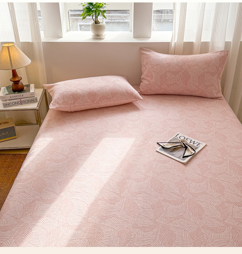 • 91家纺网 家纺一手货源 找家纺 眠博士 2025新款AB版简约时尚A类全棉三层纱系列单床笠 三层纱单床笠-幸运叶-粉