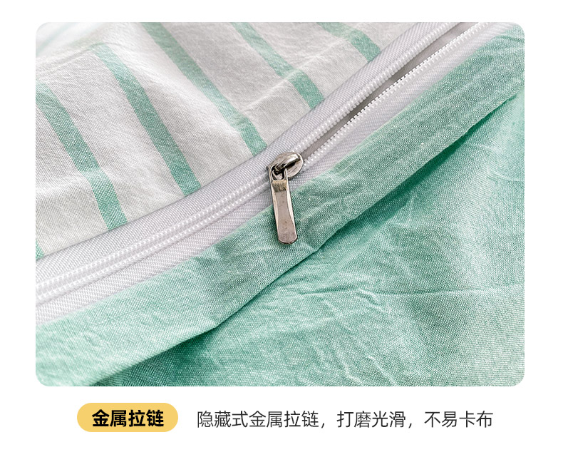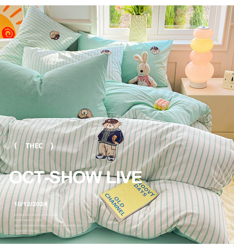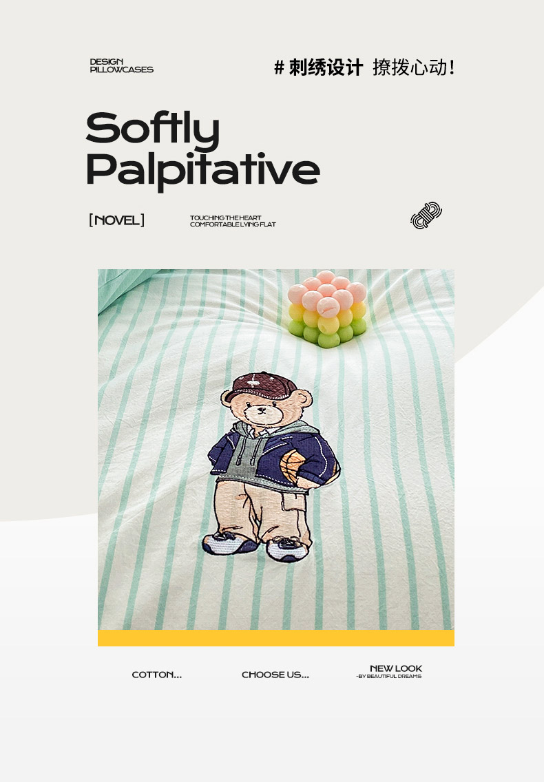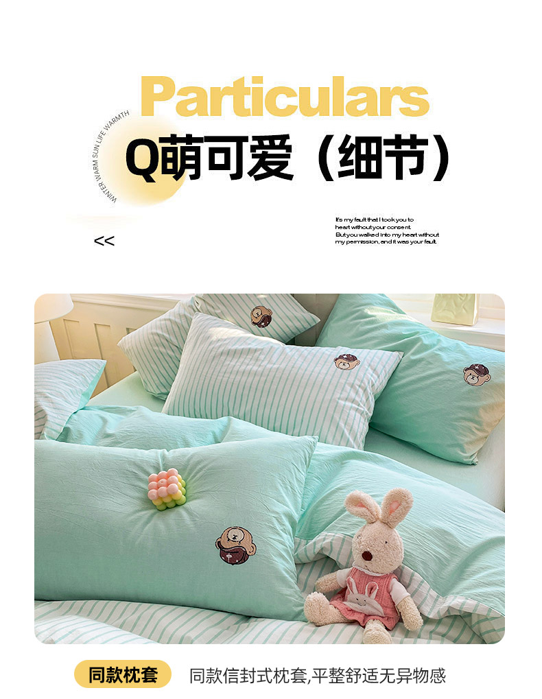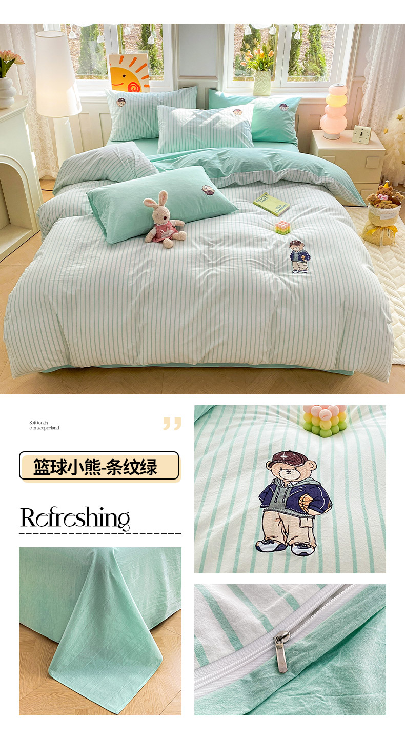 商品名称:大境 2026新款色织全棉水洗棉刺绣四件套小清新纯棉四件套 篮球小熊-条纹绿