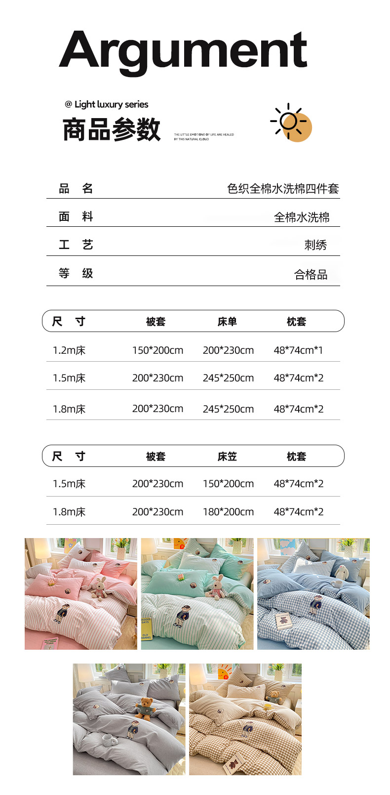 (总)大境 2026新款色织全棉水洗棉刺绣四件套小清新纯棉四件套,篮球小熊-格子咖,篮球小熊-格子蓝,篮球小熊-条纹粉,篮球小熊-条纹绿,篮球小熊-细条灰
