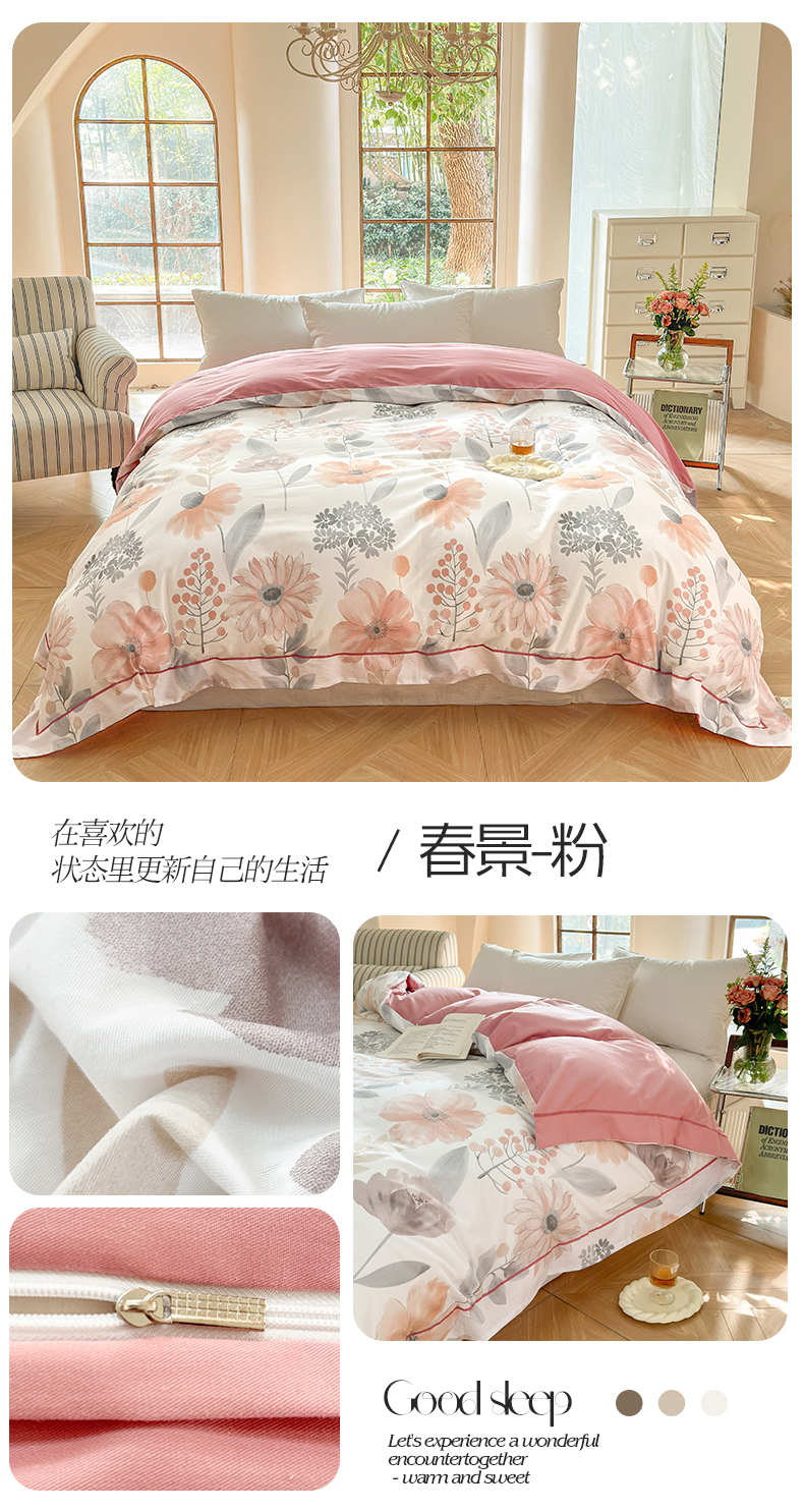7V 2025全棉被套133*76纯棉轻奢宽边单被套喷气长绒棉面料 春景-粉
