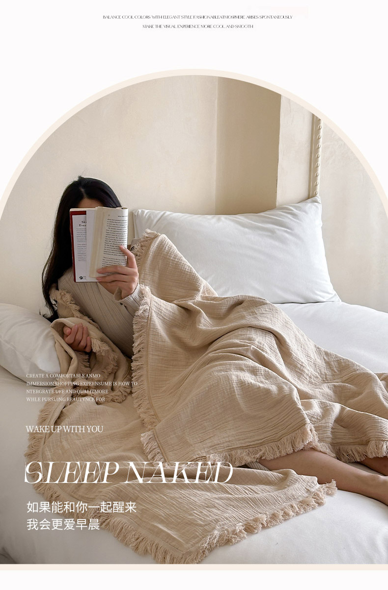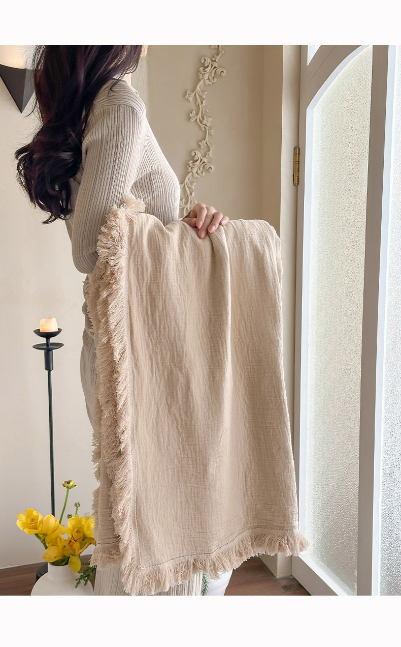 三朵 2025新款全棉四层绉绉纱流苏多功能毯 卡布奇诺